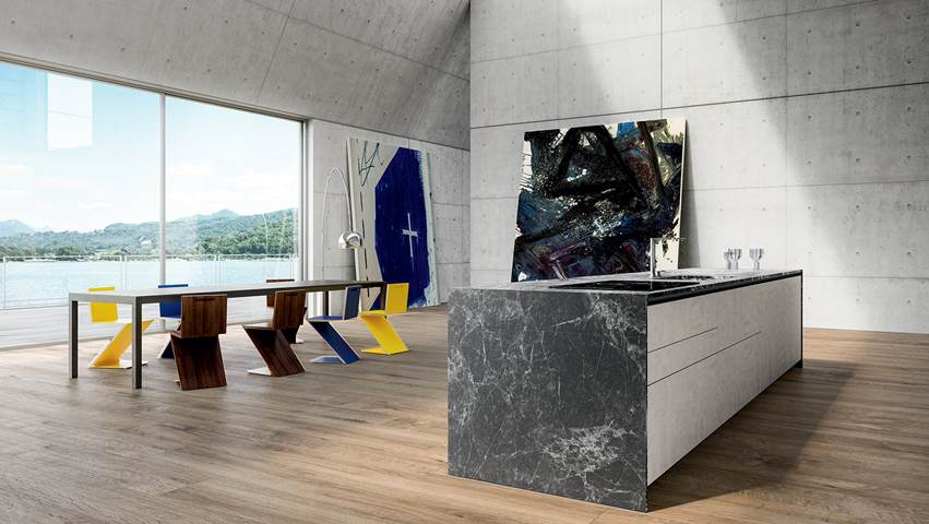 Как и большинство современных моделей, кухня Easy 30 от бренда Elmar представлена в виде модуля хранения и рабочего острова. Изделие характеризуется гладкими и глухими фасадами, открытые полки присутствуют только на острове. Основное цветовое решение — серые оттенки, столешница рабочей зоны выполнена в отделке мрамора.