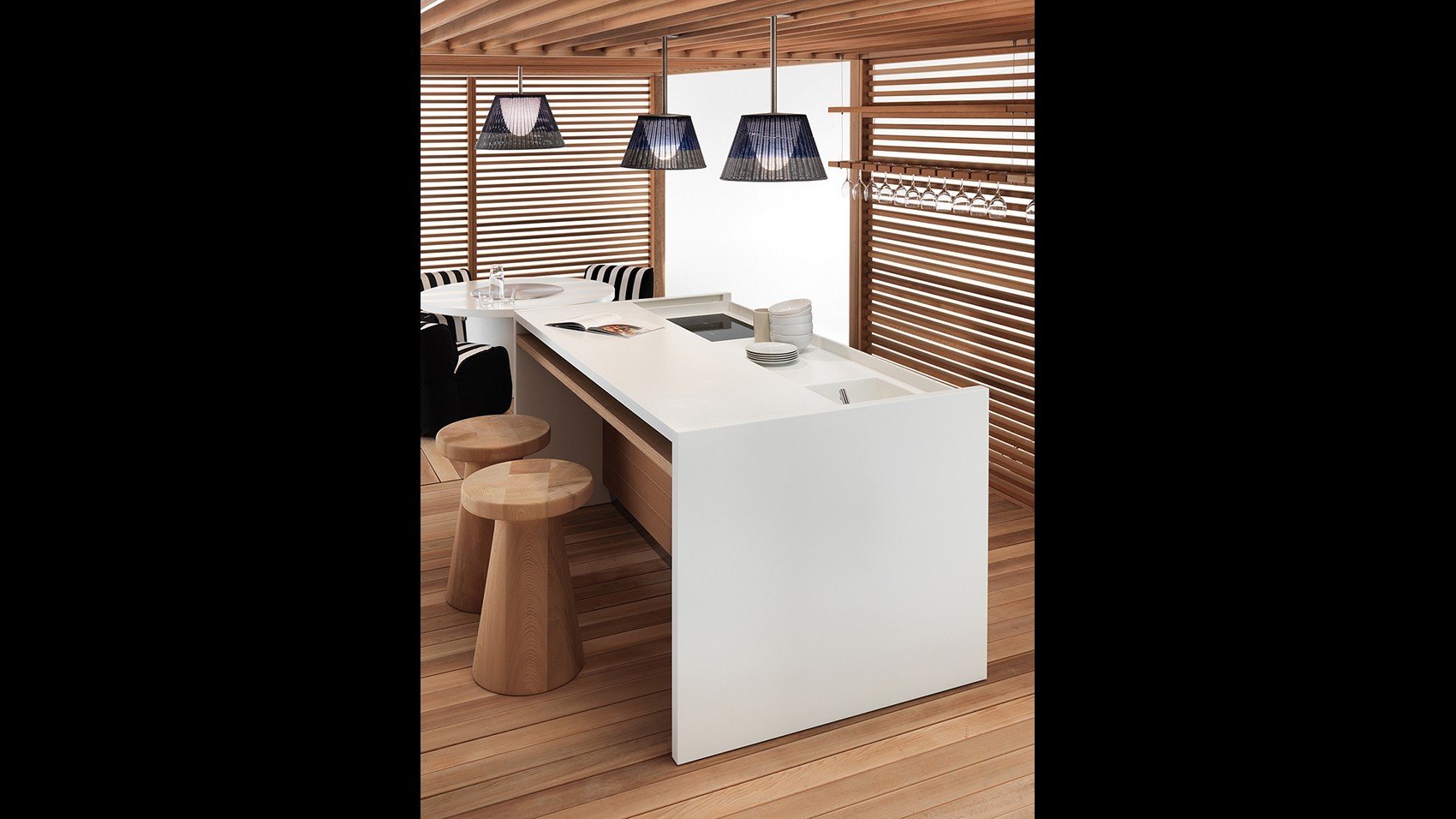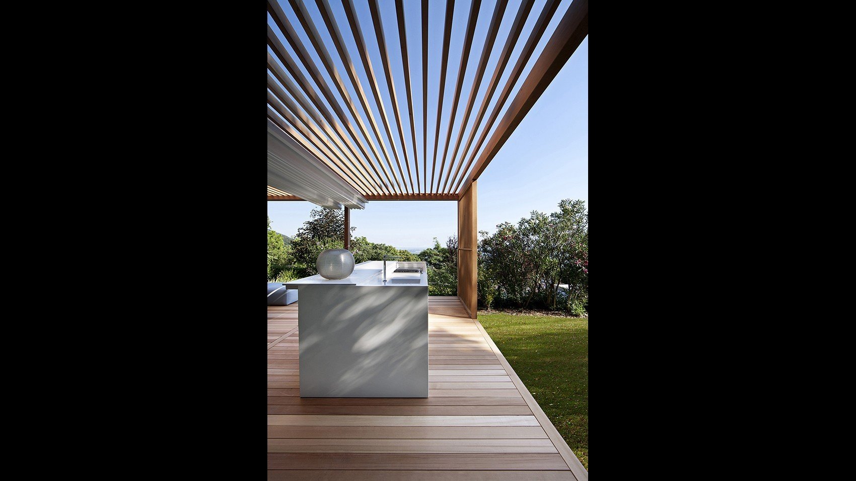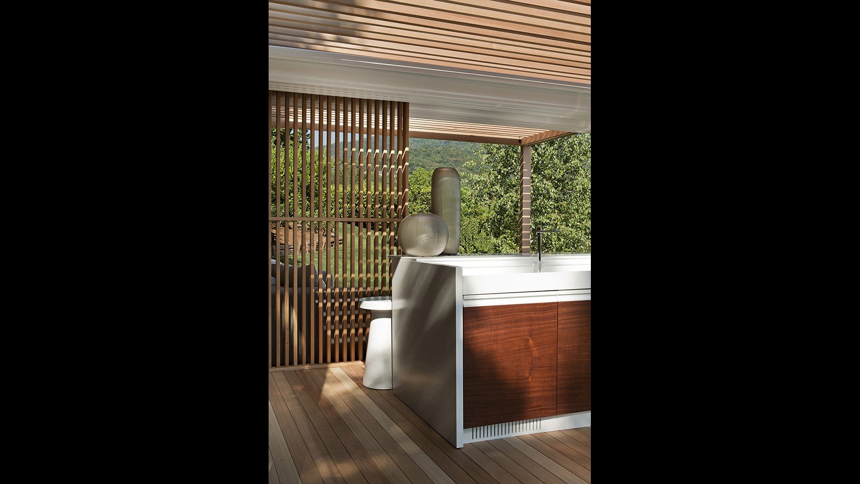 Минималистическая кухня с современной эстетикой, выходящая за границы обычного «острова» и создающая независимое пространство. Выполненная в сочетании белого оттенка с натуральной древесиной, модель может вписаться как жилое помещение, так и использоваться в уличных условиях.