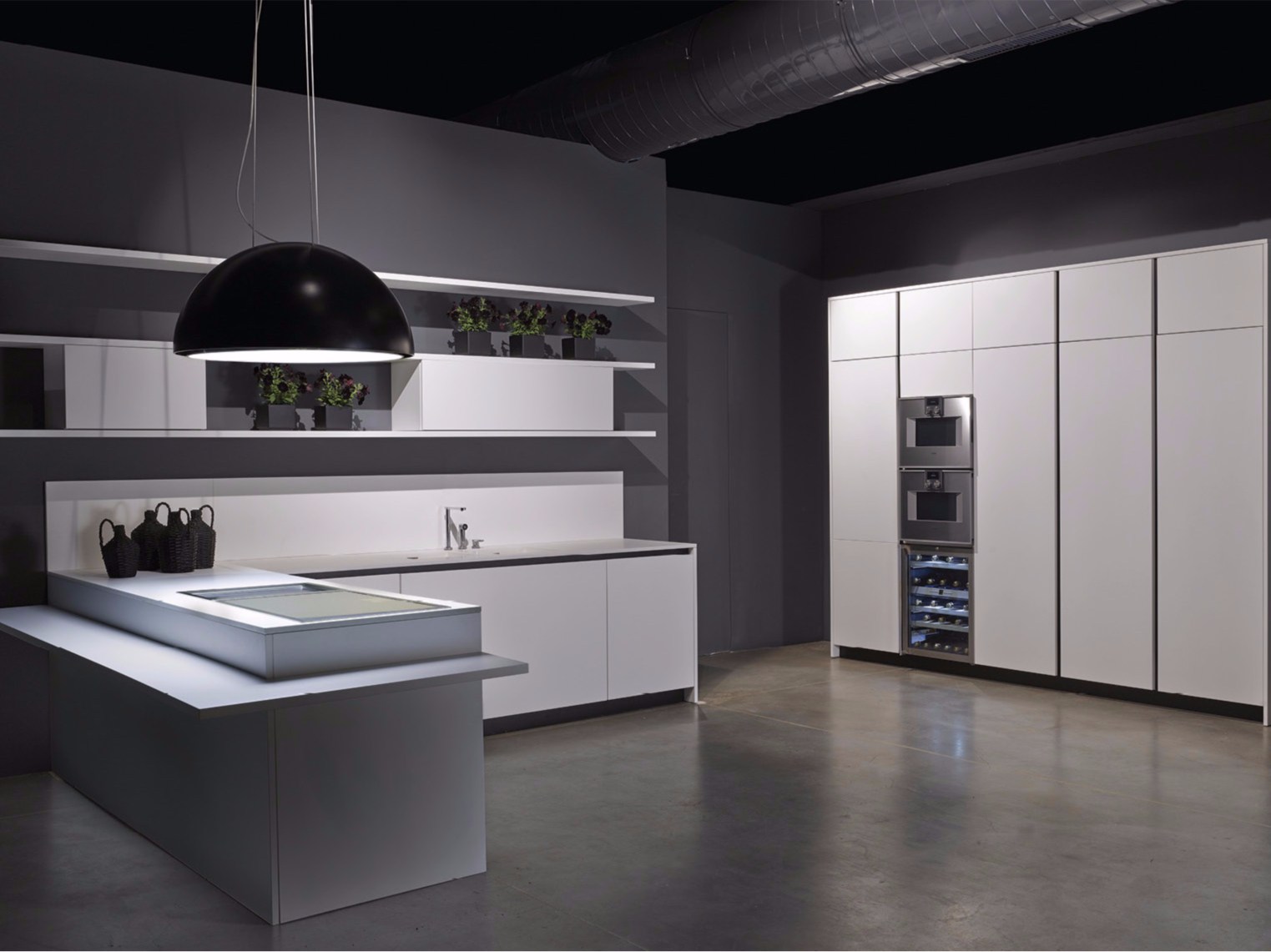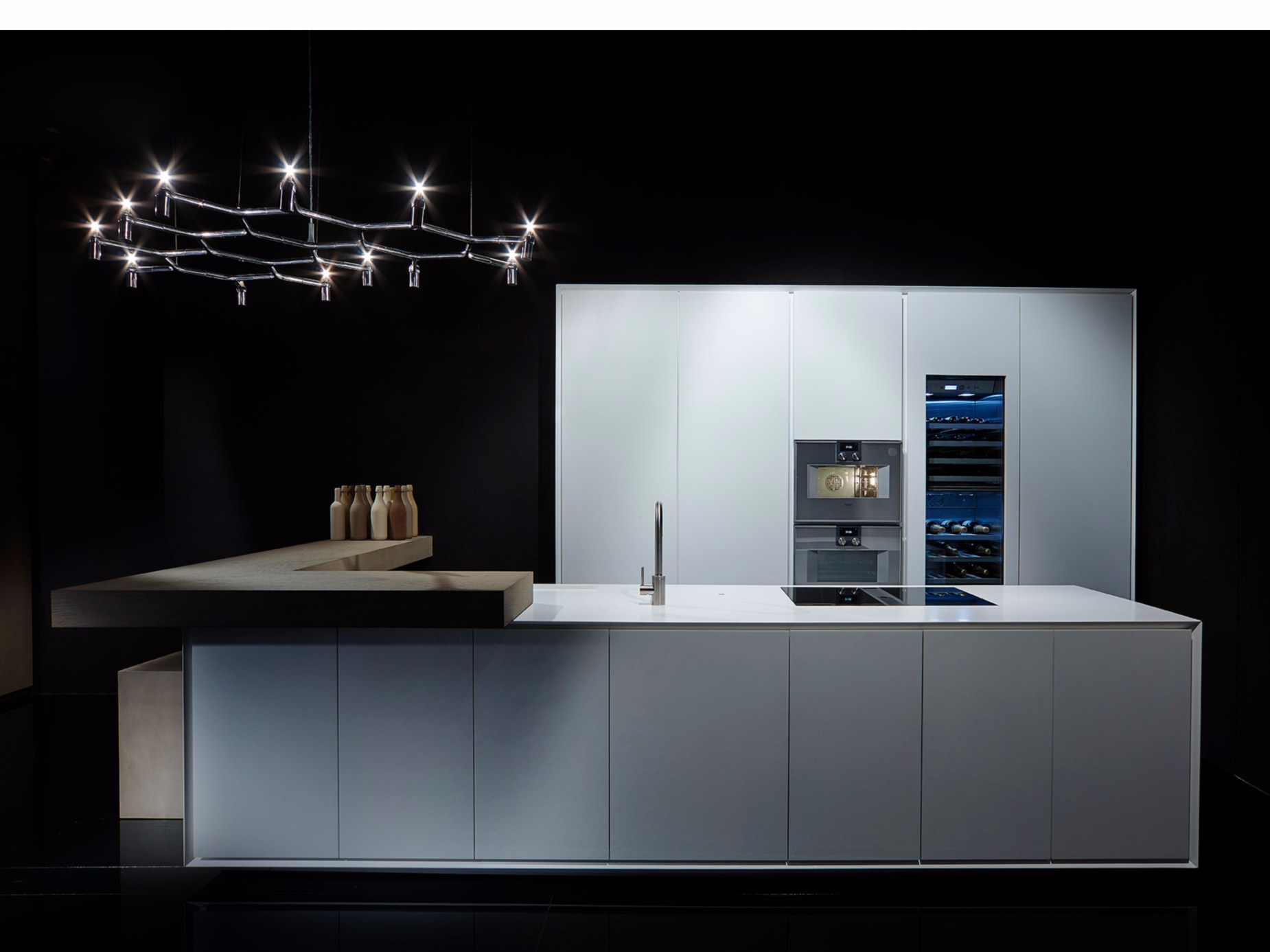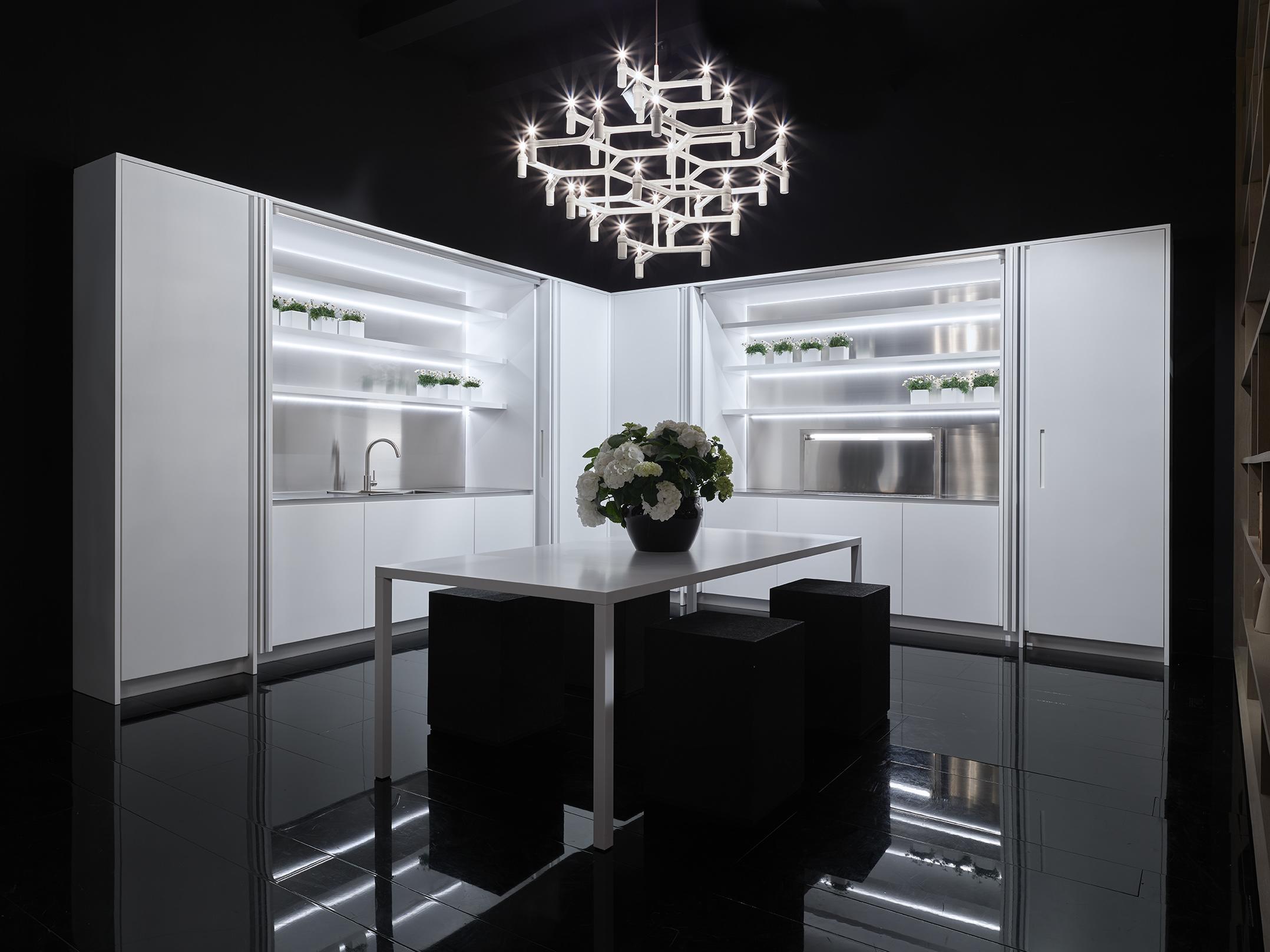 Фабрика также создала вариант своей кухни Line с дверцами из кориана с раздвижной системой, позволяющей скрывать кухню. Эта свежая идея — отличное решение как для больших открытых пространств, так и ограниченных по площади помещений.