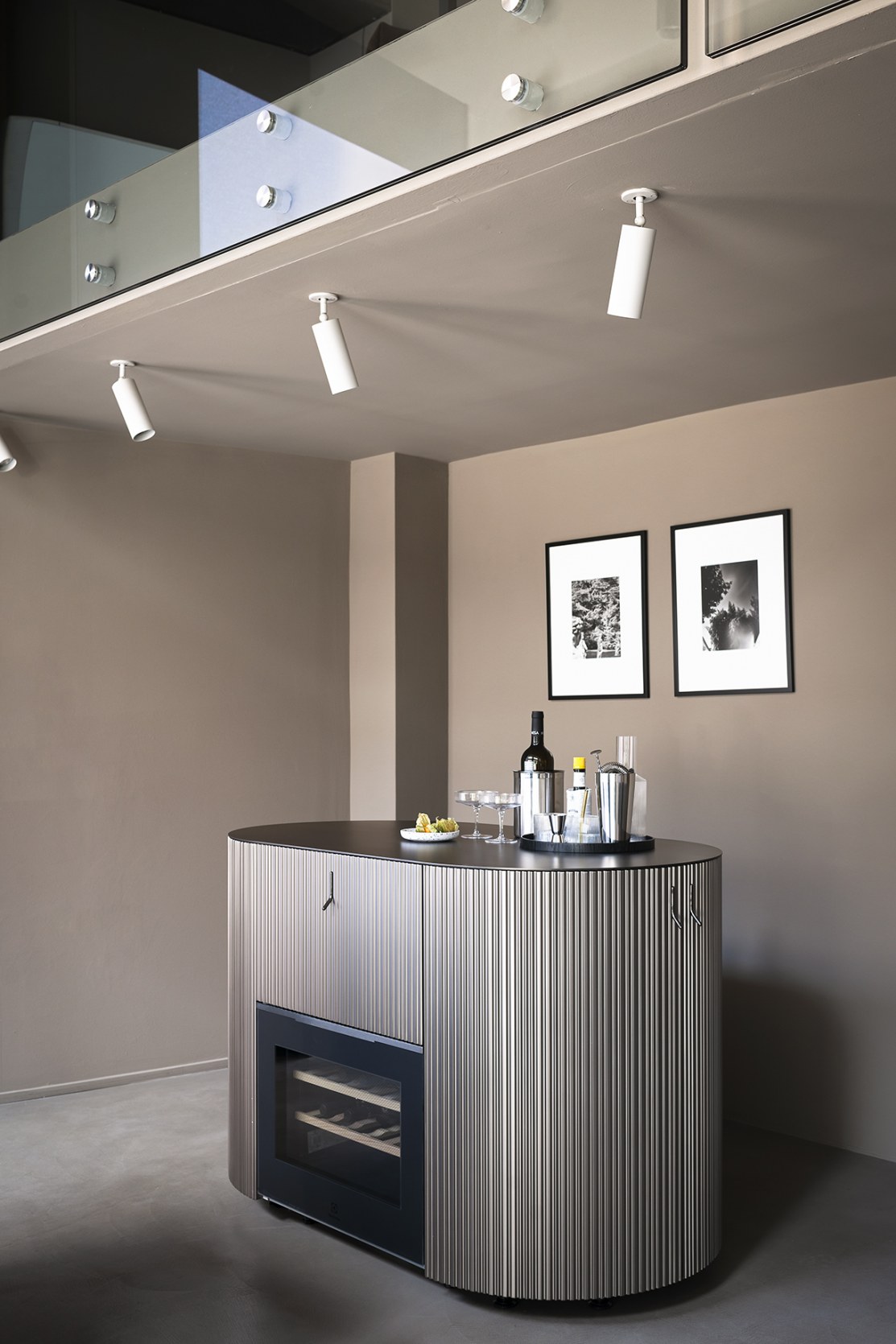 Цветовые решения и комбинации материалов, использованные в дизайне острова Tangram, создают уникальную и стильную атмосферу. Дверь Groove из структурного лака Bianco и столешница из инженерного камня Bianco Apuano образуют элегантное сочетание. Высокие шкафы с утопленными дверцами, обитые линией Dressup, а также полки, столешница и фартук из инженерного камня Bianco Apuano, добавляют функциональности и красоты. Использование подвесных стеклянных колонн с внутренней системой Comb придает завершающий штрих этой композиции.