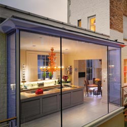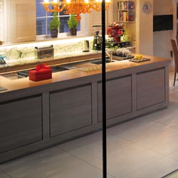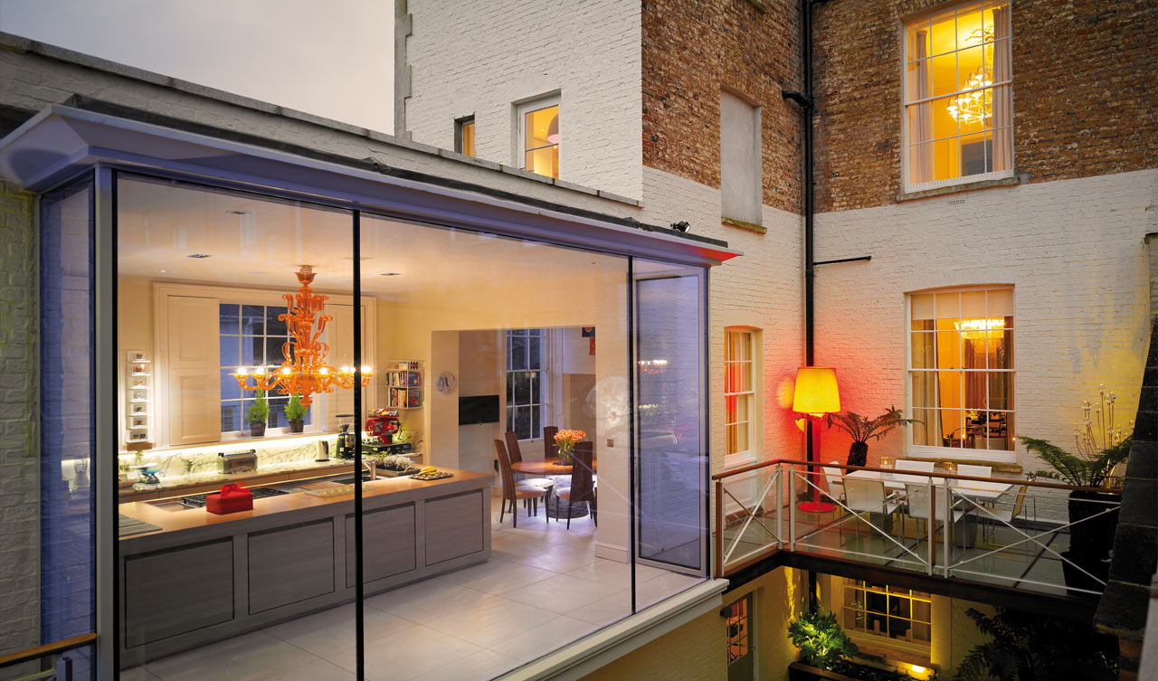 В монолитной кухне всегда есть опасность отяготить дизайн. Кристаллическая стена открывает комнату (большое окно также проделывает этот трюк) и уравновешивает пространство и объёмы.