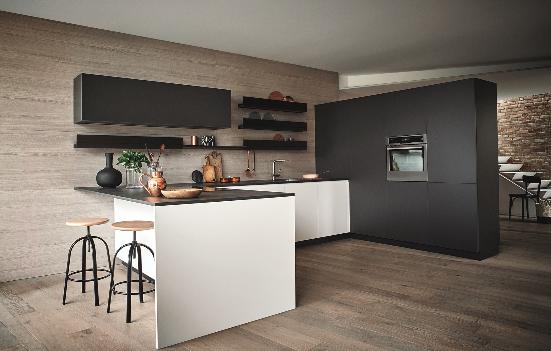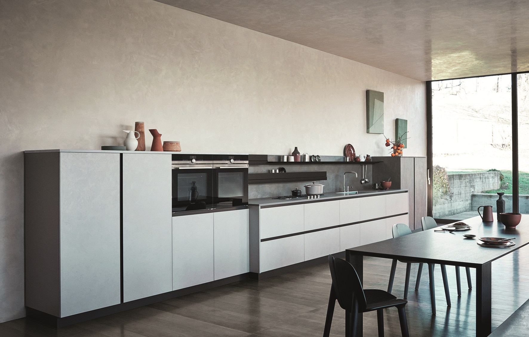 Отличительная дверь шириной 2,2 см может быть изготовлена из различных материалов и доступна в более чем 80 отделках или в специальном, оригинальном варианте с алюминиевой рамой и керамической или стеклянной панелью. Различные формы обрамления, используемые при открытии двери, делают акцент на очерченный и минималистический дизайн кухни. Уникальный, универсальный проект становится технологическим в варианте с алюминиевой рамкой, текстурированный в различных видах древесины, которые варьируются от натурального или лакированного дуба ореха и тика.