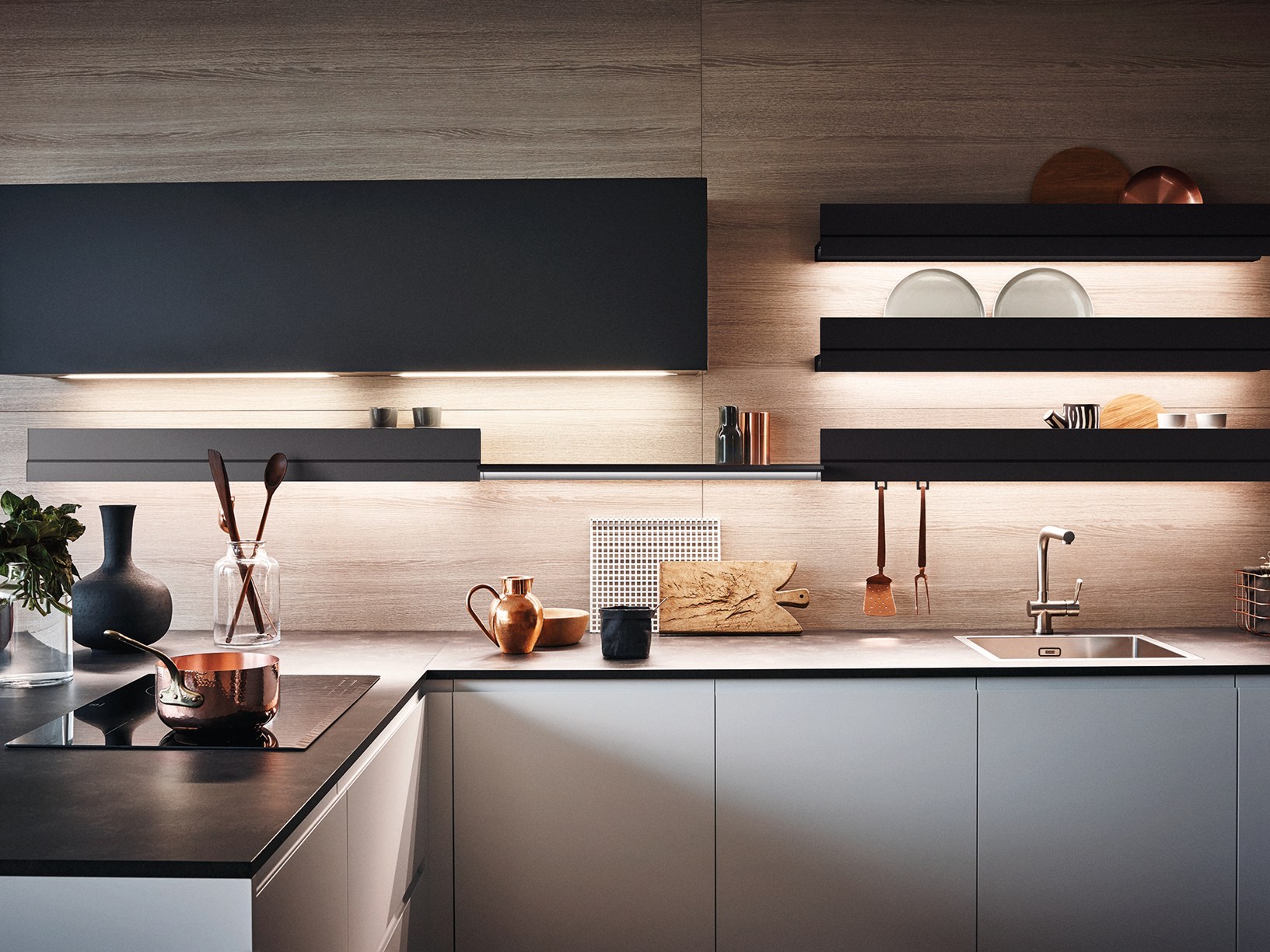 Композиция, которая сочетает в себе лёгкое ощущение шелка от лака Bianco, столешницу из ламината Pietra Brown, а также двухтактные открывающиеся двери в Bronzite melamine, обладает тёплой, уютной и элегантной привлекательностью. Захватывающая ручка The Hook соединяет двери у основания, что позволяет их открывать без использования ниш или ручки.