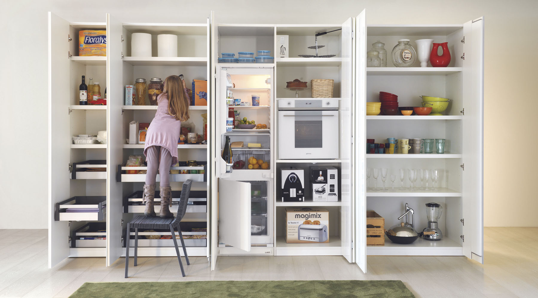 Такие производители как LAGO, TM Italia и Toncelli нашли решение этой проблемы. Чтобы избежать таких неудобств, они снабдили дверцу специальным приводом, который конструктивно напоминает механизм Push-Pull. Вы нажимаете на дверцу холодильника, и специальный привод открывает её на 10–15 см, после чего вы сами с легкостью открываете холодильник до конца. Фабрики LAGO и Toncelli используют механические приводы, а TM Italia — электрический (в случае отключения электричества, вы, как и обычно, можете открыть холодильник без помощи привода).