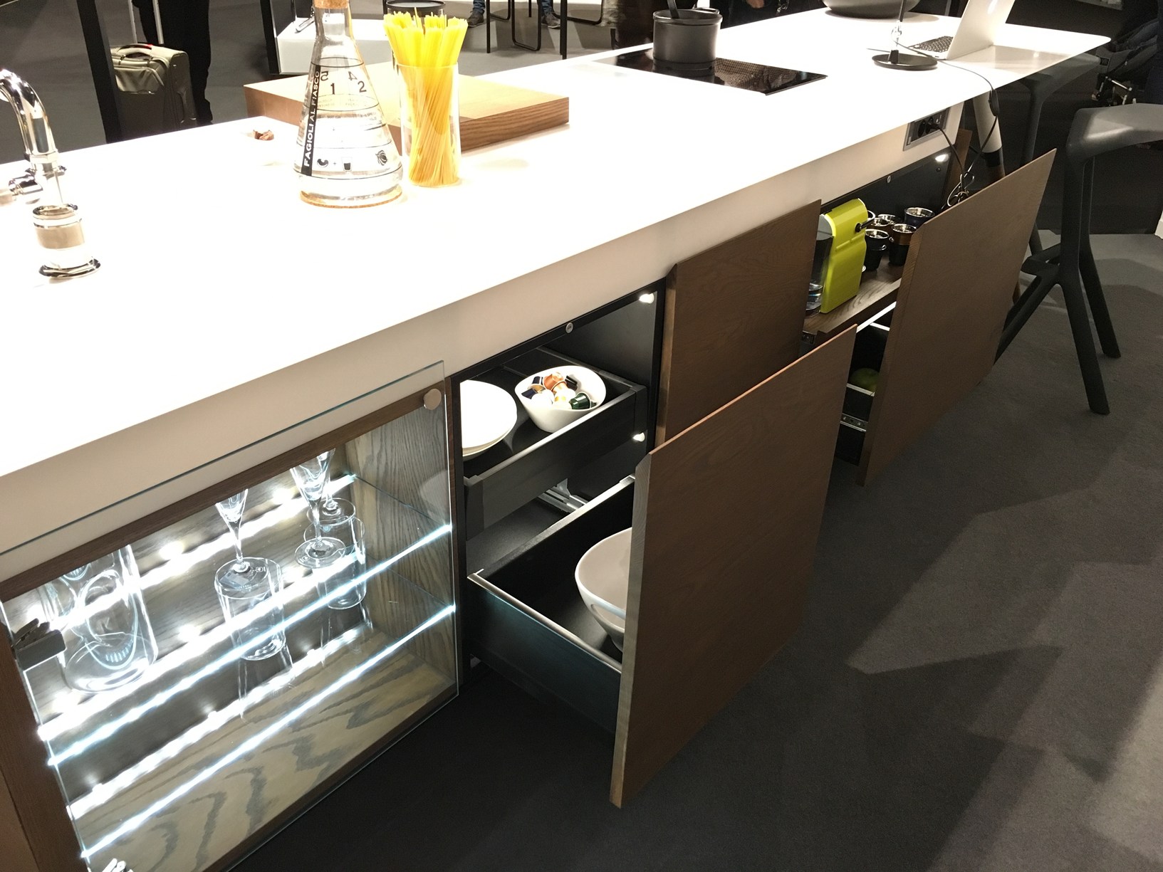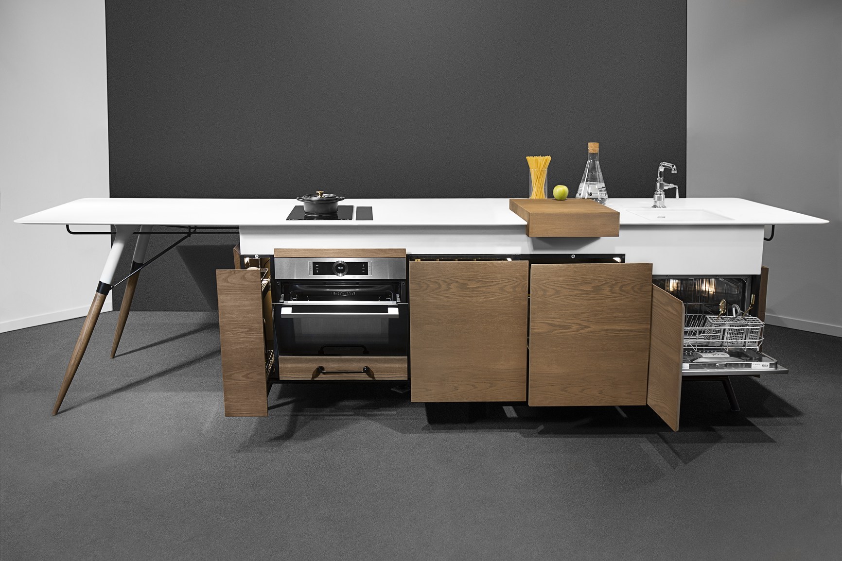 Нет необходимости в верхних полках — всё скрыто под столешницей. Проект начинается со стола Table T и плавно переходит в Kitch’. Кухня спроектирована таким образом, чтобы вписаться в ширину стола Table T — 92 см и длину плиты Corian DuPont — 365 см.