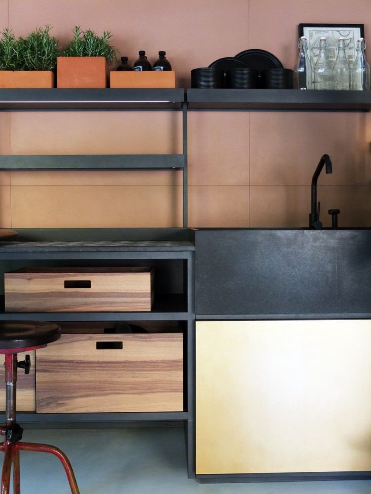 Утилитарной мебели. Металлический каркас, фасады из алюминия, ящики, напоминающие старые деревянные комоды. Отсылка в дизайне к индустриальному стилю всегда актуальна и требует всего лишь строгих форм и тщательной отделки.