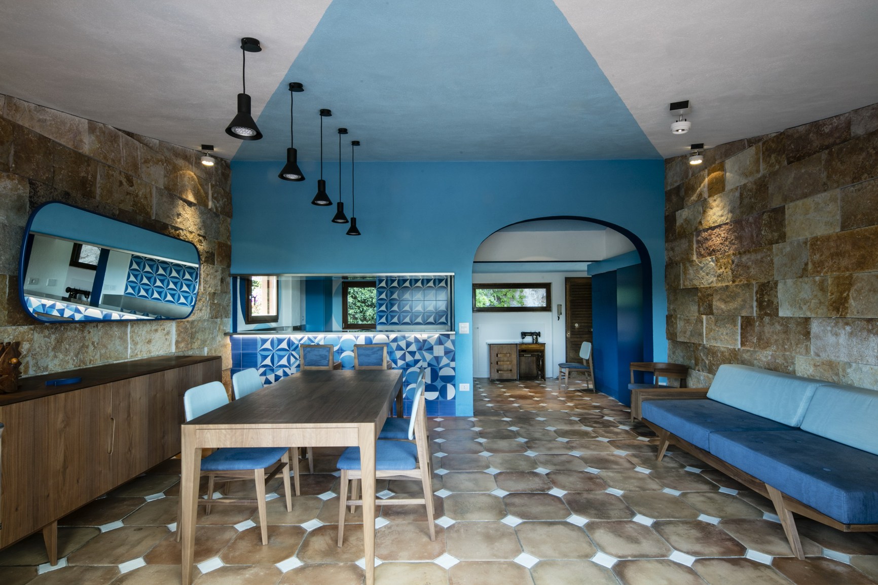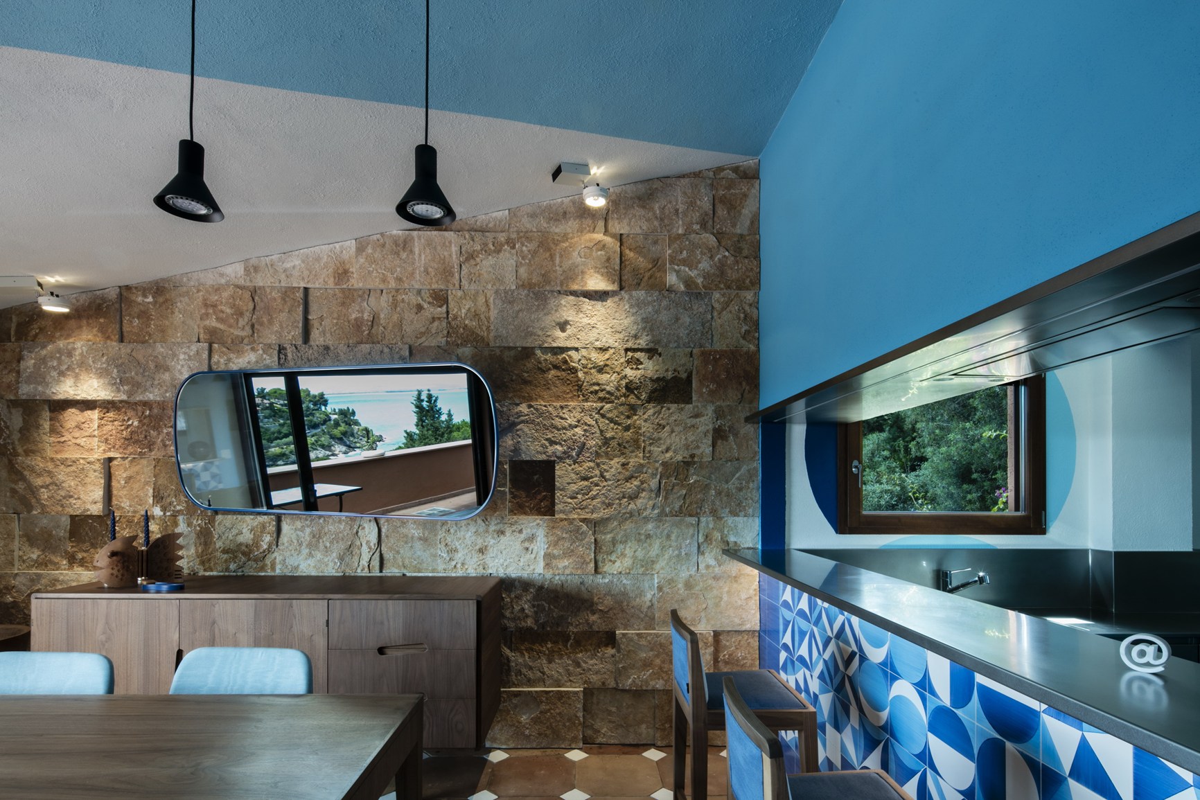 Отверстие в стене создаёт элегантную непрерывность между двумя комнатами и даёт вам возможность насладиться видом даже во время приготовления пищи — в пейзаже доминирует приморская сосна, которая простирается вплоть до моря. Нижняя граница прохода между двумя комнатами представлена нержавеющей сталью, консольной стойкой, которая становится практичным баром для завтрака; верхняя граница идентична, однако в неё интегрирована вытяжка в виде тонких щелей в поверхности металла. Качество продукции Abimis очевидно уже при одном взгляде на эти два элемента — заказные конструкции, которые изготавливаются вручную в зависимости от конкретных потребностей каждого проекта.