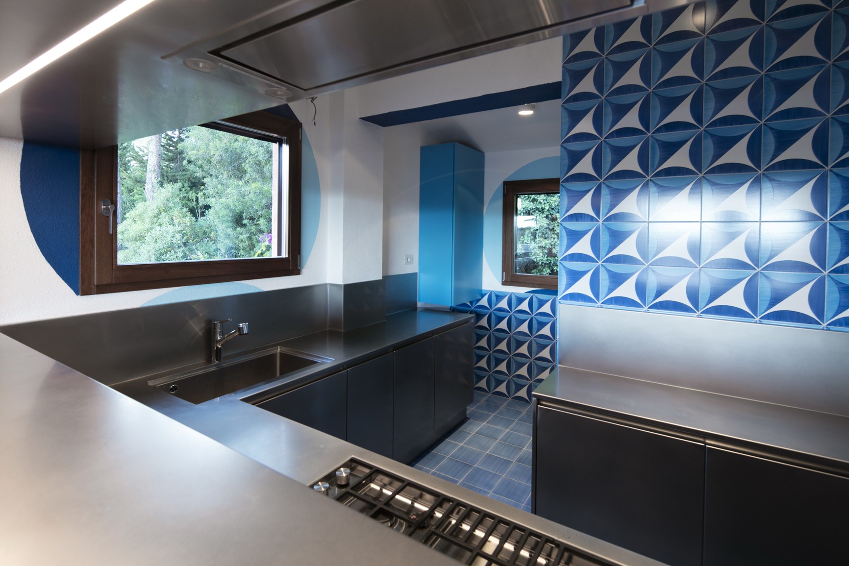 Её квадратная дверь и тонкий выпускной экстрактор придают этой кухне больше характера — кухне, чей блестящий материал и орбитальная ручная полировка отражают узор и плитку с оттенками голубого.