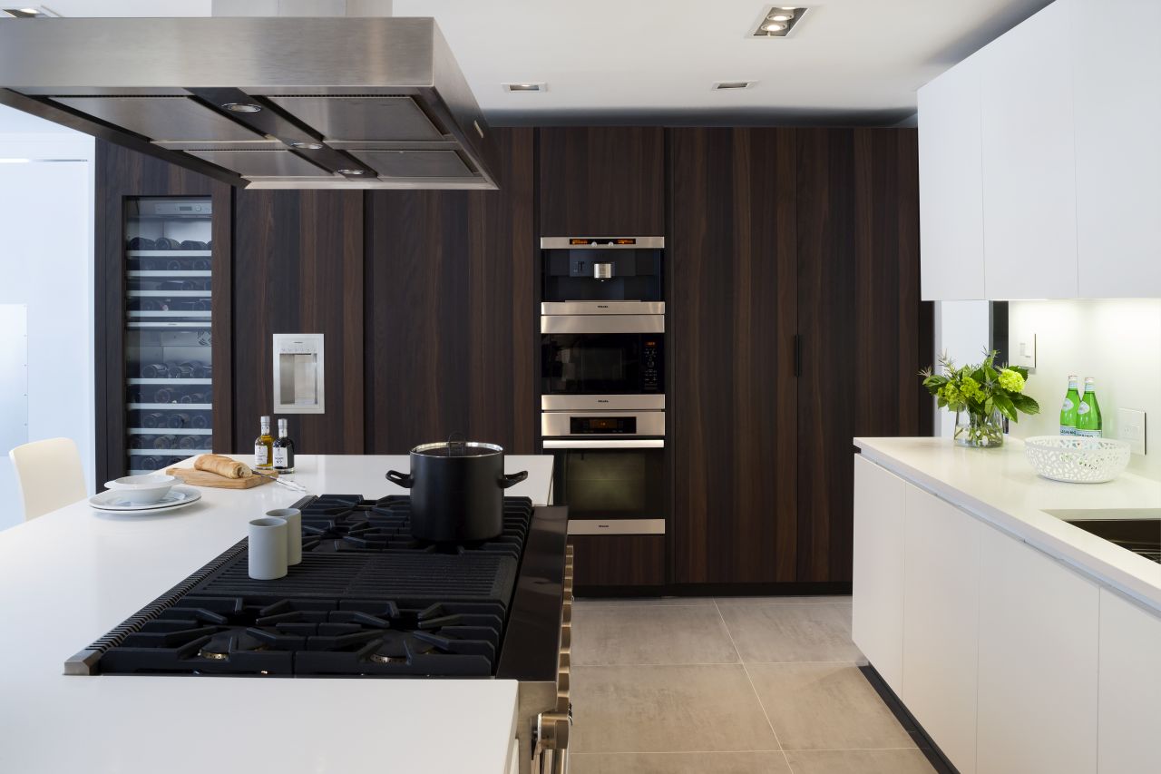 В этом доме семейная жизнь вращается вокруг кухни — эта комната объединяет всех в единое целое. Здесь легко перемешались изысканная эстетика и функциональность, что является ярким примером хорошего дизайна. Большие цветные плитки из цемента имеют высокую износоустойчивость и специально подобраны для детских забав и игр с собакой, а также разбавляют нейтральный декор помещения. Кухня имеет две стороны: на одной стене интегрирована техника и мебель (холодильник и винный шкаф от Gaggenau), а с другой стороны имеются тёмные стальные панели, которые складываются пополам, как магнитная доска для отображения заметок, изображений и всего, что потребуется. Белое пространство в центре комнаты предназначено для приготовления пищи. Оно является «фокусной» точкой кухни.
