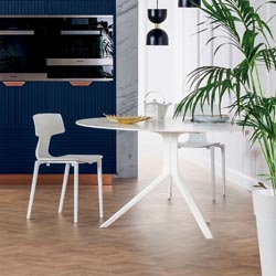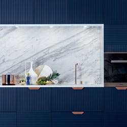 Мраморные прожилки и рельефные полосы, ослепительный блеск белого и успокаивающая гармония синего. Благодаря элегантным штрихам новая кухня напоминает морской стиль, концентрируясь на чётких и чистых линиях, а также на сопоставлении твёрдых и пустых пространств. Зона приготовления пищи располагается на тёмно-синих текстурированных шкафчиках, встроенных в углубление и окруженных от стены до стены. Эта невероятно функциональная кухня разработана с большим вниманием к деталям. Общая эстетика – молодая и свежая, хотя динамичная и утончённая. Это кухня отличается лаконичностью.