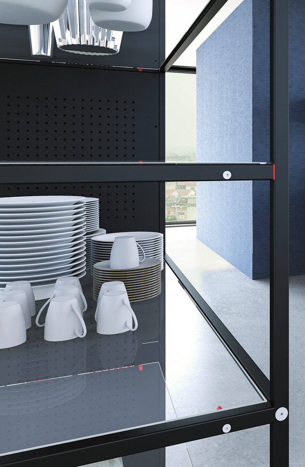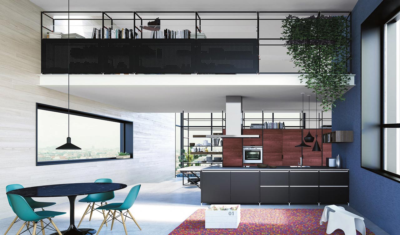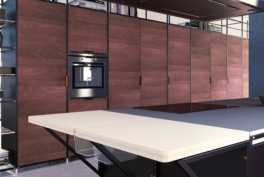 Кухня — это сердце дома и центр помещения для приёма гостей. В ней сочетается атмосфера домашнего радушия с сильной «социальной» подоплекой. Дерево задаёт тон, напоминая о традициях, в то время как сталь придаёт дизайну инновационный оттенок. Однако же основу всего составляют открытые стеллажи, ненавязчиво объединяющие столовую с кухней.