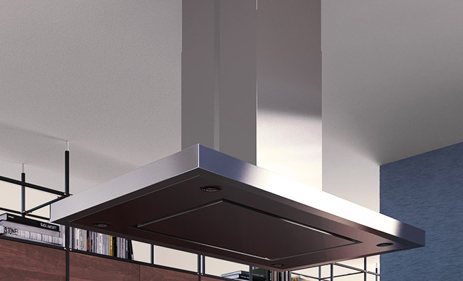Технологичной вытяжки. Блестящая сталь, которой придали форму большого квадрата. Такая вытяжка станет крайне стильным центром кухни.
