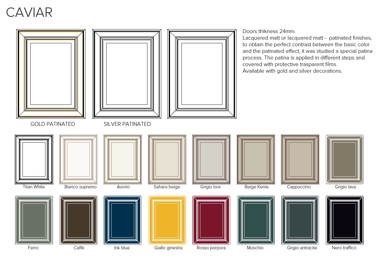 Фасады модели Caviar выполнены из массива, толщина дверцы 24мм. В качестве отделки фабрикой предлагается 16 цветов, матовая или глянцевая покраска.