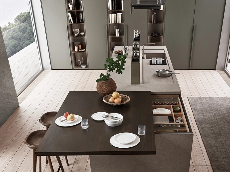 Современные материалы и идеально подобранные цвета создают элегантную и комфортную схему интерьера, которая сочетается с другими элементами дома. Рабочая зона Sign окружена открытыми модулями и координированными решениями хранения, что делает ее еще более функциональной и удобной в использовании.