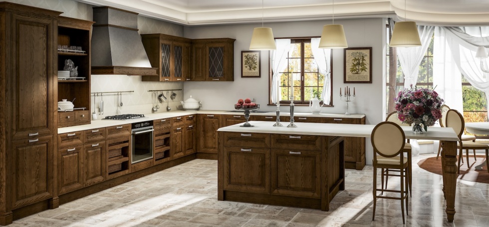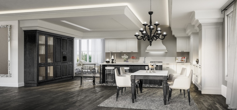 Отделка фасадов для кухни Sheraton выбиралась с особой тщательностью — в итоге дизайнеры остановили свой выбор на комбинированном варианте: дерево в тонировке под орех с лакировками Bianco Calce и Nero China.