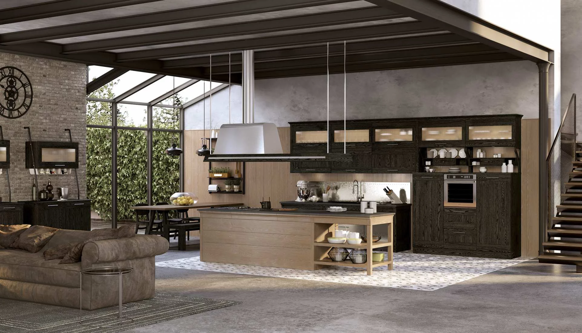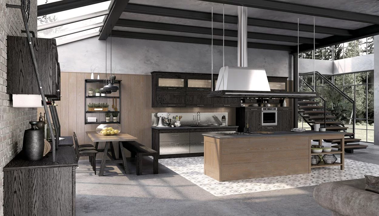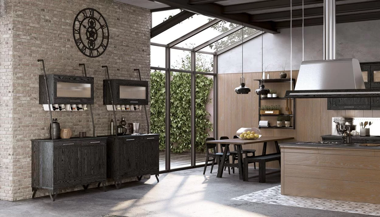 Современная кухня не всегда имеет экстравагантный внешний вид. Positano Industria от итальянской фабрики Arcari представлена в тёмной и светлой древесине, которая органично сочетается с металлическими фасадами рабочей области. Фронты подвесных ящиков представлены в глухом и застеклённом вариантах.