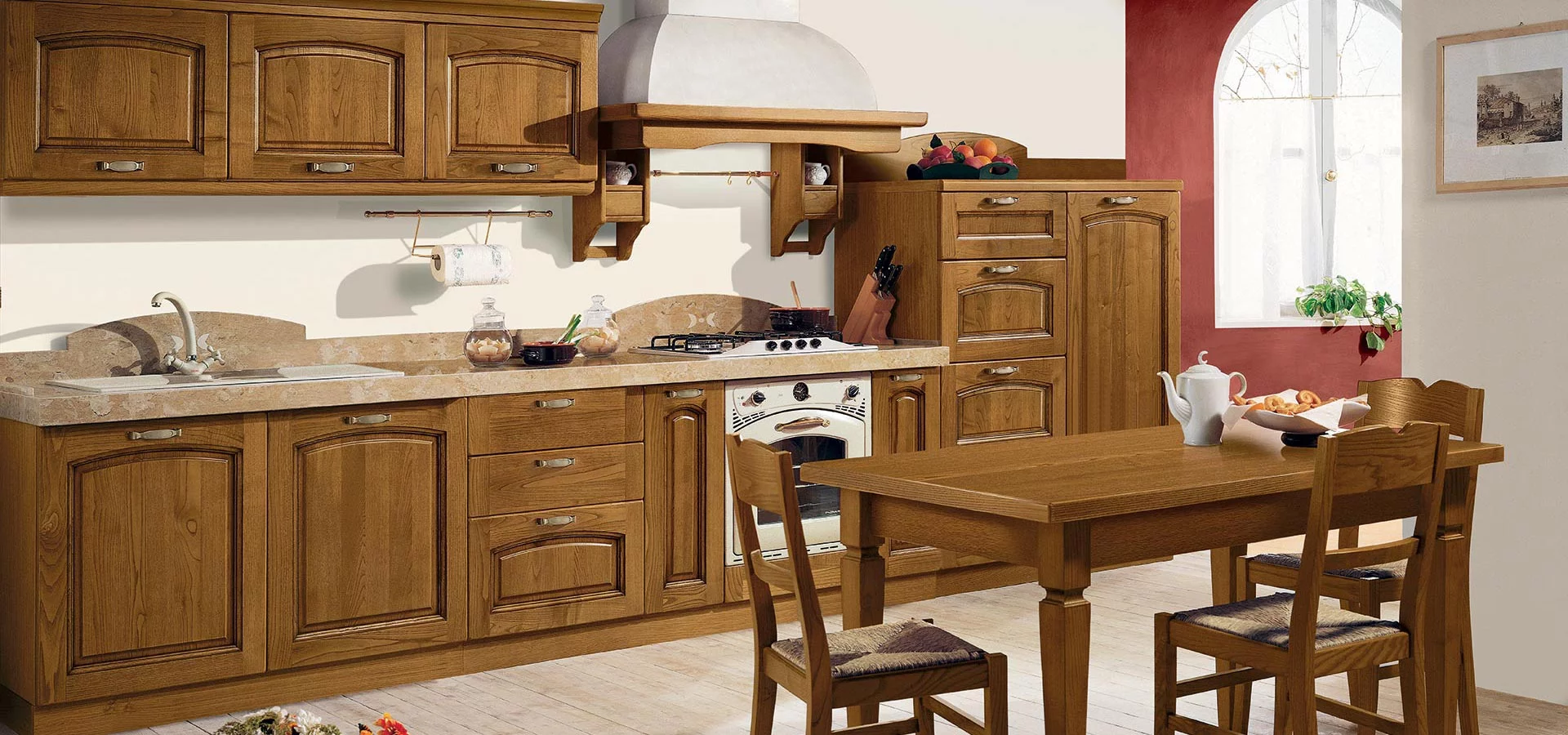Отличительной чертой кухни Emma от итальянской фабрики Arredo 3 являются фасады с интересным рисунком, выполненные из массива каштана. Чтобы подчеркнуть искусную работу, мастера бренда используют в дизайне слегка изогнутые линии.