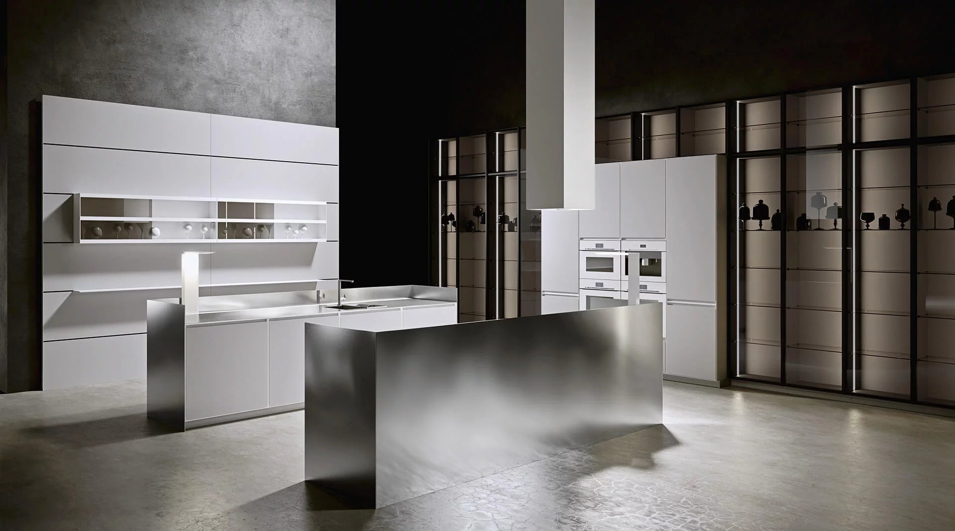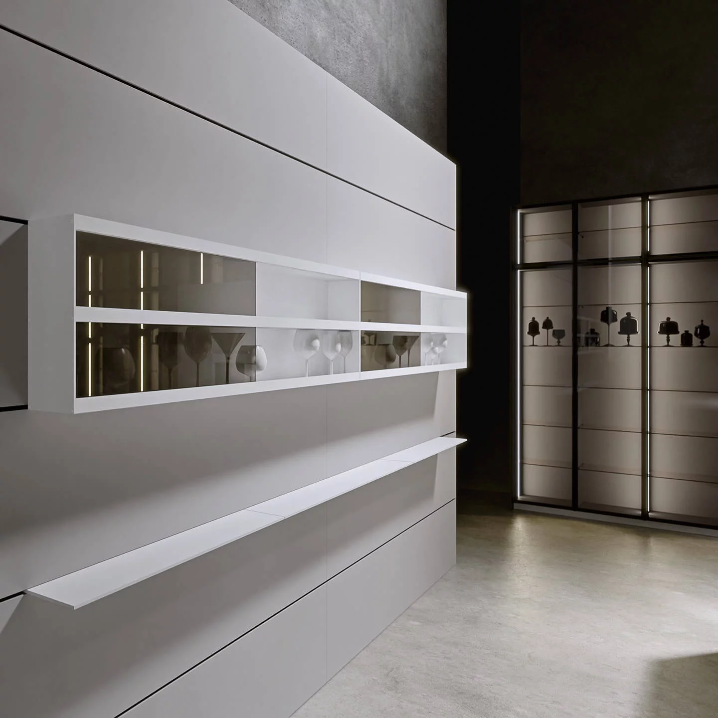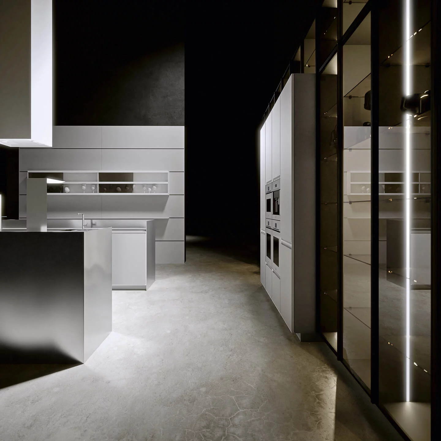Отличительной особенностью AkB_08 является дверь и рама Floating Core, в которой эстетическая лёгкость оригами сочетается с прочностью прочной алюминиевой рамы, что придаёт новый вид дизайну дома. Рама, доступная в отделках Ardesia и Bianco, позволяет использовать тонкие передние панели, доступные в многочисленных лакированных, фанерованных, отделках Fenix и Corian.