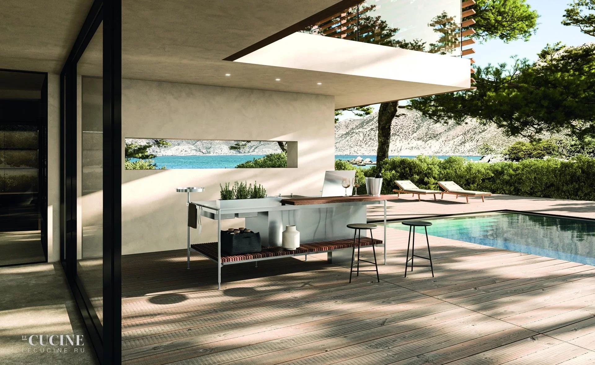 • Островная кухня — независимое решение для террас и садов, легко адаптирующееся под разные поверхности.