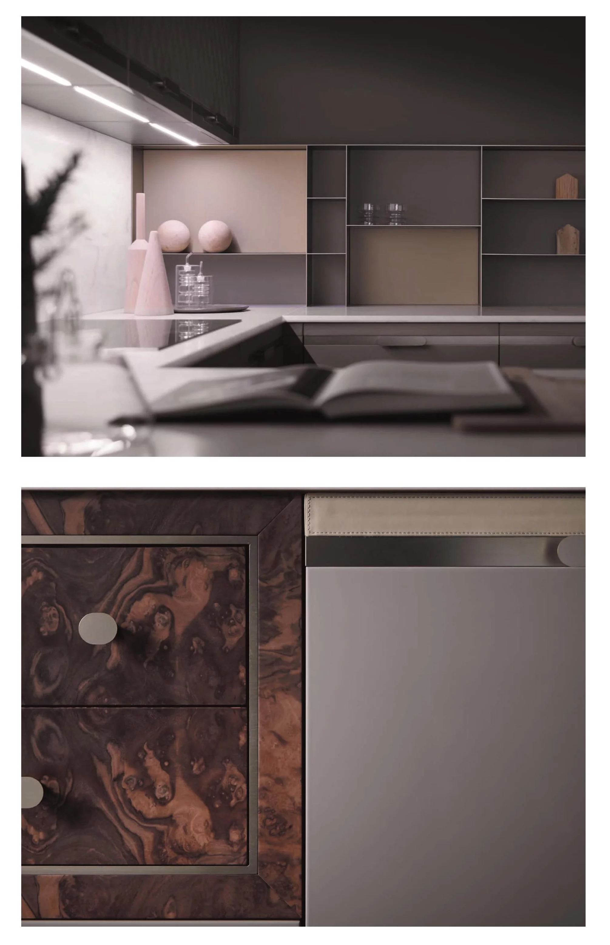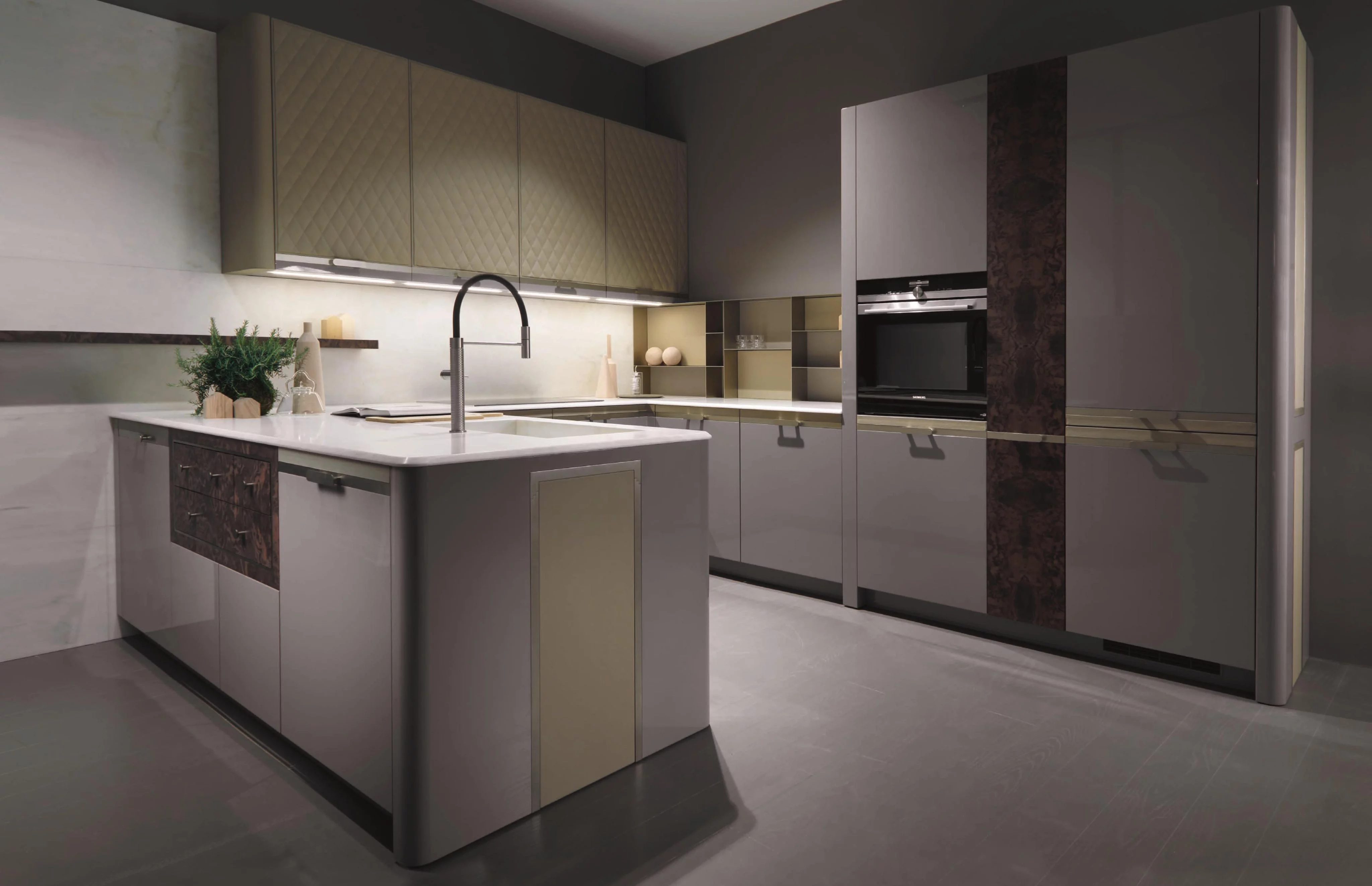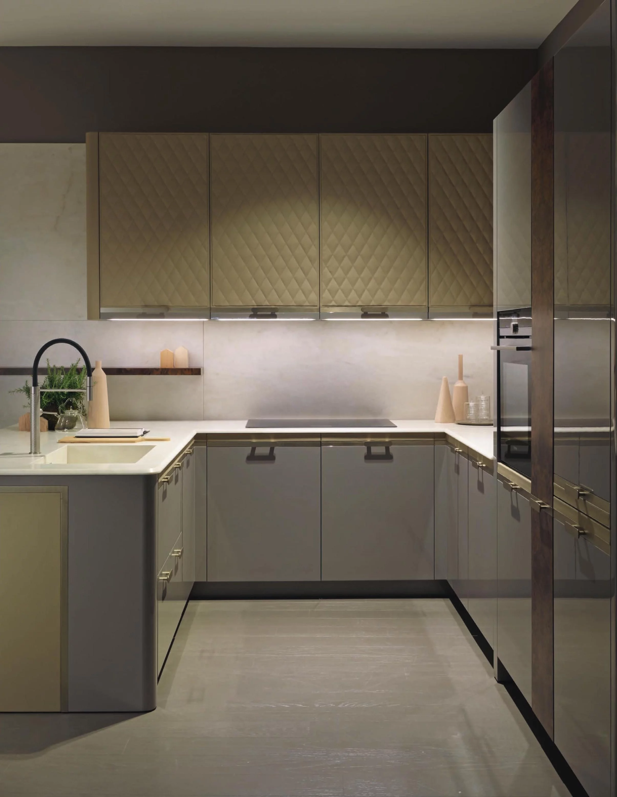 Кроме этого, в комплектацию модели Mon Etoile входит система подвесных шкафчиков, фасады которых украшает ромбовидный орнамент. Также вы сможете компактно разместить всю необходимую технику в высоких напольных шкафах.