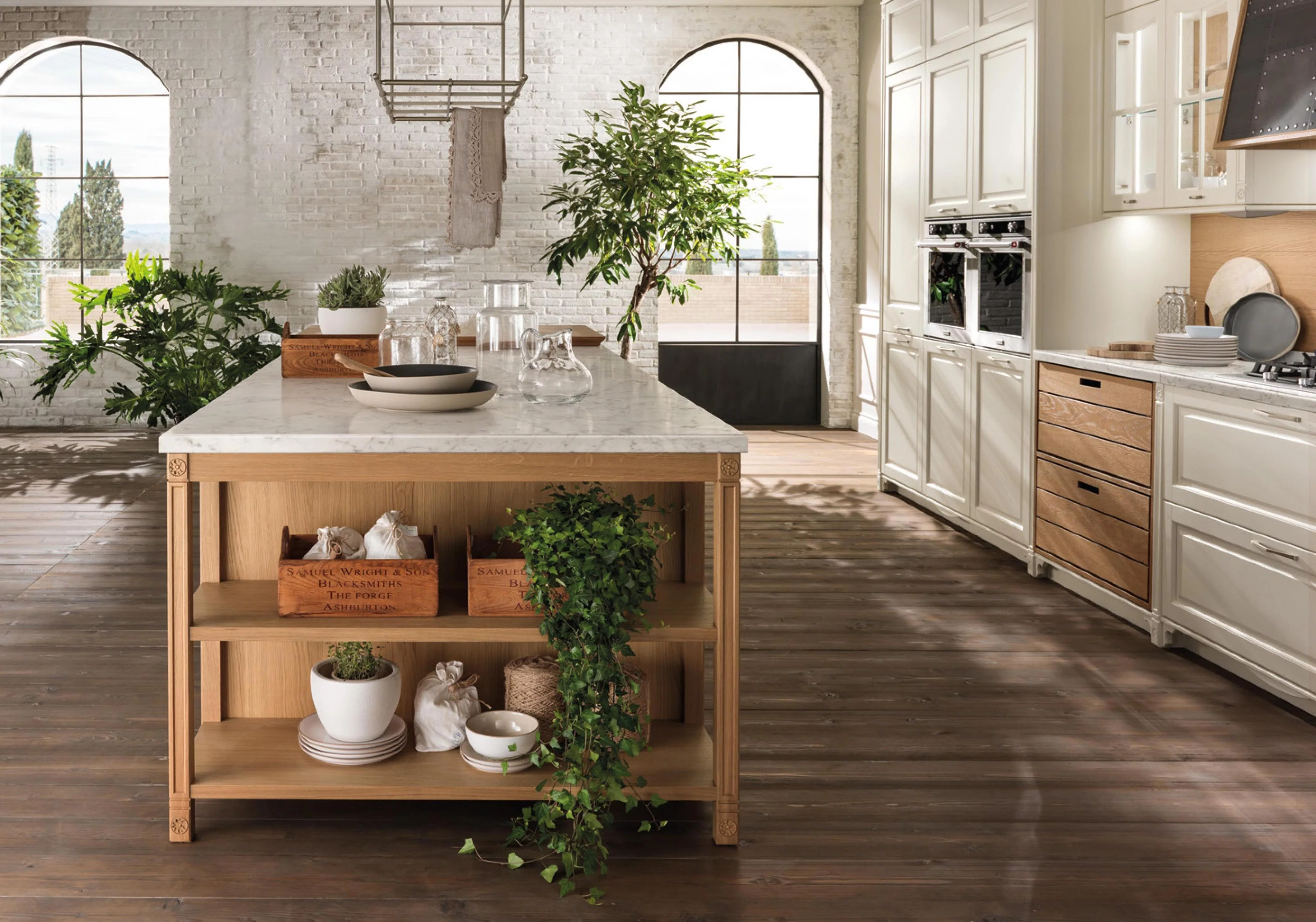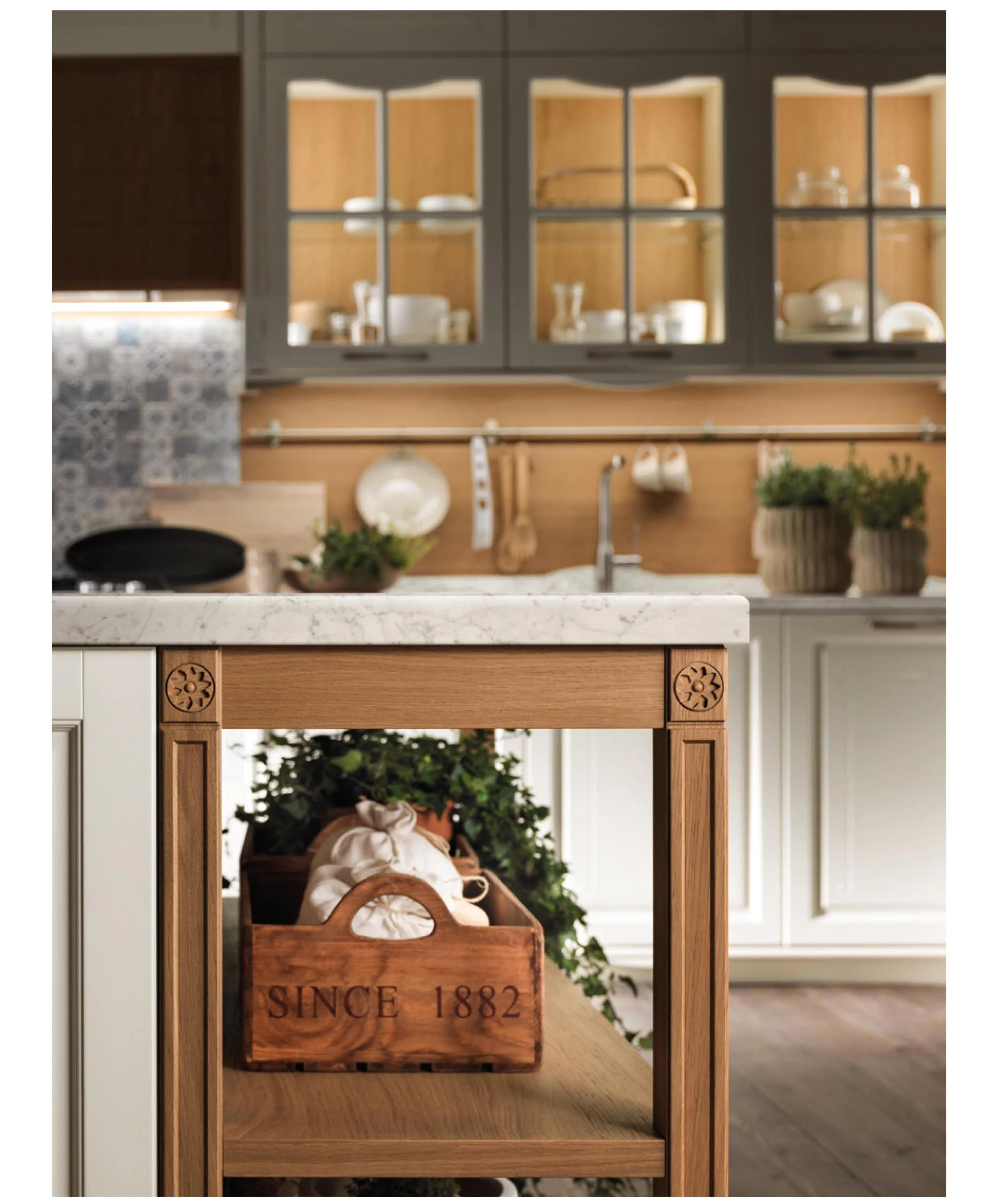 Кухни Portrait из одноимённой линейки отличают молочные фасады модульных элементов. Выполненная в классическом стиле с нотками прованса данная модель станет отличным решением как для городских апартаментов, так и загородного дома. Данное изделие комплектуется из рабочей области, автономного острова и системы хранения: напольных и подвесных шкафов.