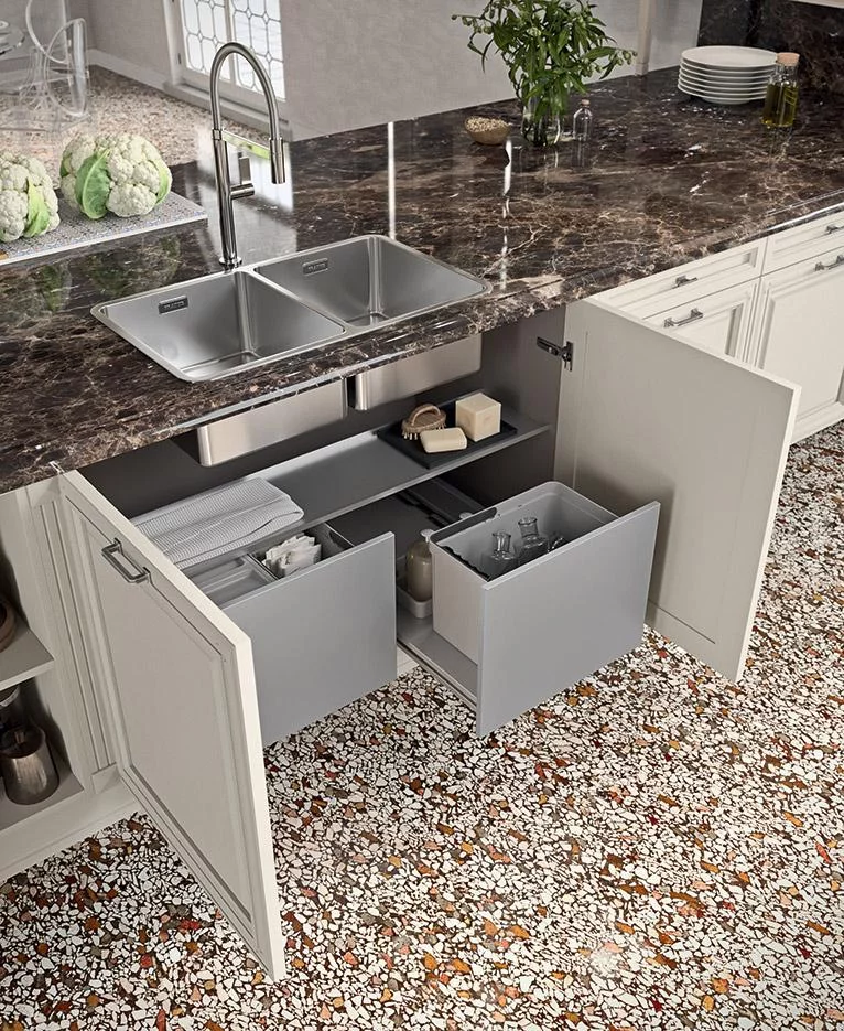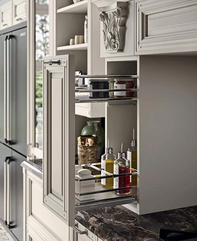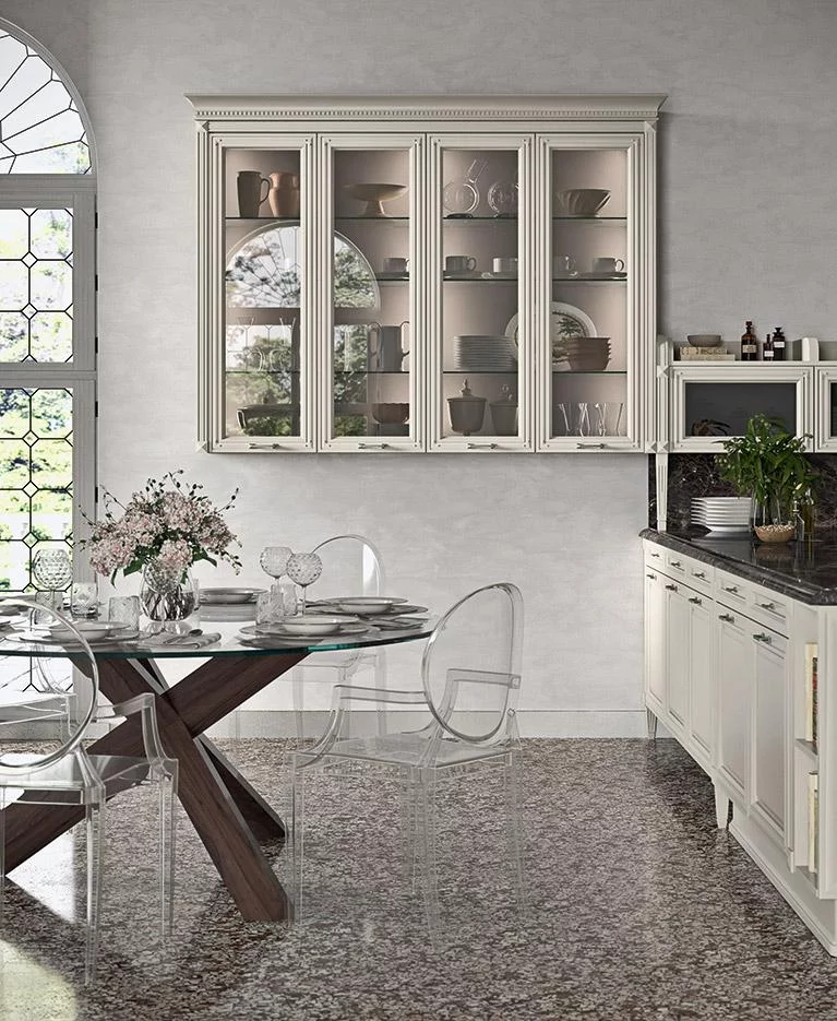 Кухня Elite Interior представляет собой отдельно стоящий остров, систему хранения и рабочую область, располагающуюся возле стены. В качестве дополнительных модулей хранения представлены напольные тумбы и подвесные шкафчики. Их дверцы оснащены бесшумными механизмами открытия и закрытия, представлены в глухом и застеклённом вариантах.
