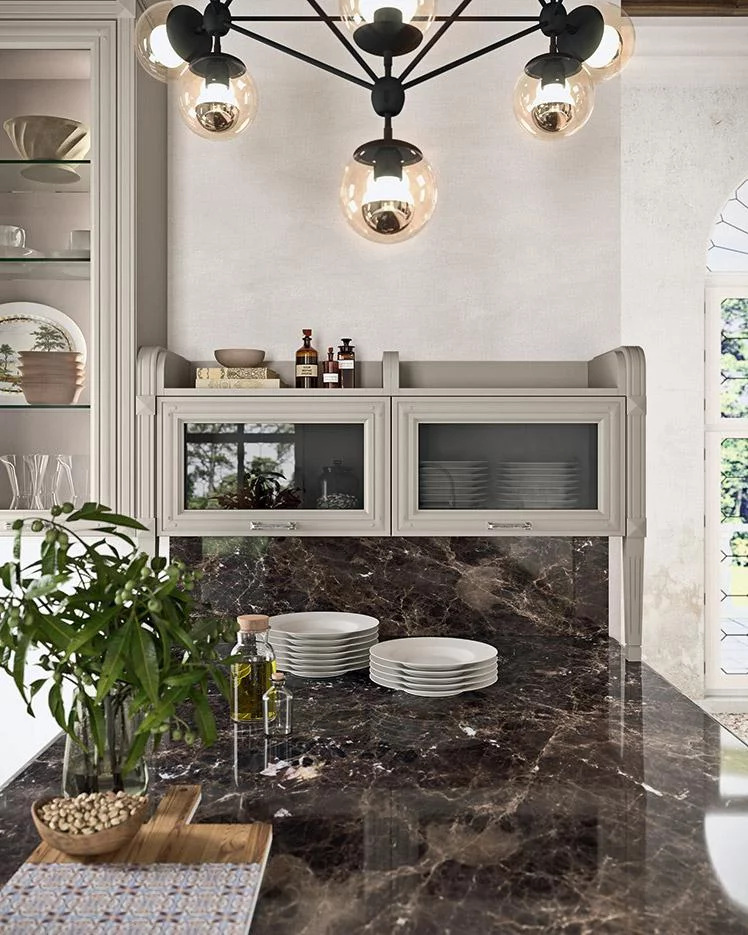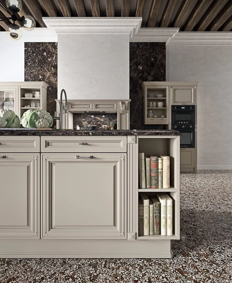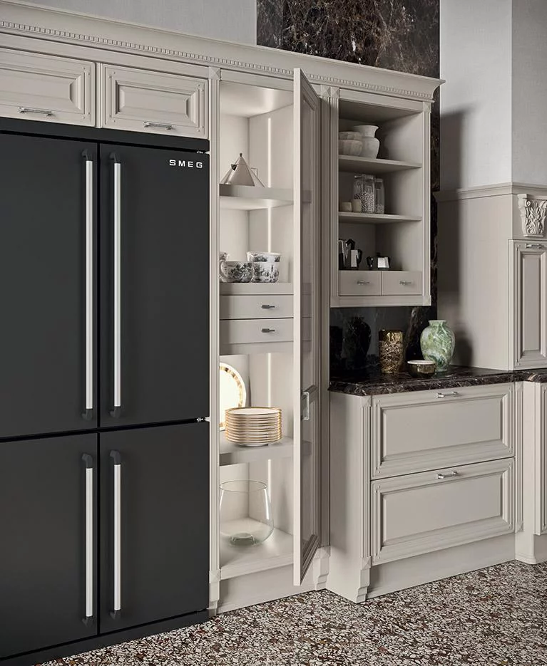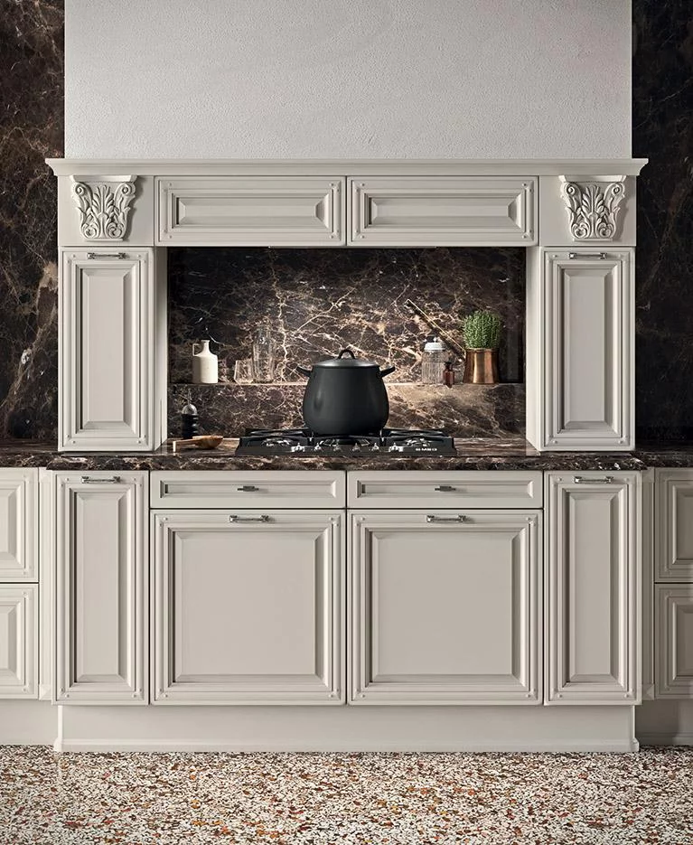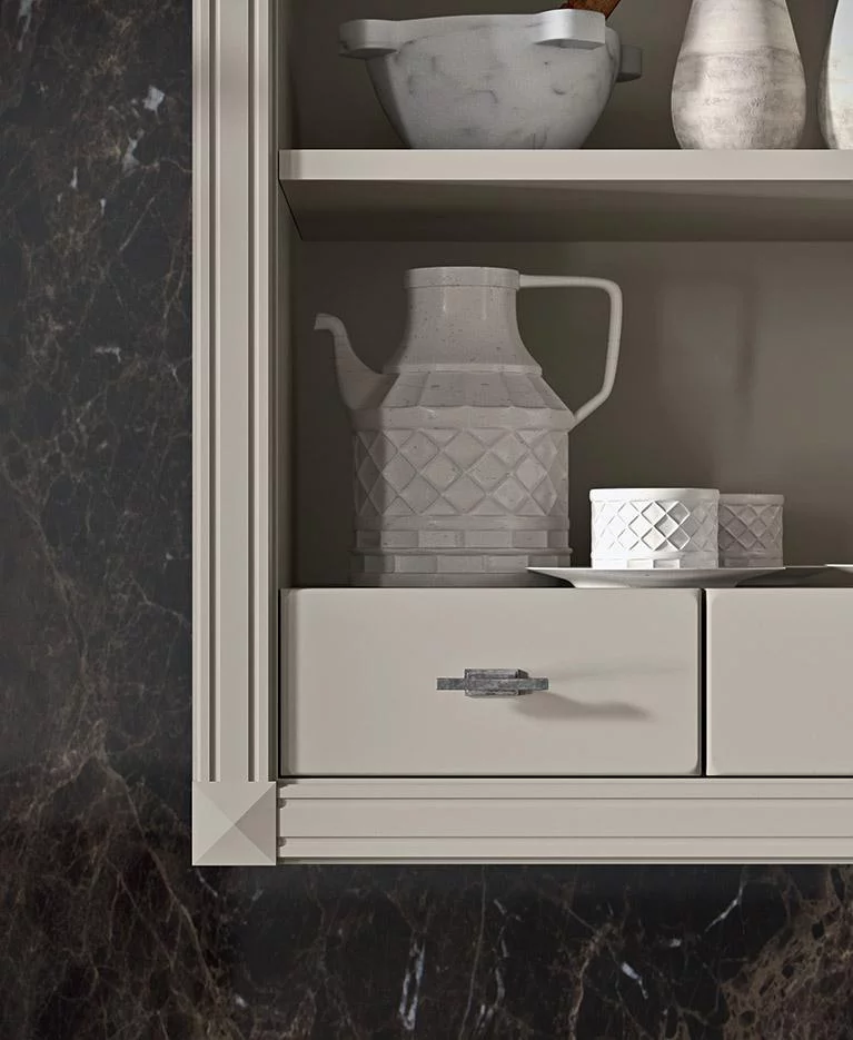 Ещё один вариант великолепной кухни Elite Interior от фабрики Astra — модель, выполненная в бежевом варианте с тёмной столешницей. Основные материалы — натуральный массив, шпон, мрамор и закаленное стекло. Изделие характеризуется рамочными фасадами, классическим венчающим карнизом, декоративными пилястрами и фризом.