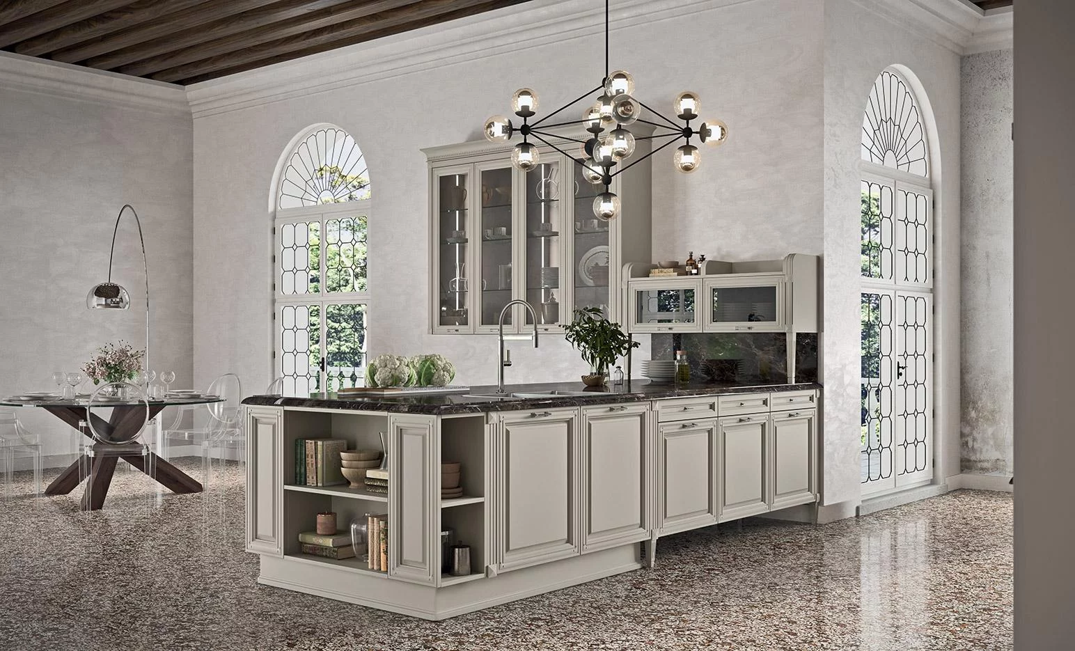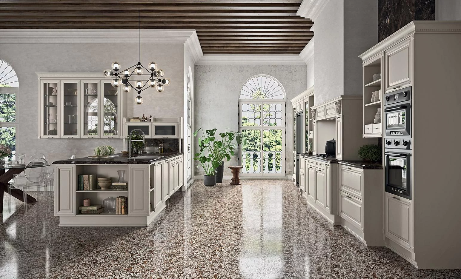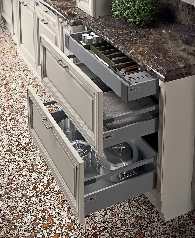 Ещё один вариант великолепной кухни Elite Interior от фабрики Astra — модель, выполненная в бежевом варианте с тёмной столешницей. Основные материалы — натуральный массив, шпон, мрамор и закаленное стекло. Изделие характеризуется рамочными фасадами, классическим венчающим карнизом, декоративными пилястрами и фризом.