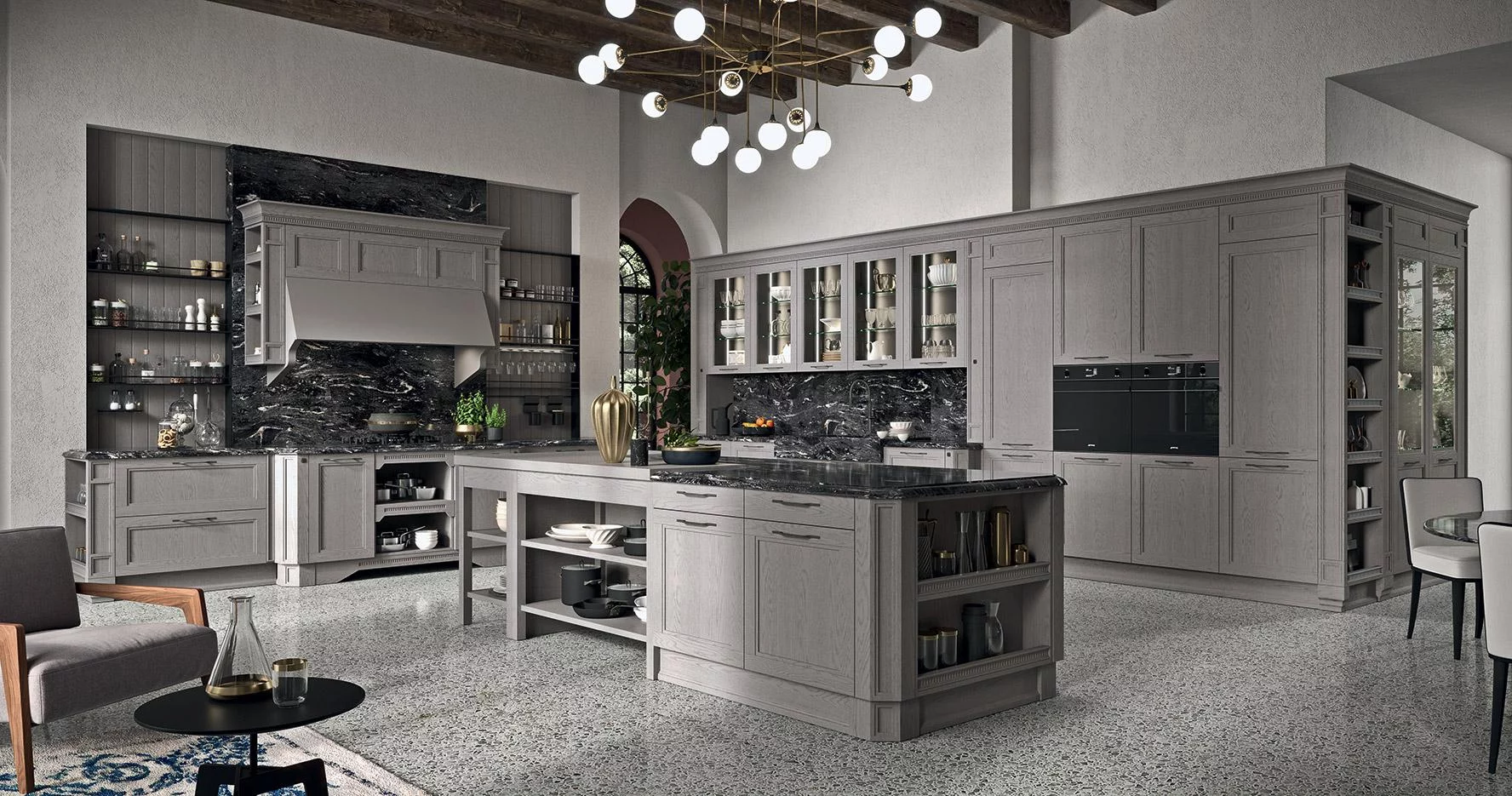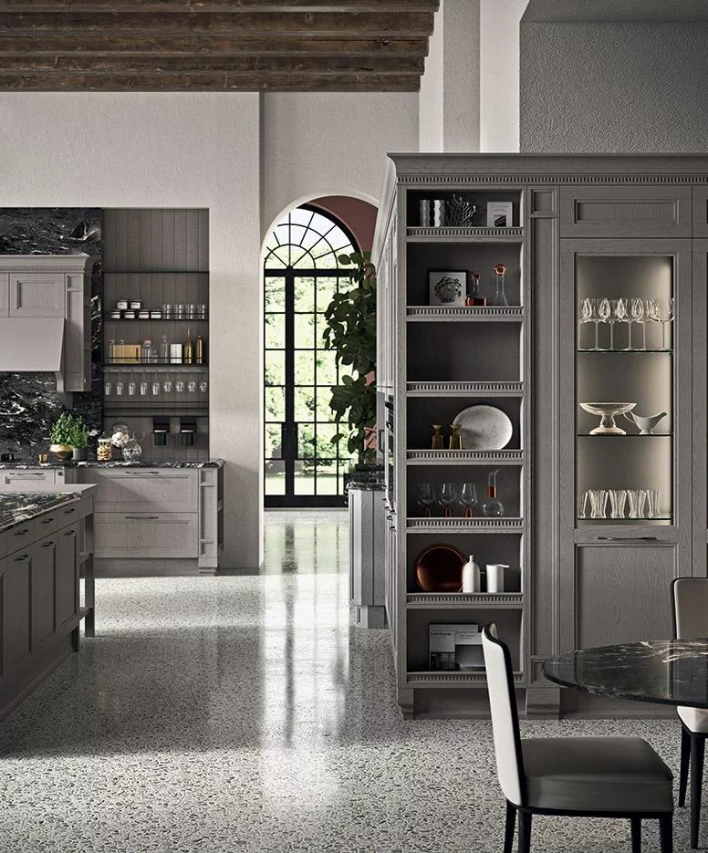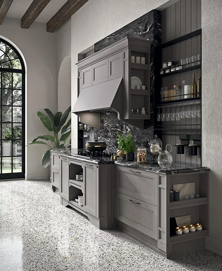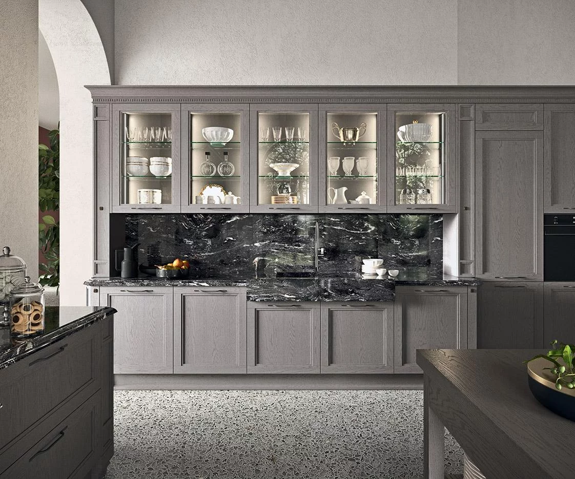 Если вы ищете функциональную кухню с уникальным цветом, то обратите внимание на модель Elite в интересном сером оттенке, от которого одновременно веет теплом и элегантностью. При её изготовлении использовалось натуральное дерево, шпон, закаленное стекло, а в качестве столешницы — мрамор.