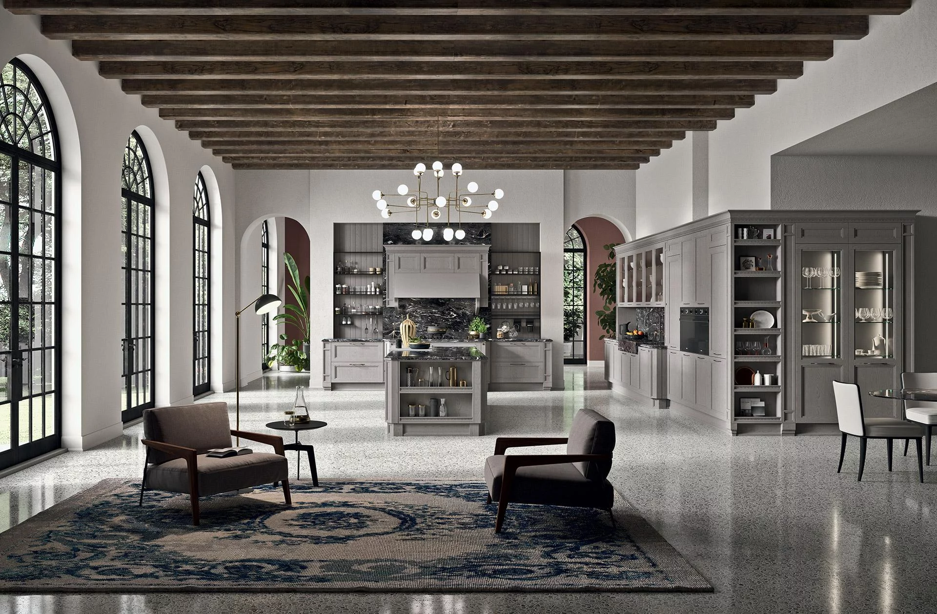 Кухня Elite состоит из рабочей области в виде тумб, подвесных ящиков, напольного шкафа, а также отдельно стоящего острова. Множество выдвигающихся модулей и открытых полок делают модель современной и эргономичной. Остров можно использовать как рабочую область, зону перекуса и дополнительный модуль хранения.