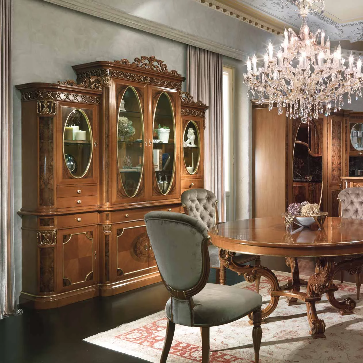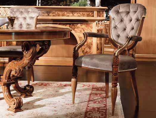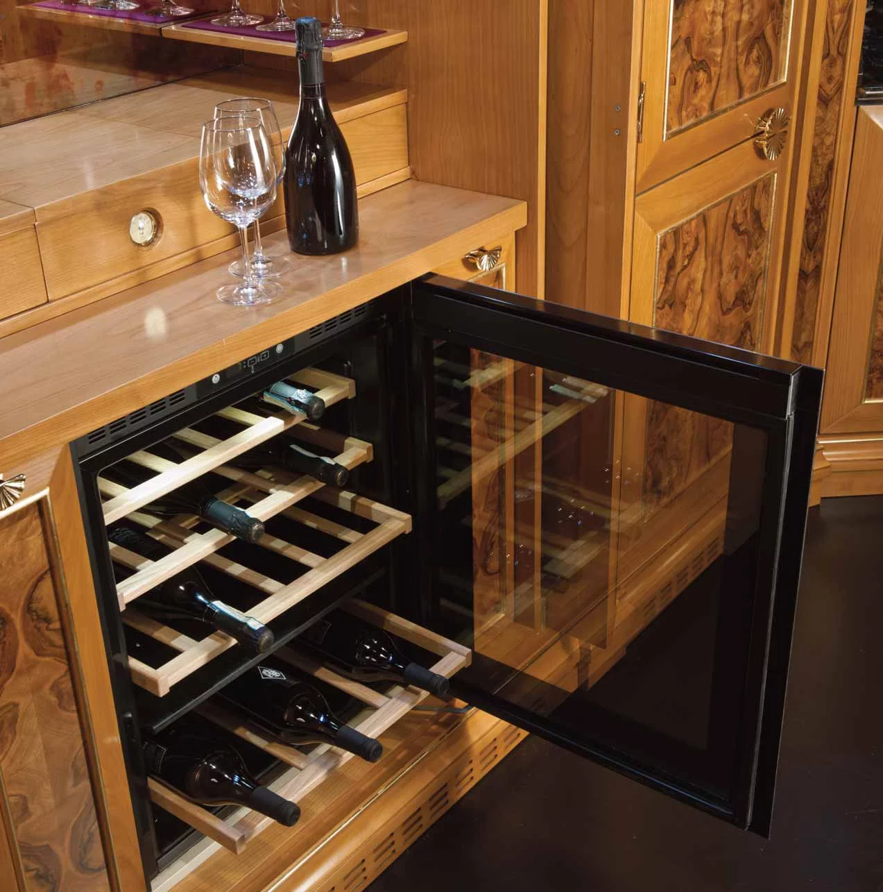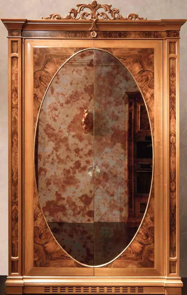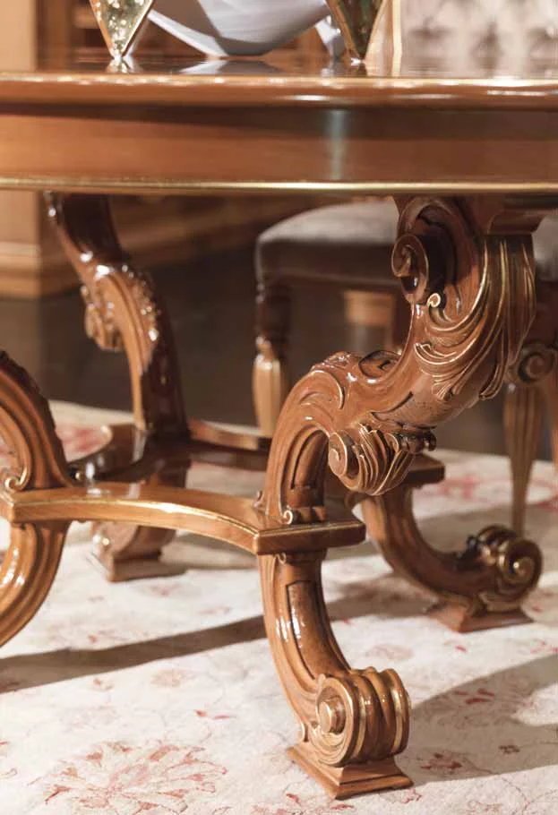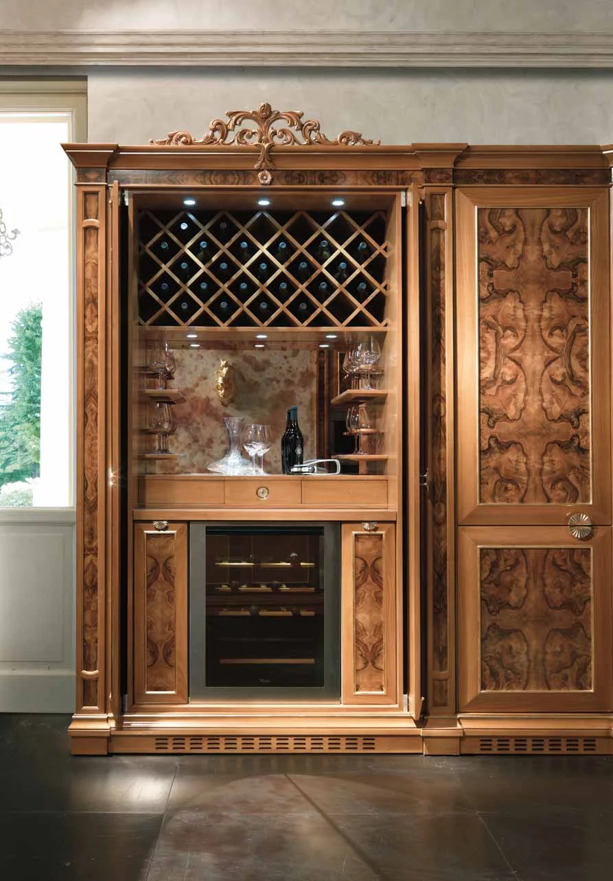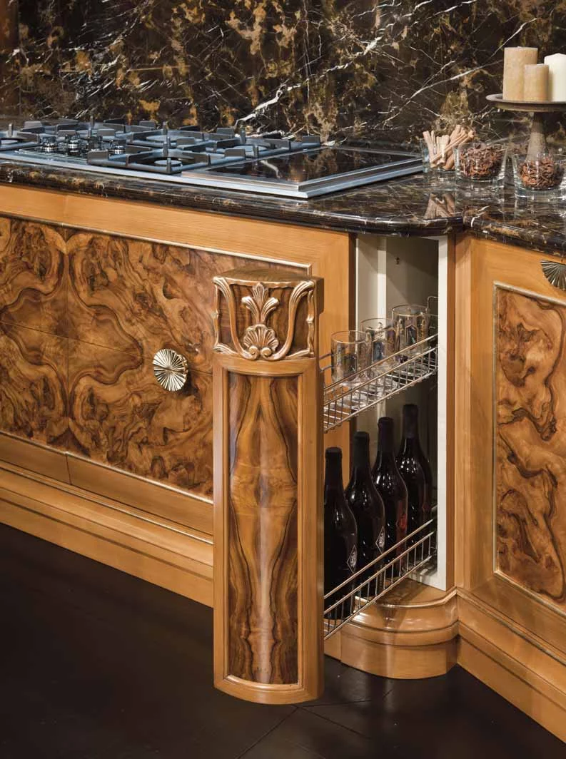 Дизайнеры фабрики Bamax, работавшие над моделью Ambra, предлагают отказаться от привычного взгляда на кухню. В их исполнении это вовсе не мини-фабрика по производству пищи, а место, в котором надлежит наслаждаться жизнью в обстановке роскоши и неги. Искусно обработанная древесина вишни и ореха богато украшена изящной резьбой, богемское стекло и позолоченная лепнина довершают образ дворцовой мебели. Плавные, обтекающие пространство линии, овалы зеркал и скруглённые формы острова выглядят весьма элегантно. Небольшие изящные ручки в виде золотых листьев перекликаются с золочеными элементами на фасаде и карнизах. Специально для хранения дорогих вин и сигар предусмотрены шкафчики и ящики с особым температурным режимом.