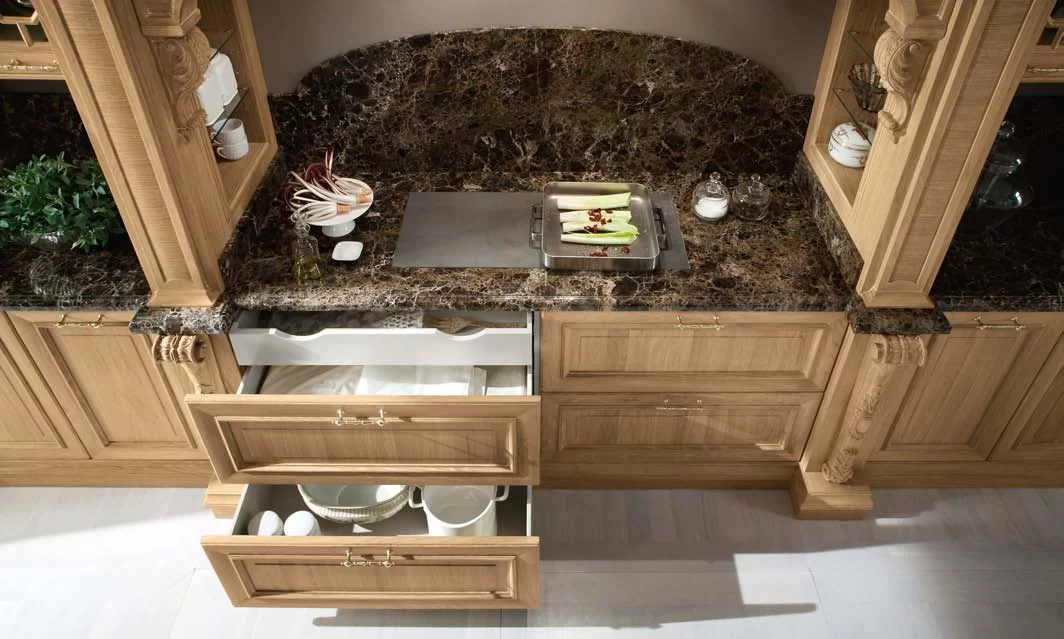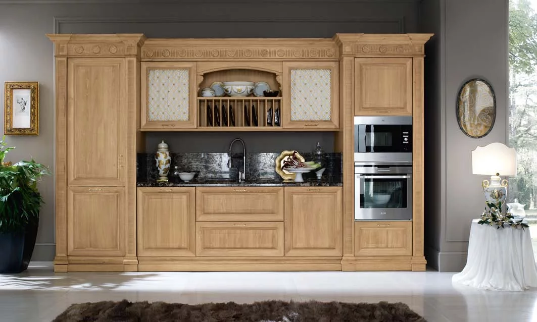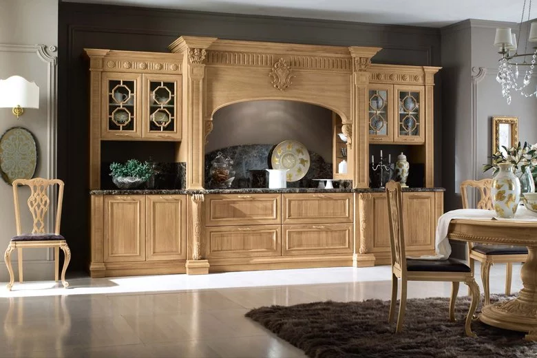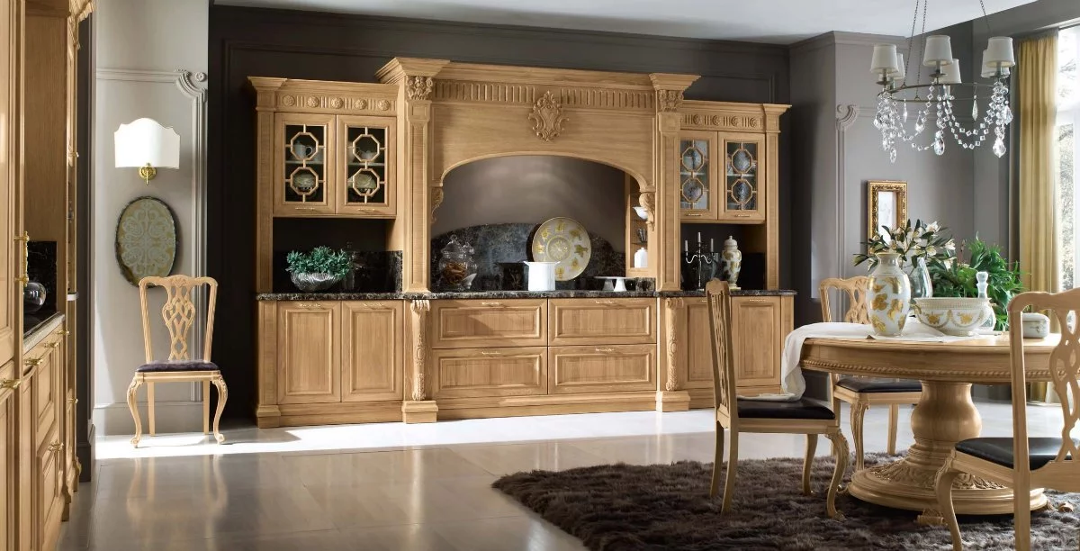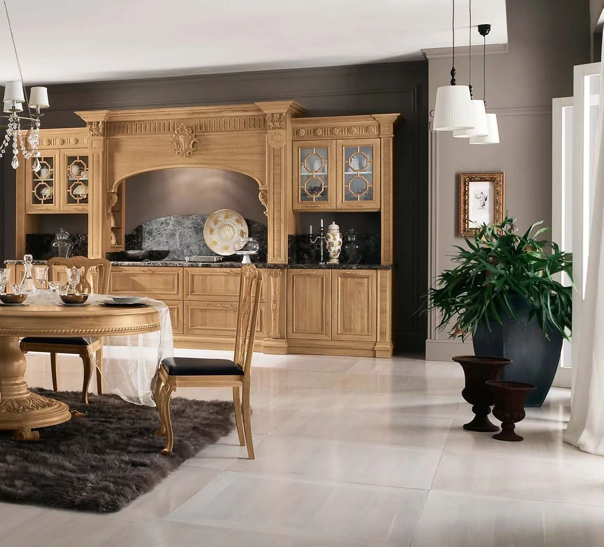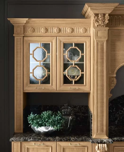 Венеция — город, который удивляет и восхищает тех, кто видит его впервые, и не перестает дарить всё новые эмоции и впечатления. То же самое можно сказать и о кухне Venezia от Bamax – этот классический гарнитур будет вдохновлять и радовать долгие годы. Выполненные из брашированного дуба фасады покрыты натуральным глянцевым лаком, а искусная резьба подчёркивает величественность линий. Ненавязчивая позолота изящно оттеняет благородный цвет слоновой кости. Чёрный мрамор на рабочей поверхности и на повторяющем очертания портала фартуке придает композиции роскошный блеск.