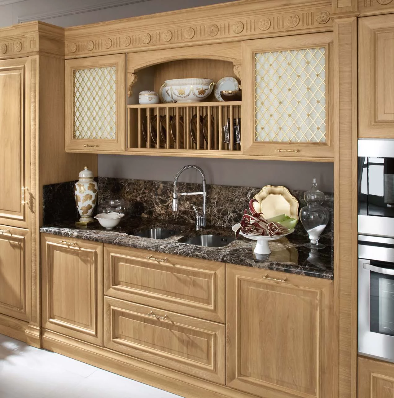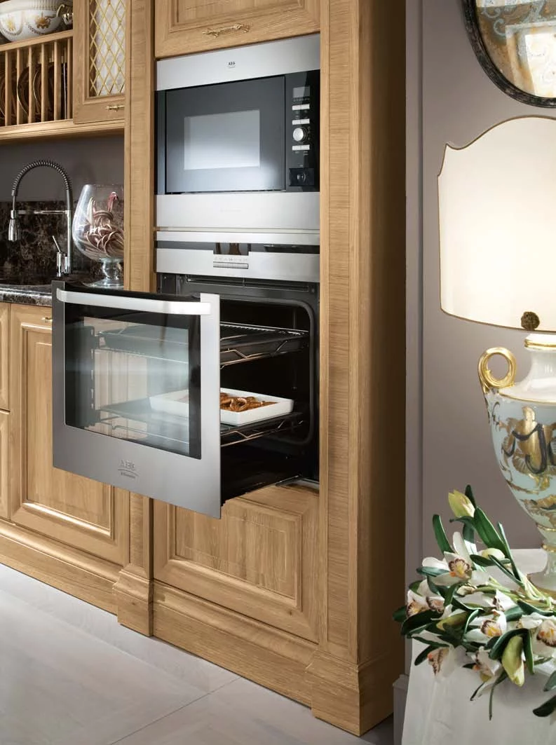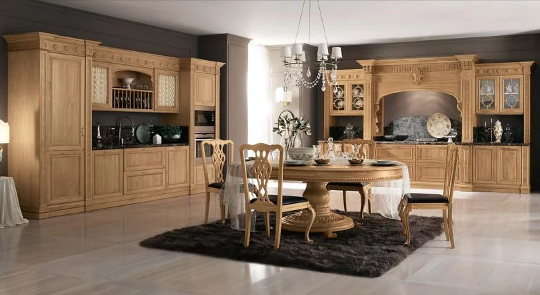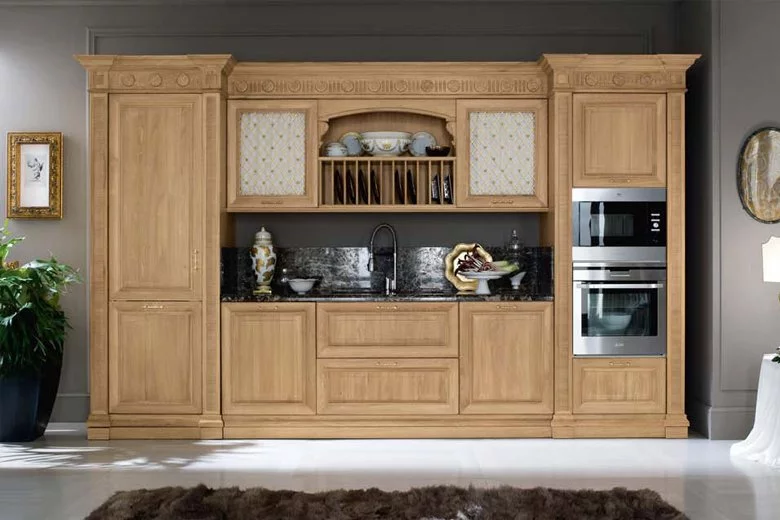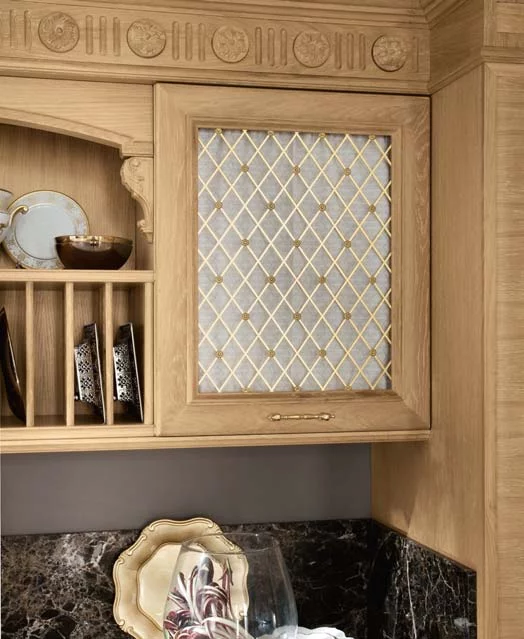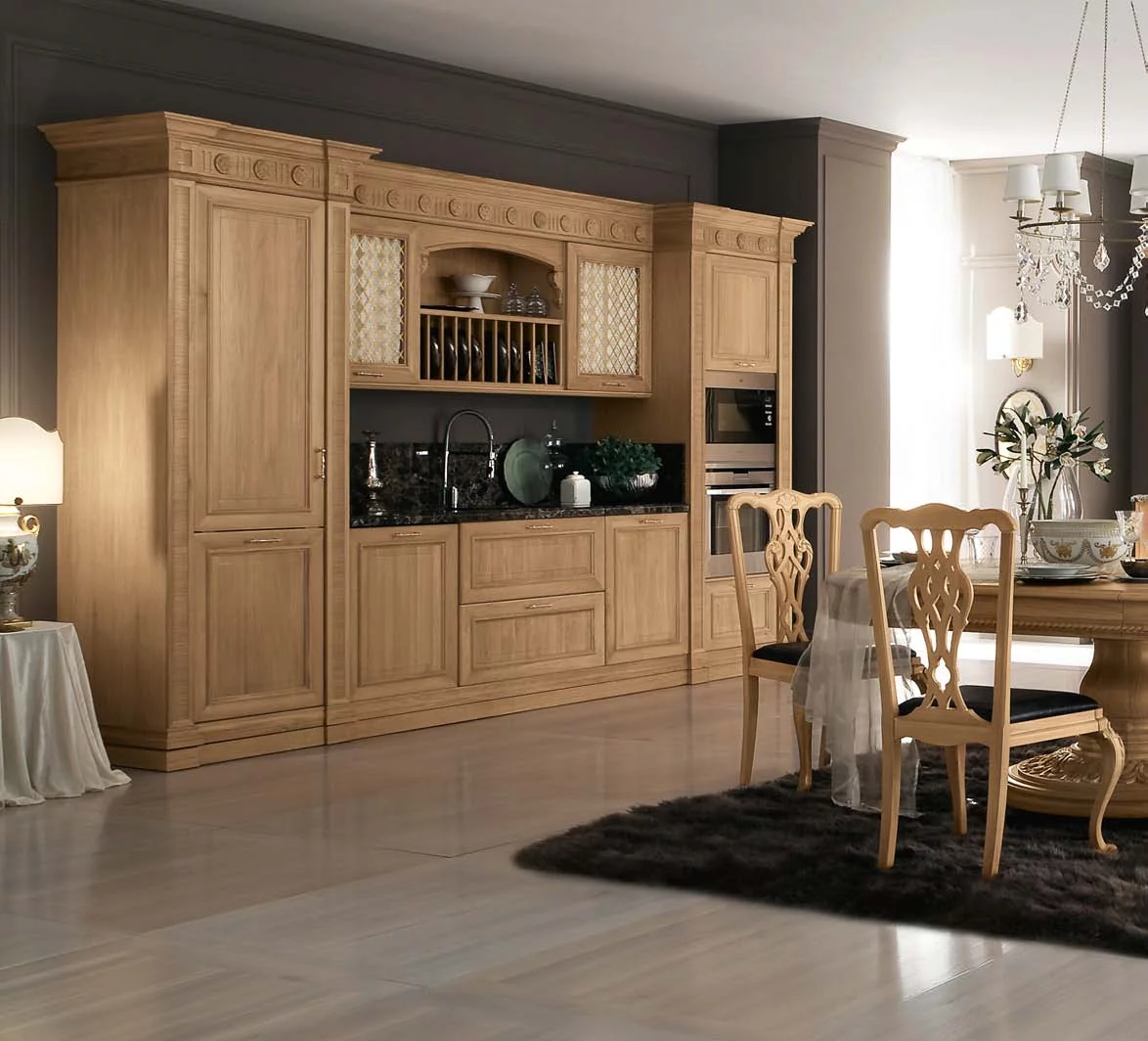 Венеция — город, который удивляет и восхищает тех, кто видит его впервые, и не перестает дарить всё новые эмоции и впечатления. То же самое можно сказать и о кухне Venezia от Bamax – этот классический гарнитур будет вдохновлять и радовать долгие годы. Выполненные из брашированного дуба фасады покрыты натуральным глянцевым лаком, а искусная резьба подчёркивает величественность линий. Ненавязчивая позолота изящно оттеняет благородный цвет слоновой кости. Чёрный мрамор на рабочей поверхности и на повторяющем очертания портала фартуке придает композиции роскошный блеск.