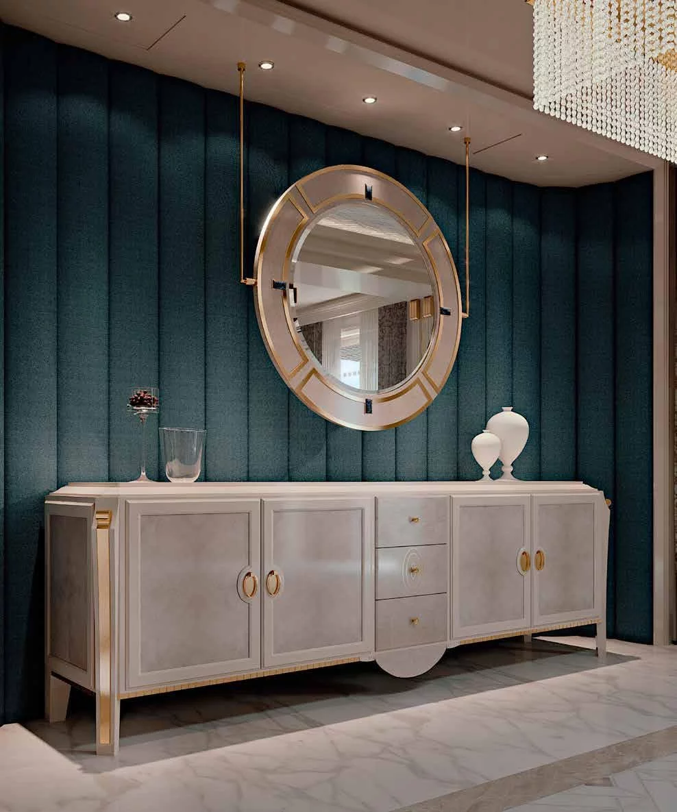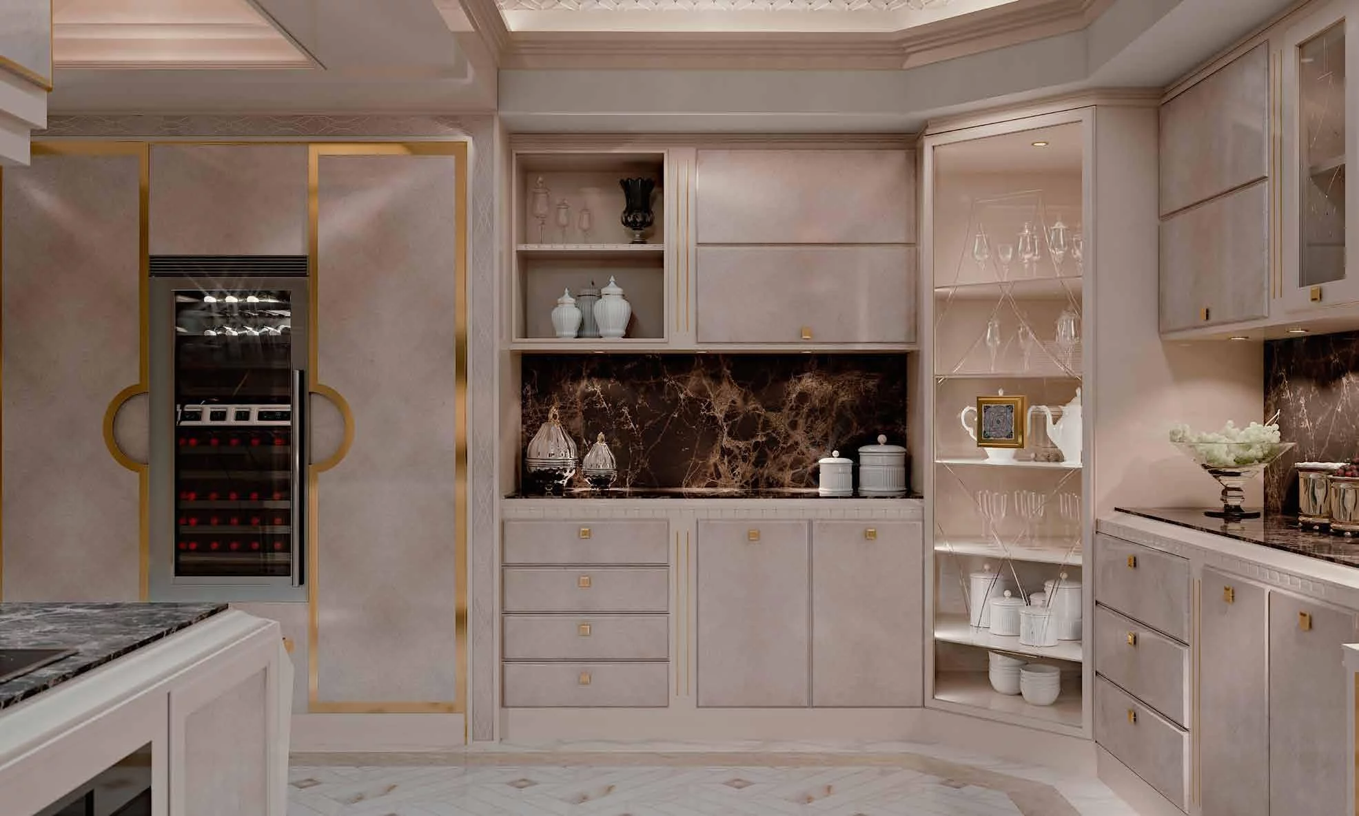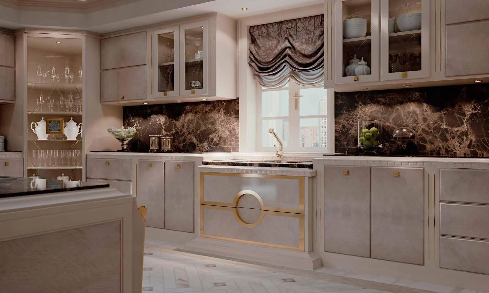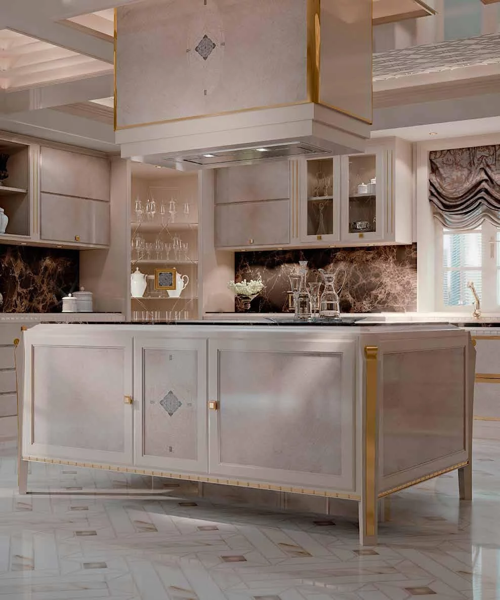 Модель выполнена из натурального дерева с элементами шпона, латуни и прочного закаленного стекла. Варочная панель расположена на обособленном острове, сверху которого монтируется не менее изысканная вытяжка. Кроме этого, кухня Cucina Cafe Des Arts In Erable комплектуется множеством массивных шкафов, скрывающие всю необходимую утварь и бытовую технику, выдвижными полочками, маленькими шкафчиками и боковыми стеклянными витринами, демонстрирующими красивую посуду.