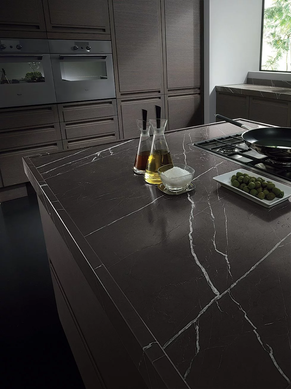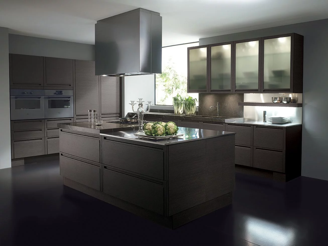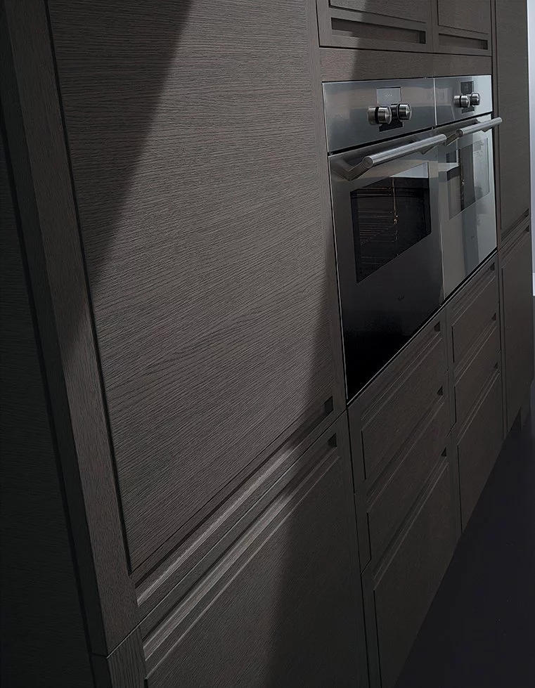 Кухни Milano от Biefbi сочетают в себе эстетику натуральных природных материалов и лаконичный минималистский стиль. Он проявляется в сдержанных цветах, четкой конструкции, отсутствии ручек, использовании элементов из металла, прямых линий, объединяющих всю композицию. Функцию ручек выполняют горизонтальные выемки, вырезанные прямо в деревянной рамке, что не только подчеркивает строгость композиции, но и создает удобство в пользовании этой мебелью. Гарнитуры имеют фасад из серого натурального дуба и рельефную филёнку, покрытую шпоном из дуба. Для навесных шкафов используется серое стекло, оформленное деревянной рамкой. Оно немного смягчает сдержанный тон кухни и придает ей оригинальный вид.