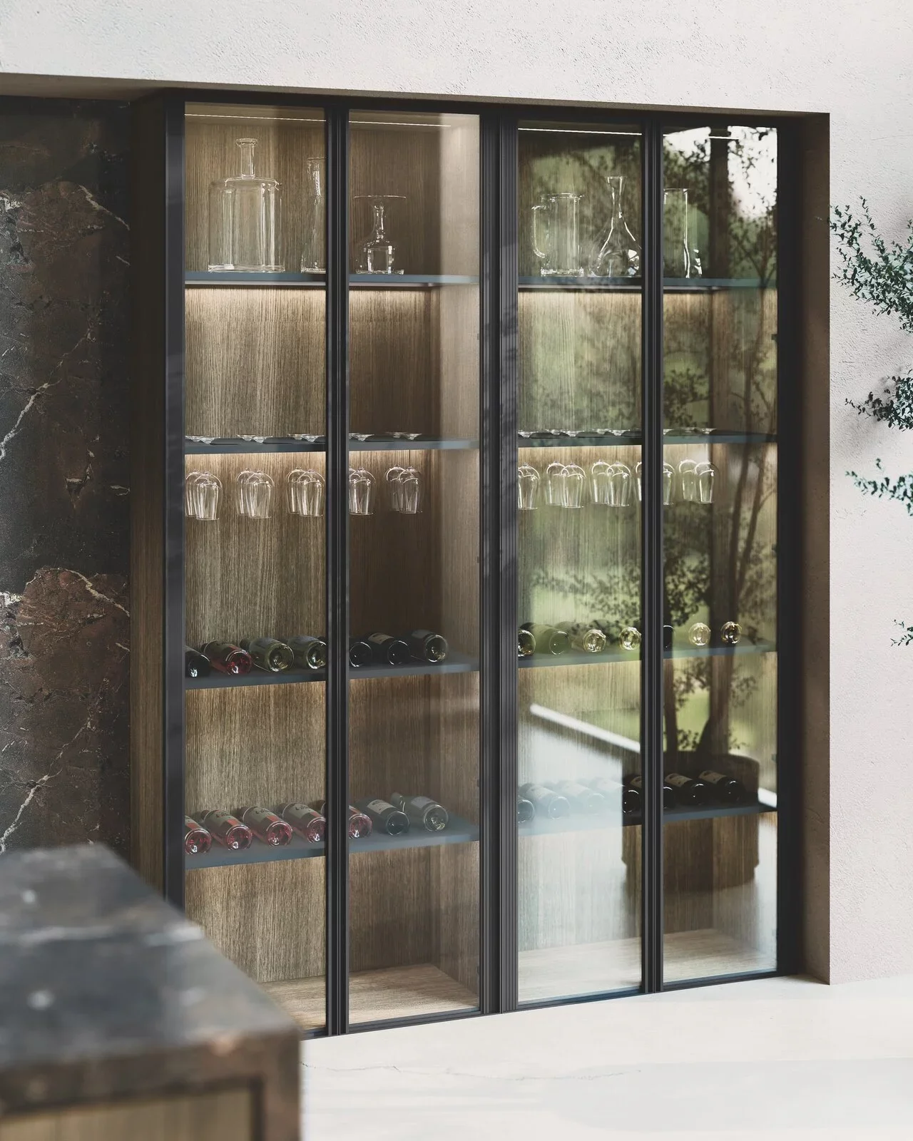Базы Avola из дуба Grigio Pepe в чёрной алюминиевой рамке играют на контрасте света и тени, а витрины Miles добавляют лёгкости и воздушности. Глубокий цвет Cacao Orinoco в колоннах и навесных модулях усиливает выразительность композиции.