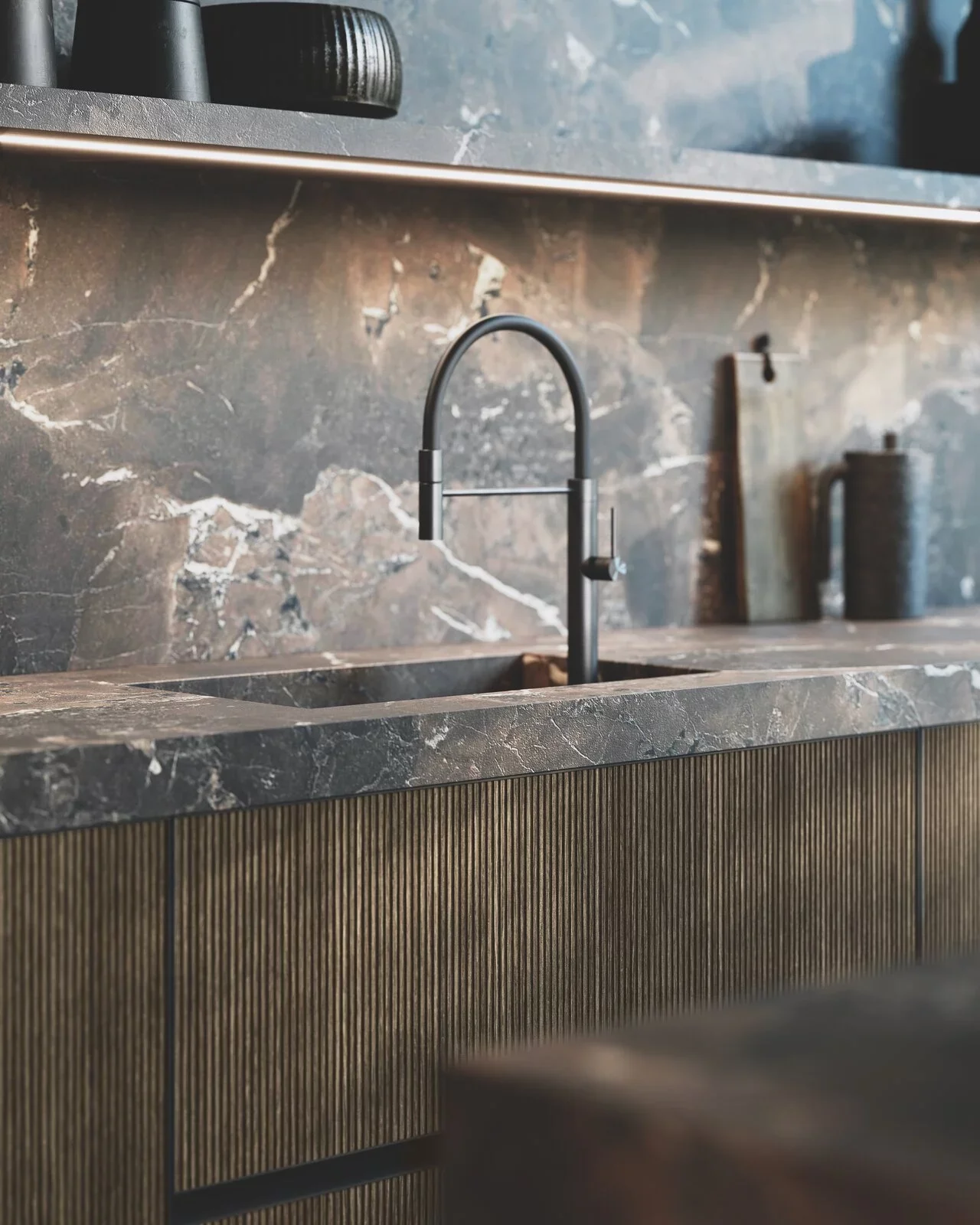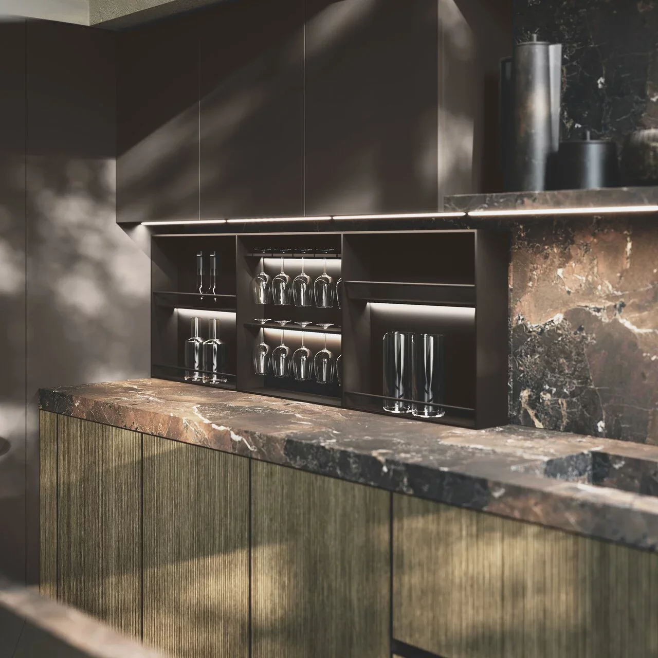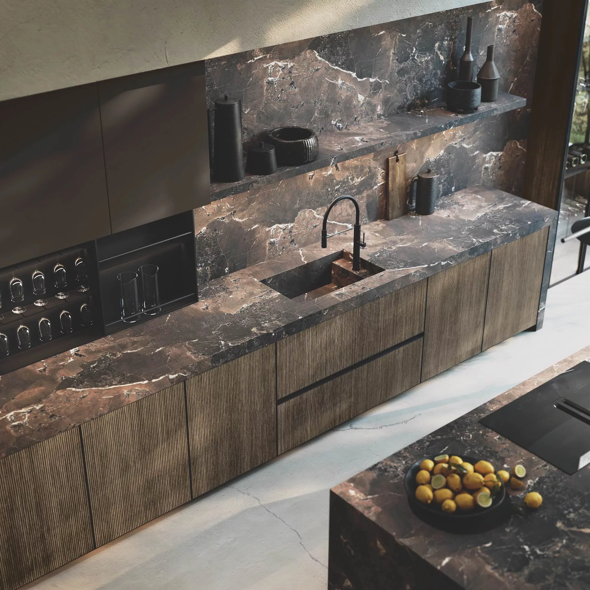 Детали Avola поражают продуманностью: встроенная раковина из керамогранита, утончённые полки, идеально выверенные линии под углом 45˚. Каждая деталь подчёркивает итальянское мастерство и делает кухню не только функциональной, но и эмоционально наполненной.