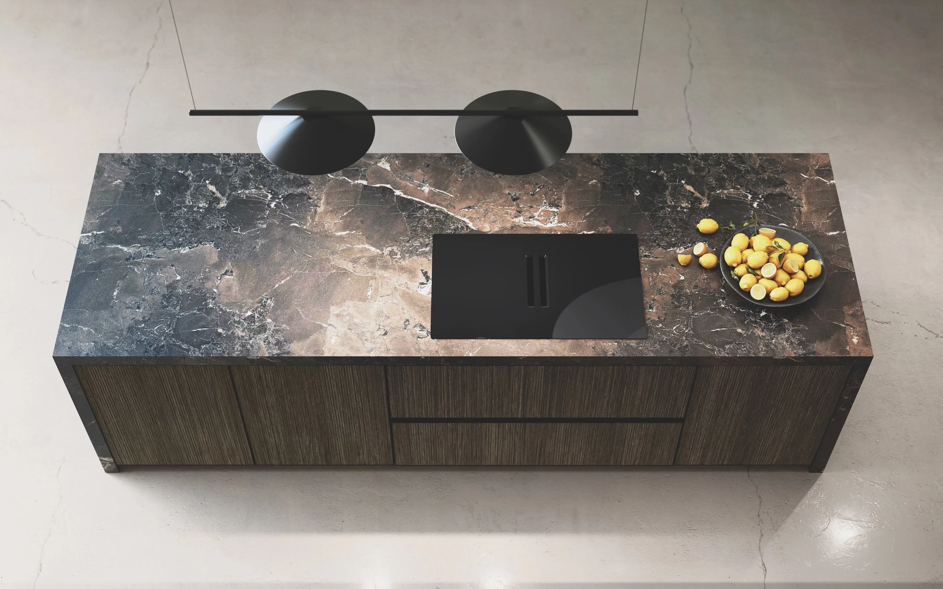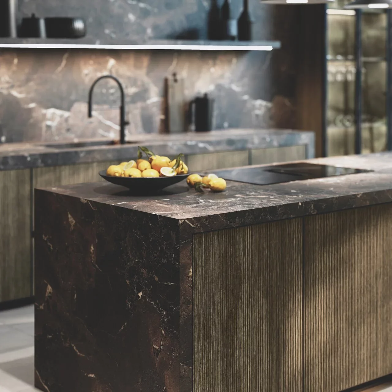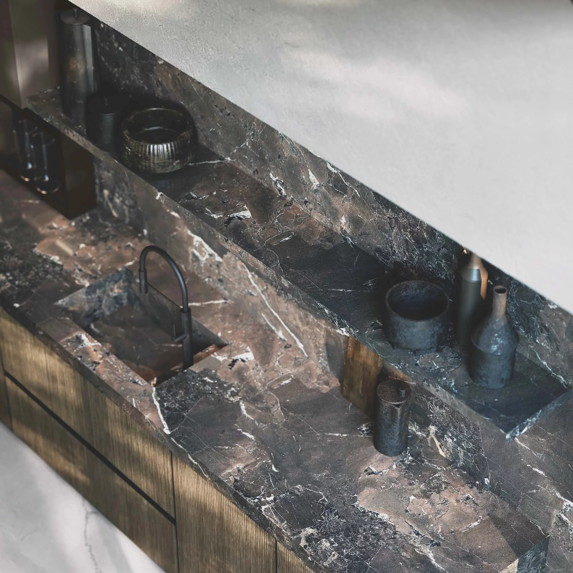 Коллекция Avola — это не просто кухня, а история, рассказанная языком природы. В её основе — керамогранит Breccia Imperiale, чьи тёплые оттенки создают атмосферу уюта и элегантности. Массивные столешницы толщиной 8 см, изящно переходящие на боковые поверхности, превращают рабочие зоны в настоящее произведение искусства.