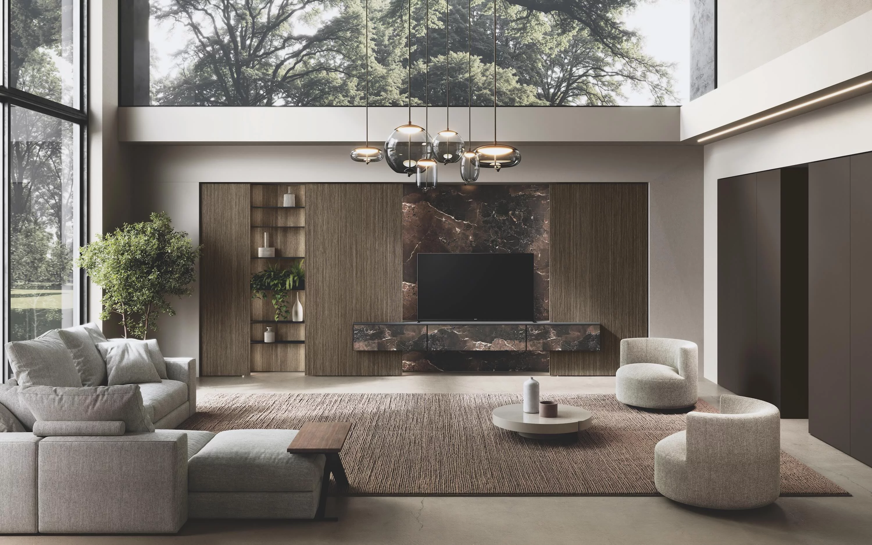 Интерьер гостиной плавно продолжает эстетику кухни: подвесные базы из керамогранита, колонны из дуба Grigio Pepe и скрытая панель Mini Leaf создают атмосферу утончённого минимализма.