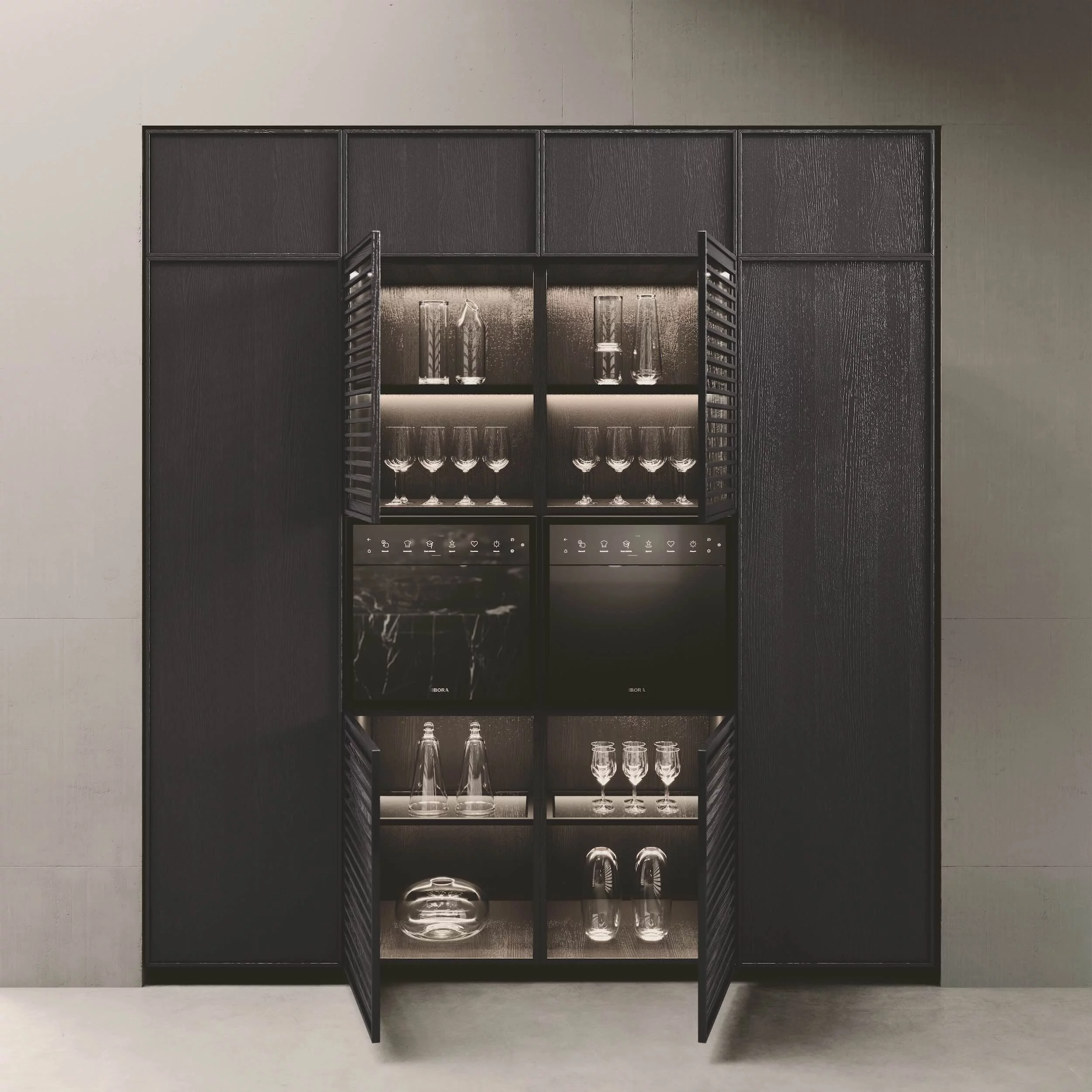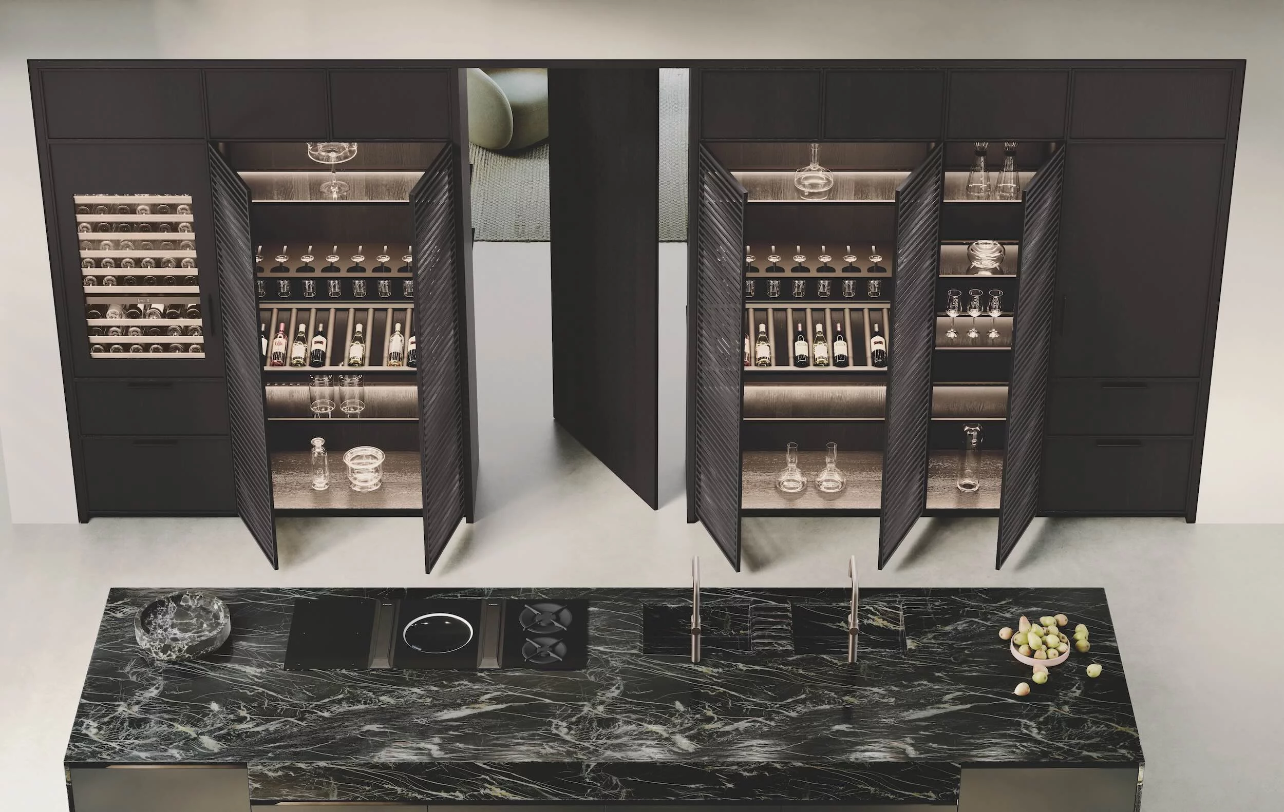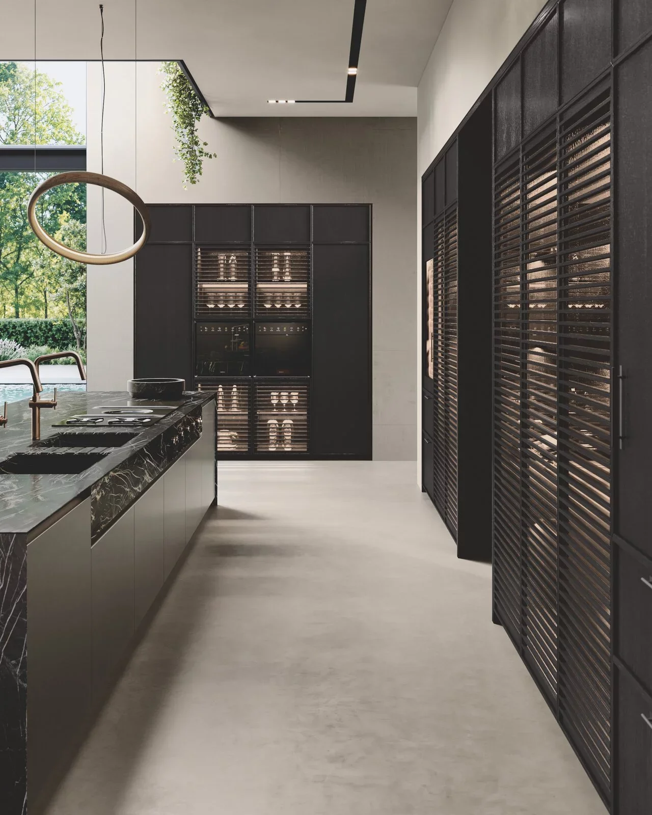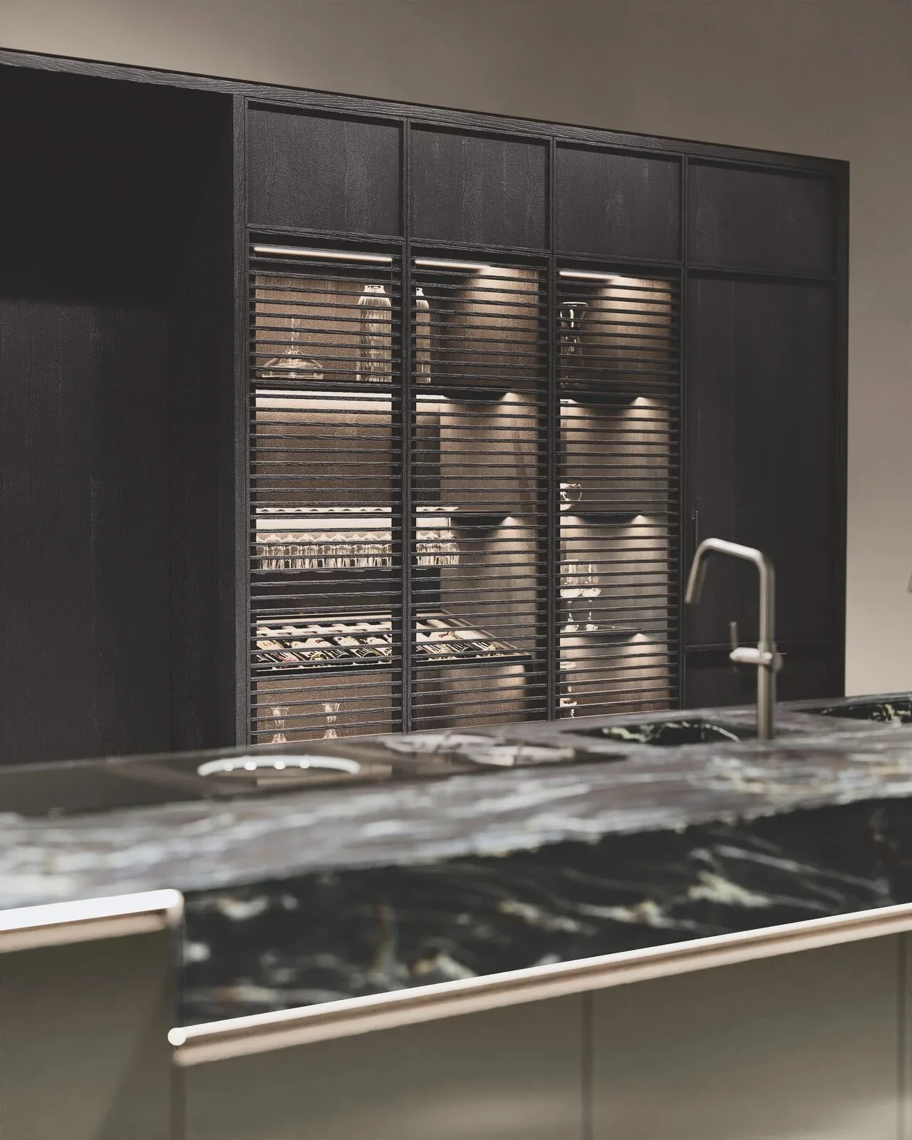 Фоном для острова выступает колонада Hily в деревянной рамке и витрины Zen. Их ритмичные планки скрывают стекло fumé, создавая игру света и тени, и в то же время открывают доступ к продуманным системам хранения. Каждая деталь продумана до совершенства: от фасадов Zen с лаконичным матовым покрытием Nero Traffico и дуба Rovere Black до аккуратных угловых соединений камня под 45°.