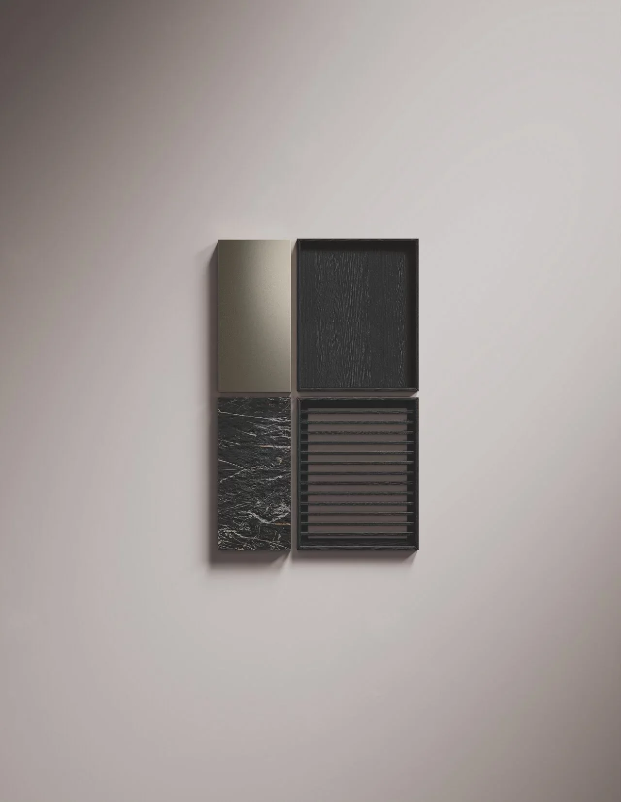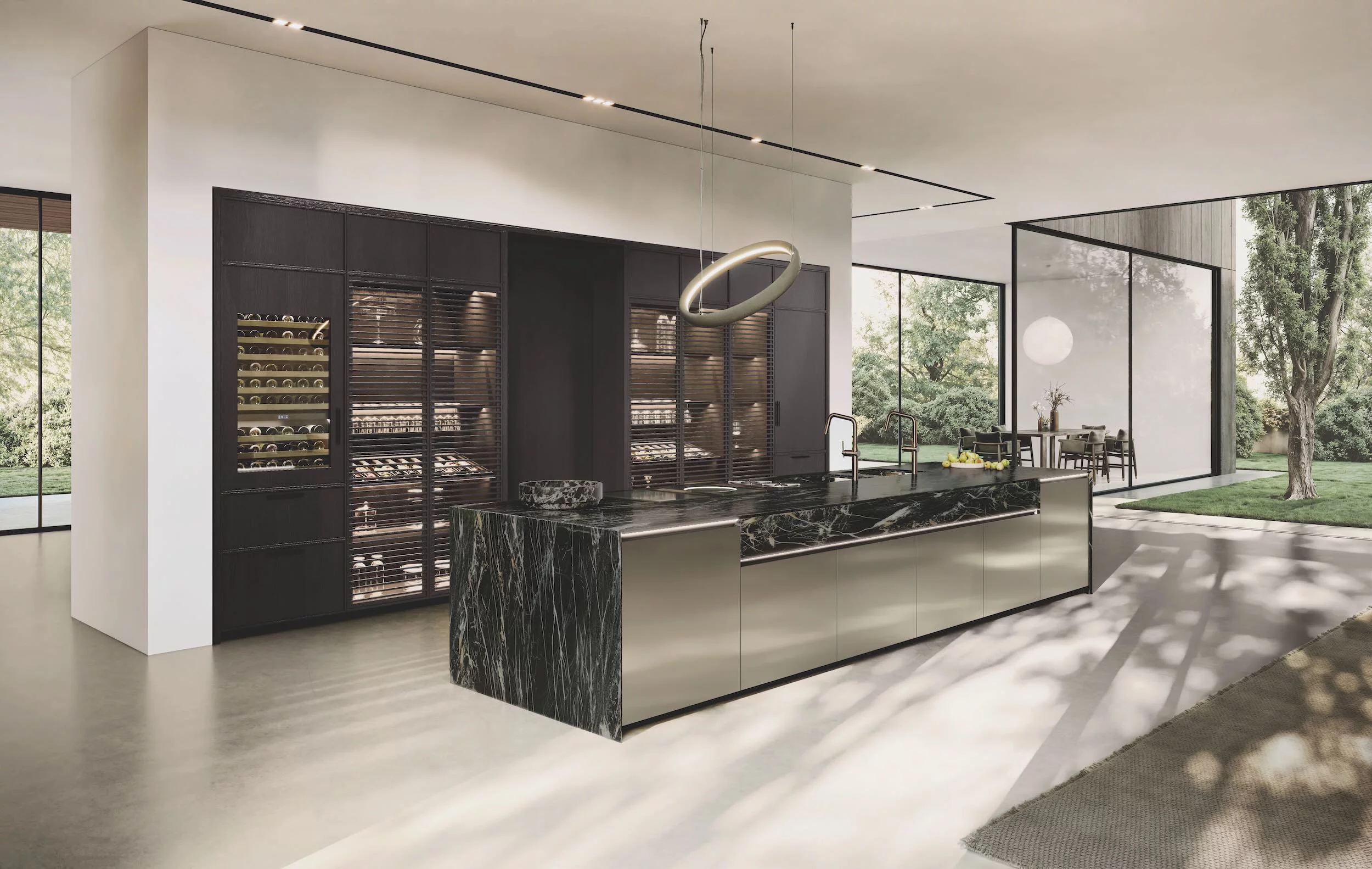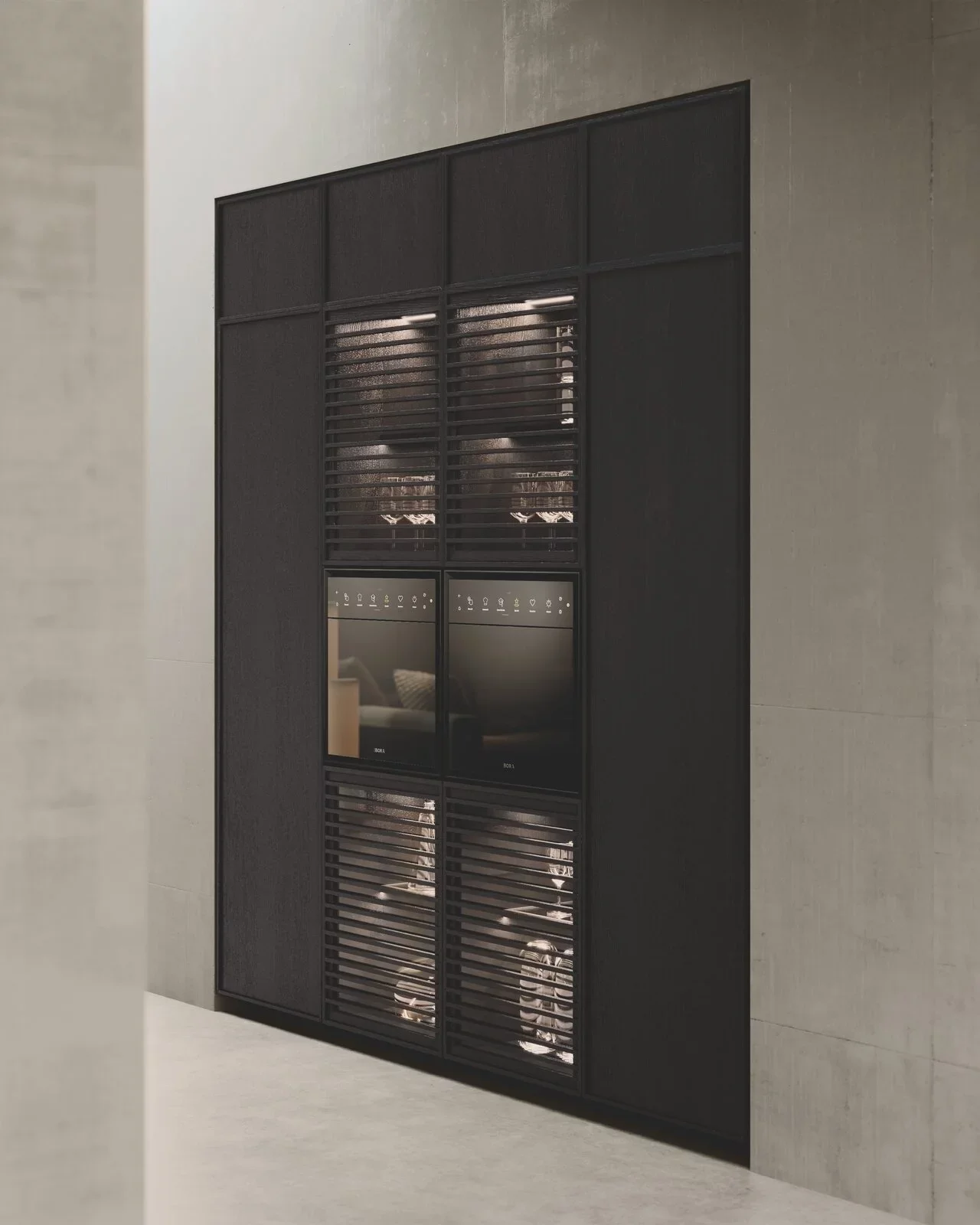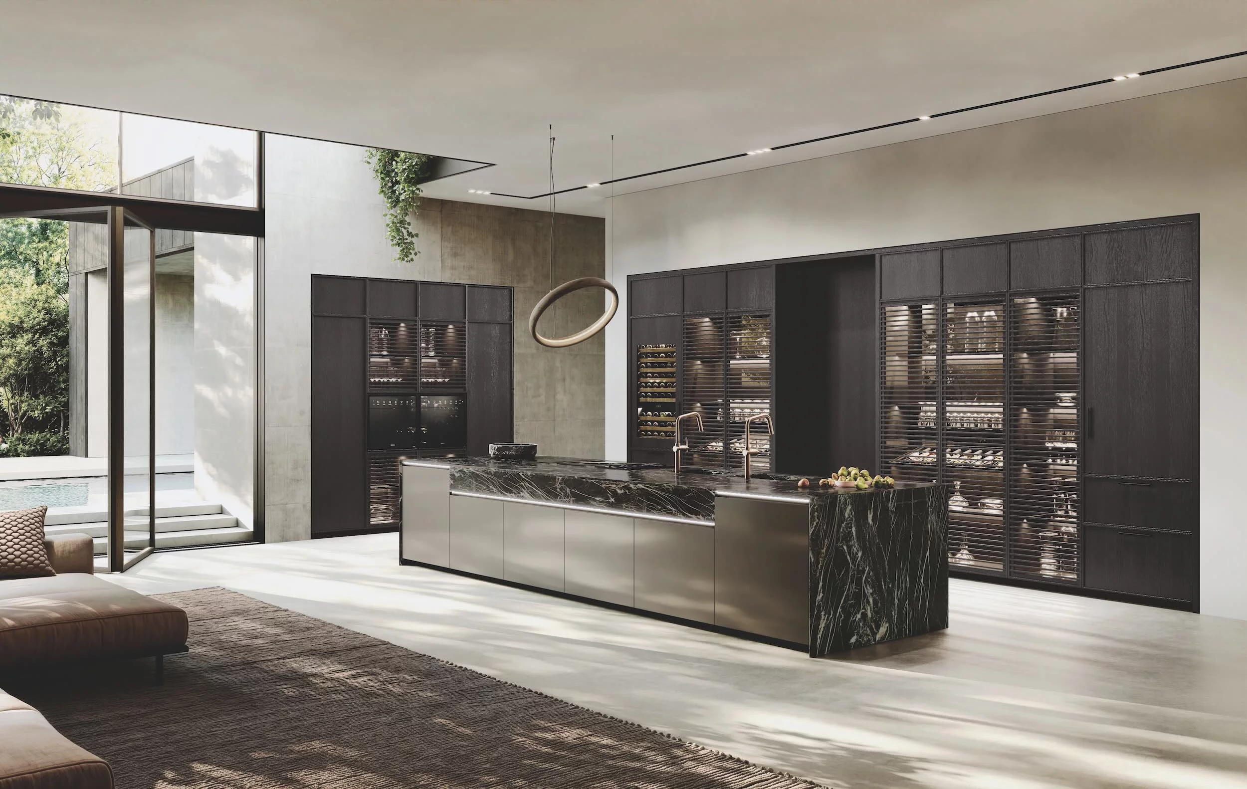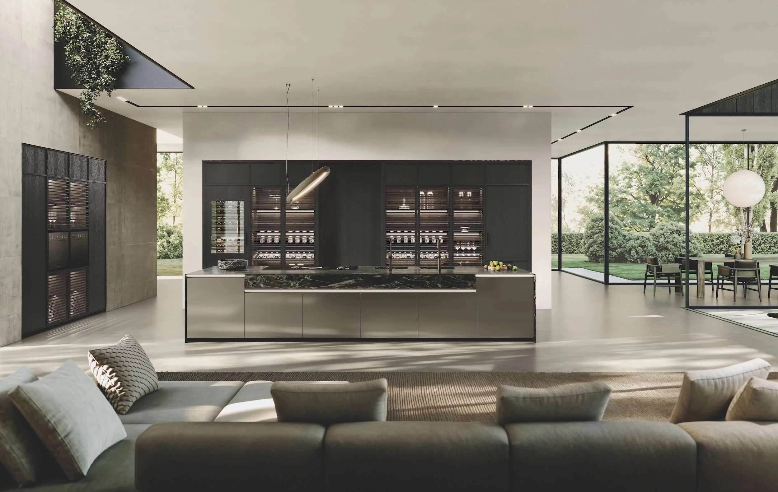Фоном для острова выступает колонада Hily в деревянной рамке и витрины Zen. Их ритмичные планки скрывают стекло fumé, создавая игру света и тени, и в то же время открывают доступ к продуманным системам хранения. Каждая деталь продумана до совершенства: от фасадов Zen с лаконичным матовым покрытием Nero Traffico и дуба Rovere Black до аккуратных угловых соединений камня под 45°.