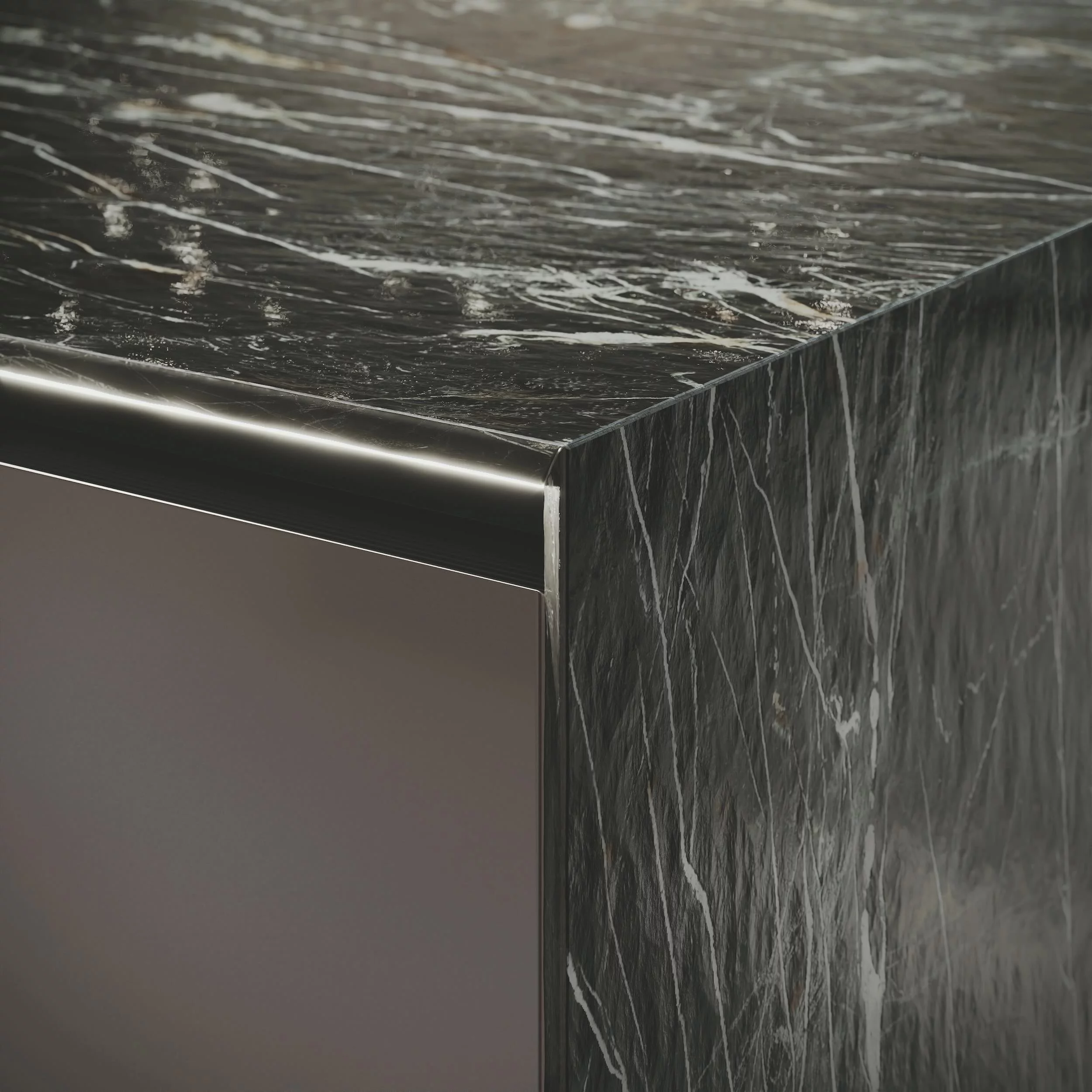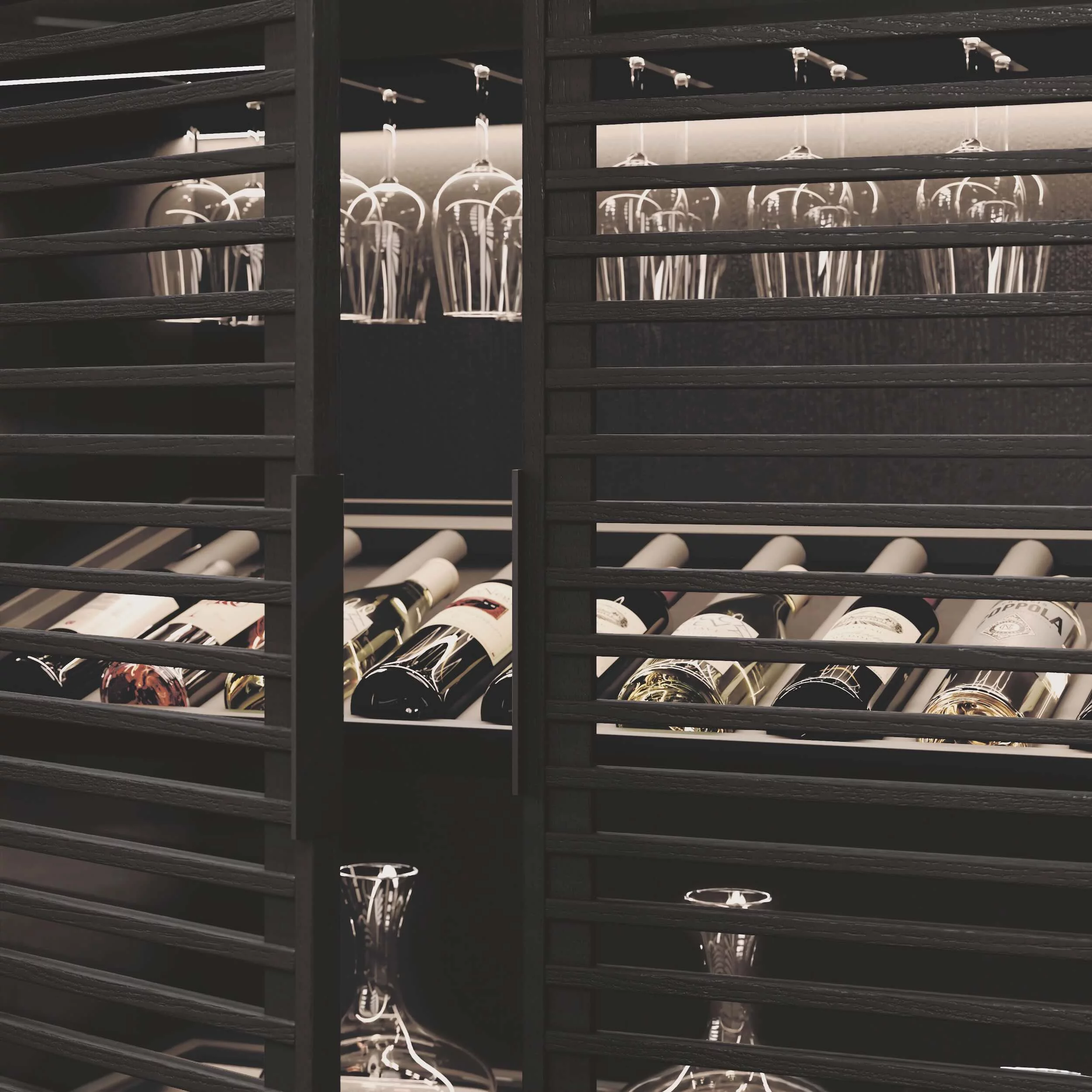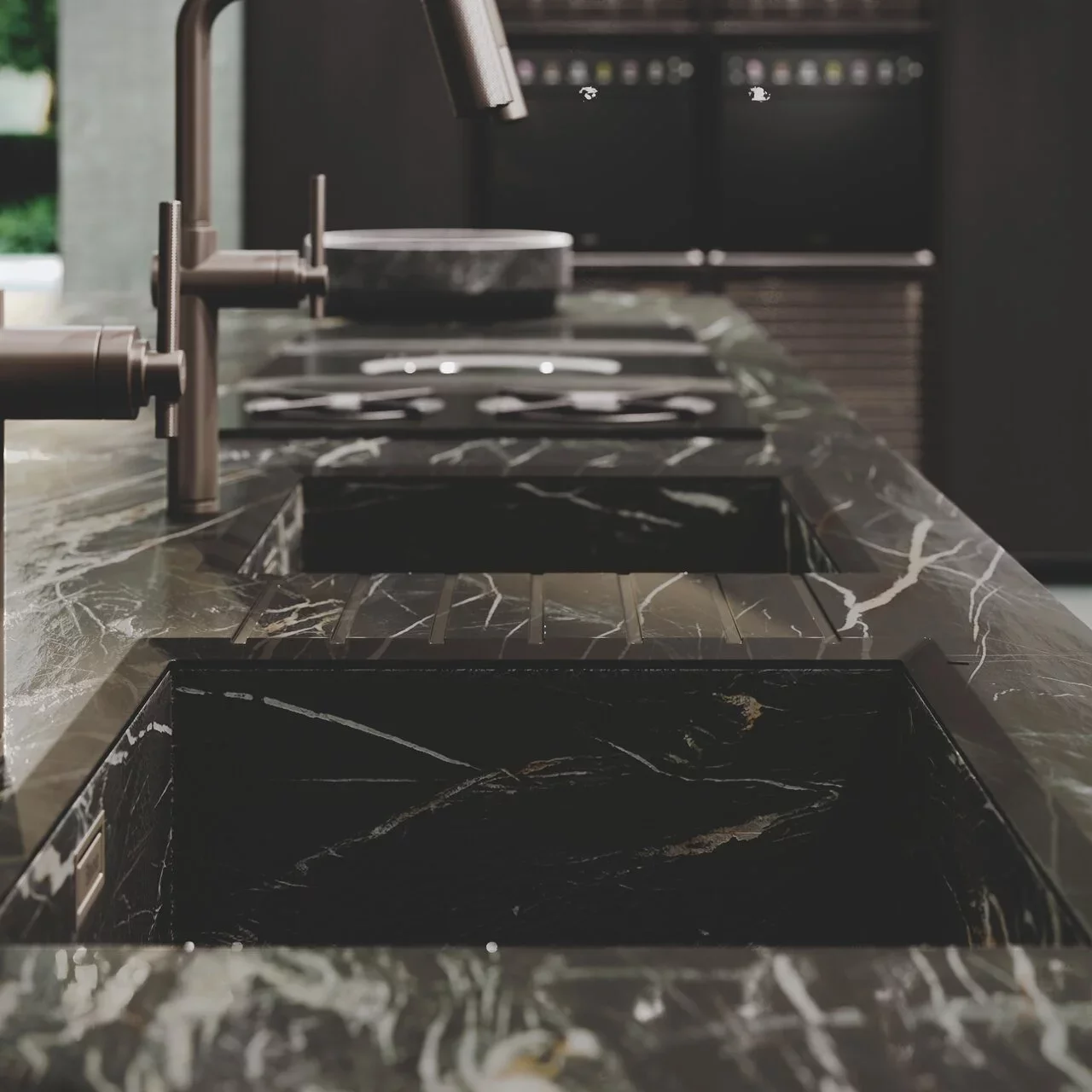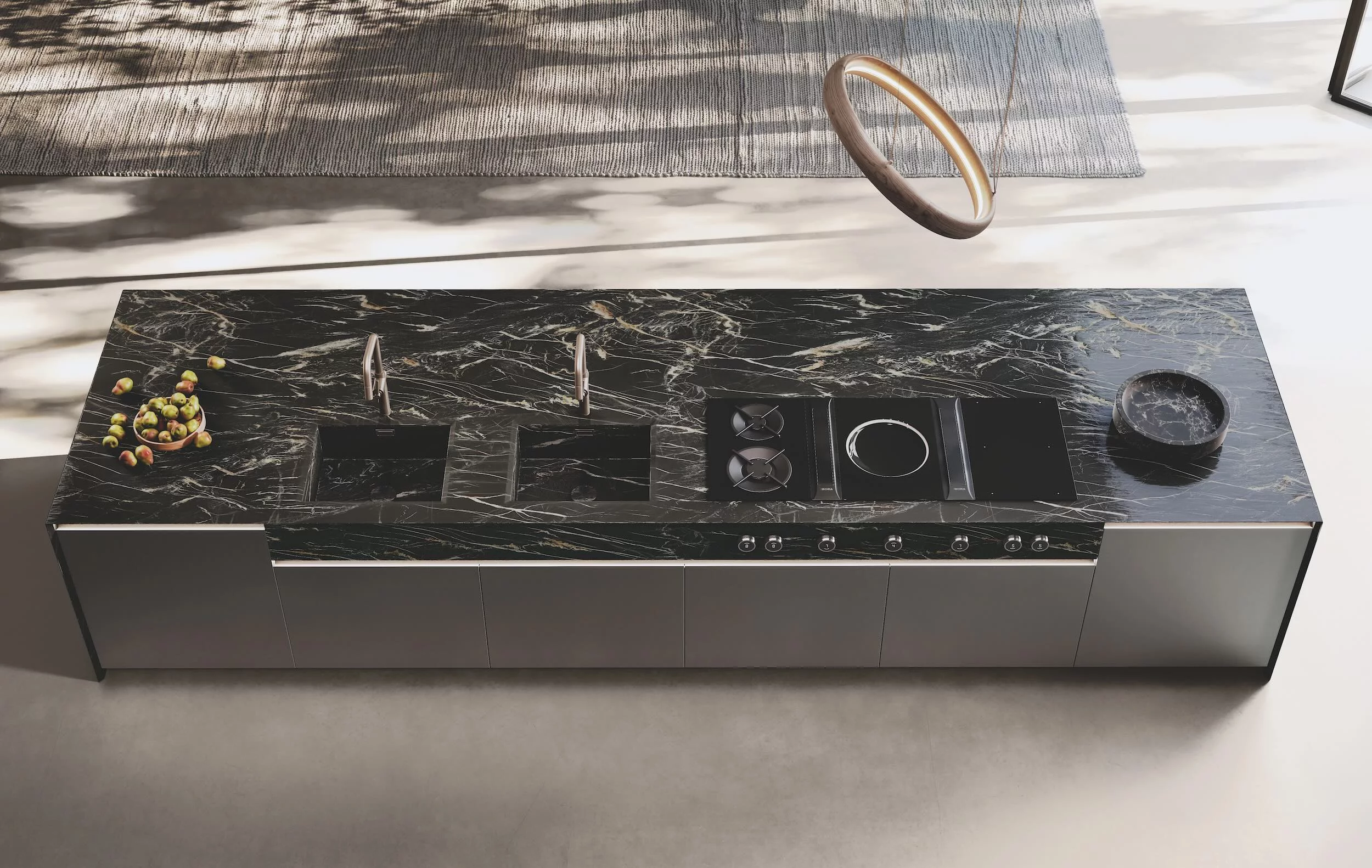 Фоном для острова выступает колонада Hily в деревянной рамке и витрины Zen. Их ритмичные планки скрывают стекло fumé, создавая игру света и тени, и в то же время открывают доступ к продуманным системам хранения. Каждая деталь продумана до совершенства: от фасадов Zen с лаконичным матовым покрытием Nero Traffico и дуба Rovere Black до аккуратных угловых соединений камня под 45°.
