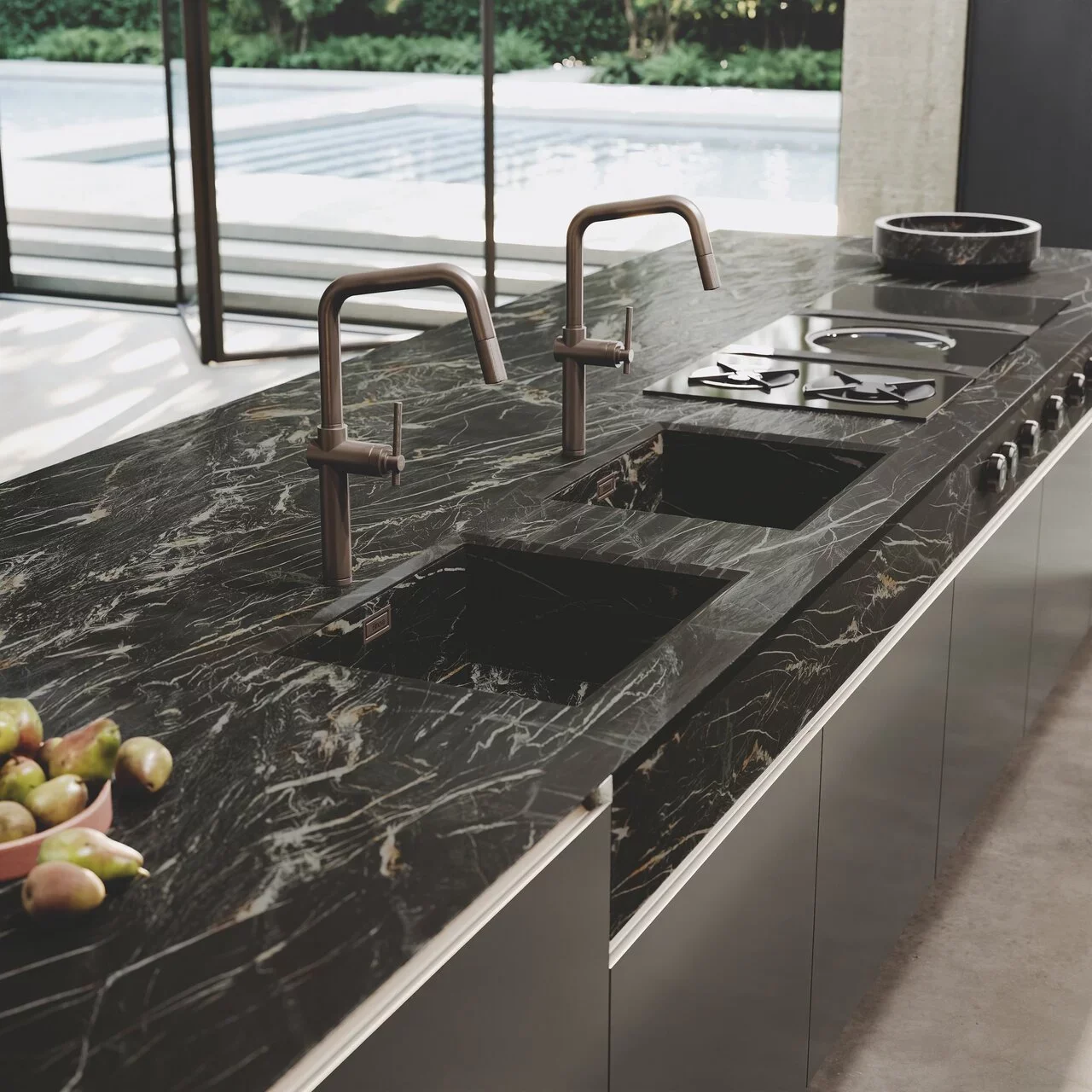 Центром композиции выступает остров Bluna — сердце кухни и сцена для гастрономических экспериментов. Столешница из натурального камня Quarzite Belvedere в чёрных оттенках и фасады в изысканном цвете Dakhìa Beige образуют утончённый контраст. Встроенный LED-профиль gola emme не только подчеркивает линии, но и превращает рабочую зону в настоящую арт-инсталляцию.