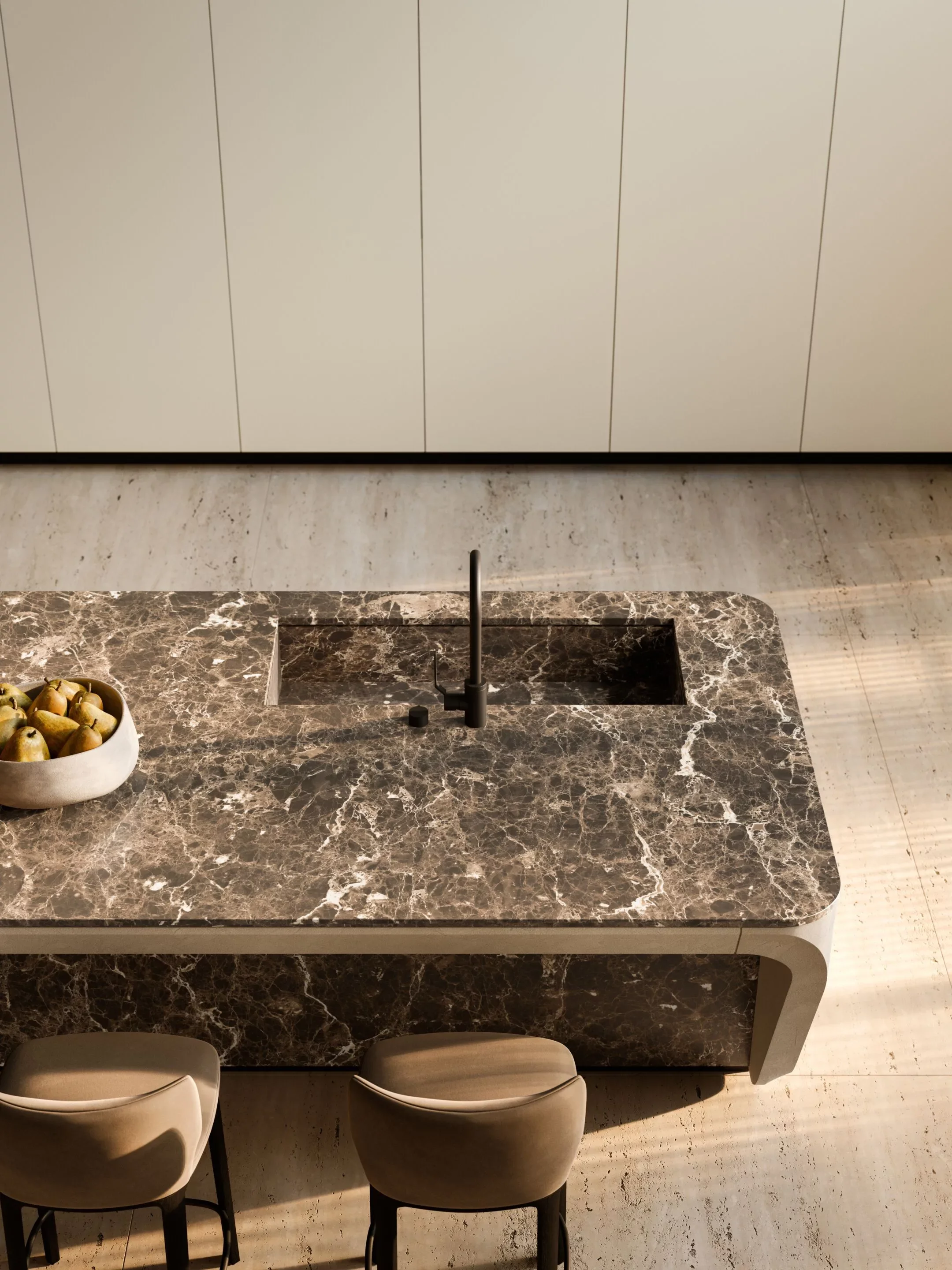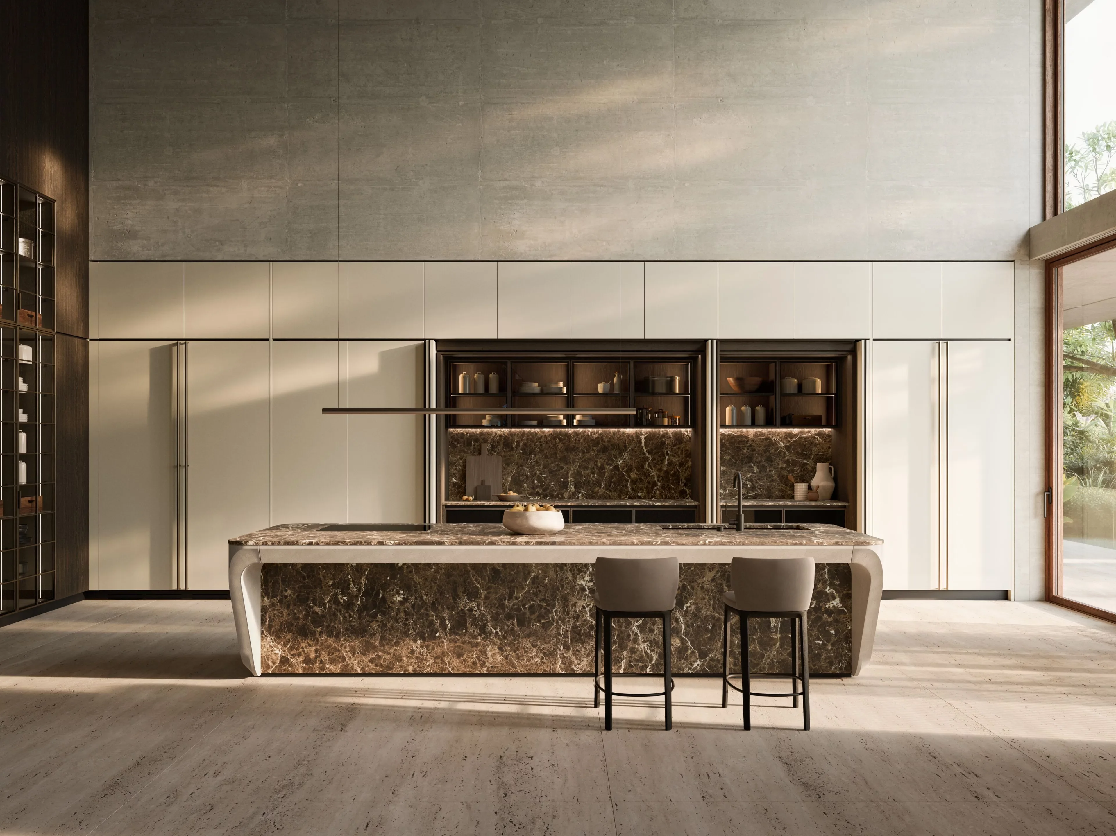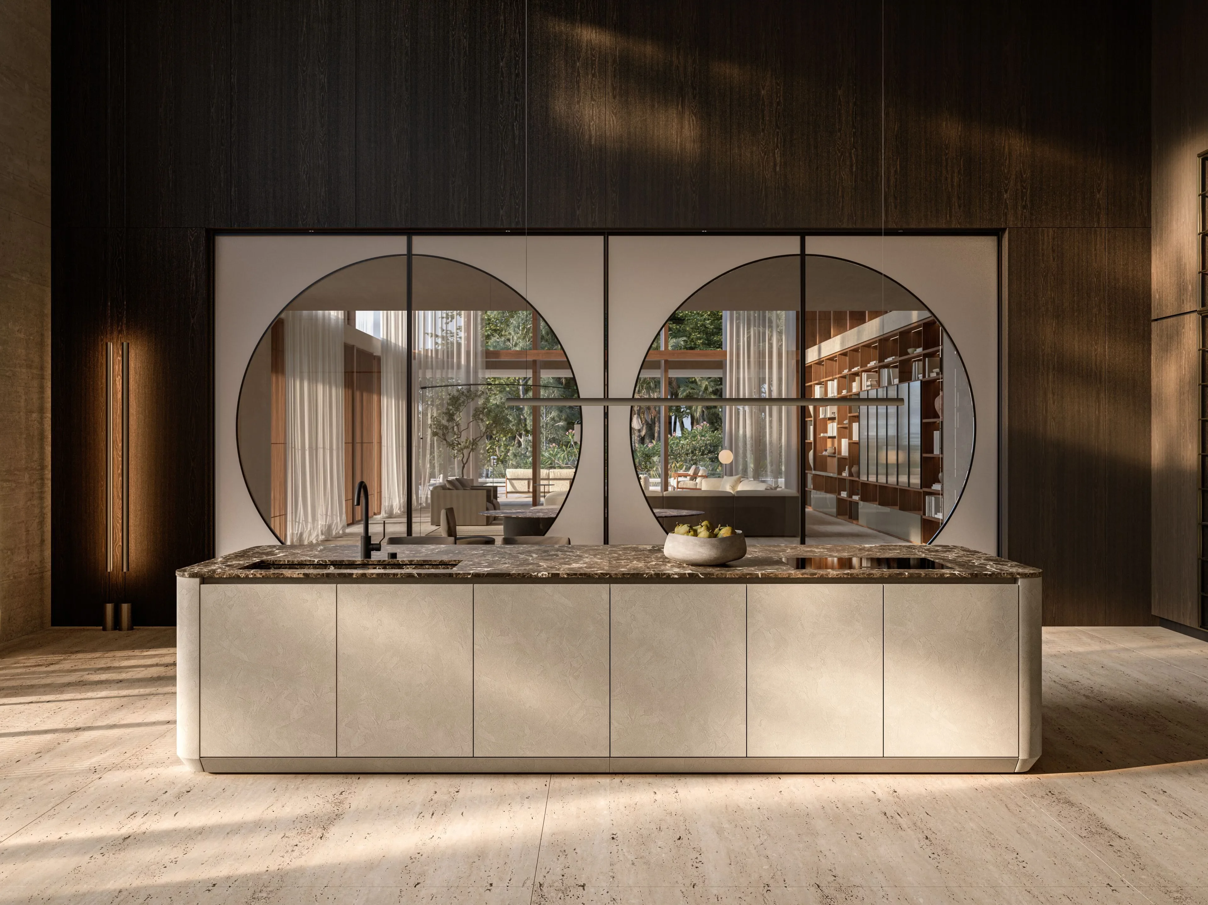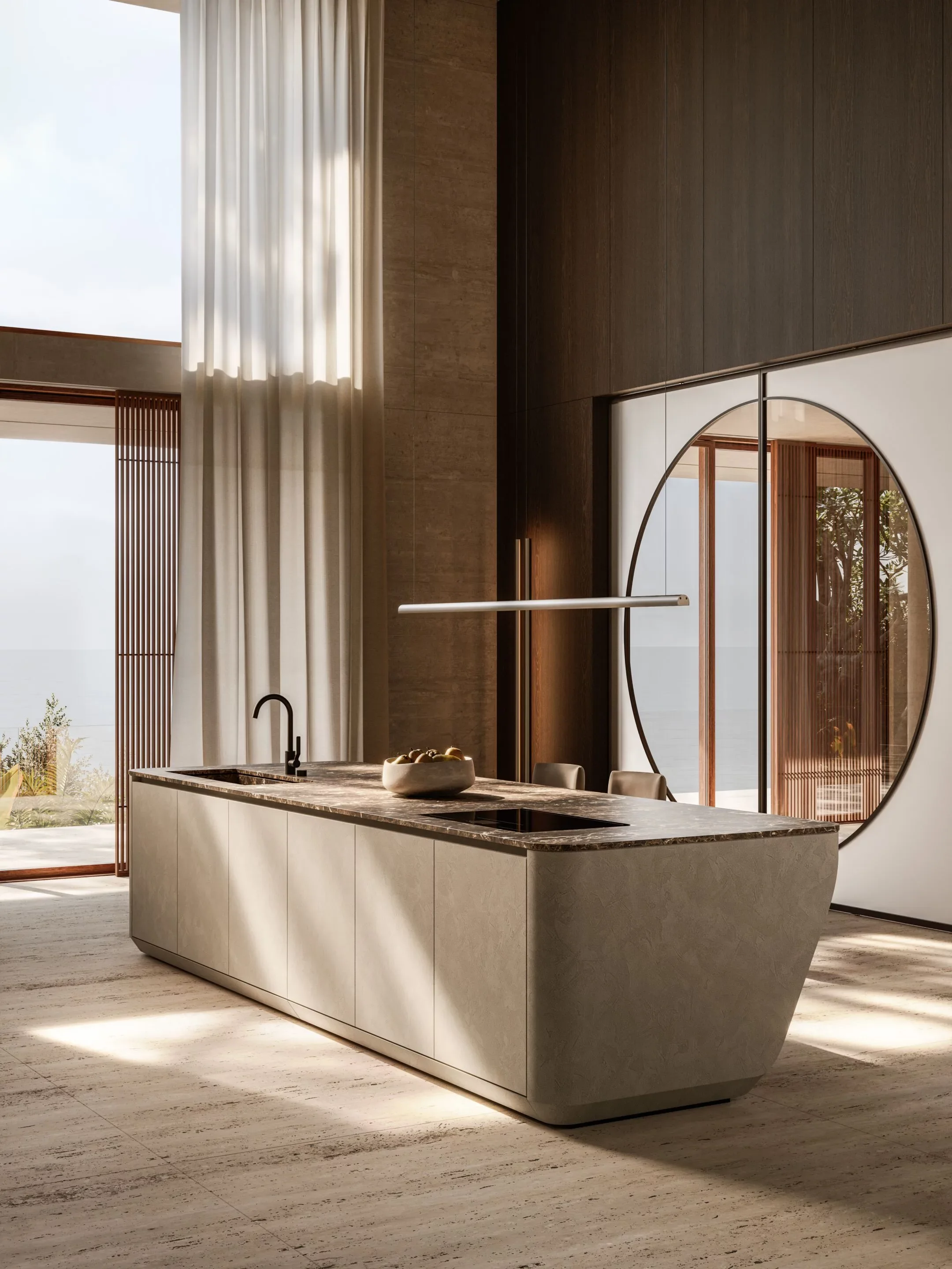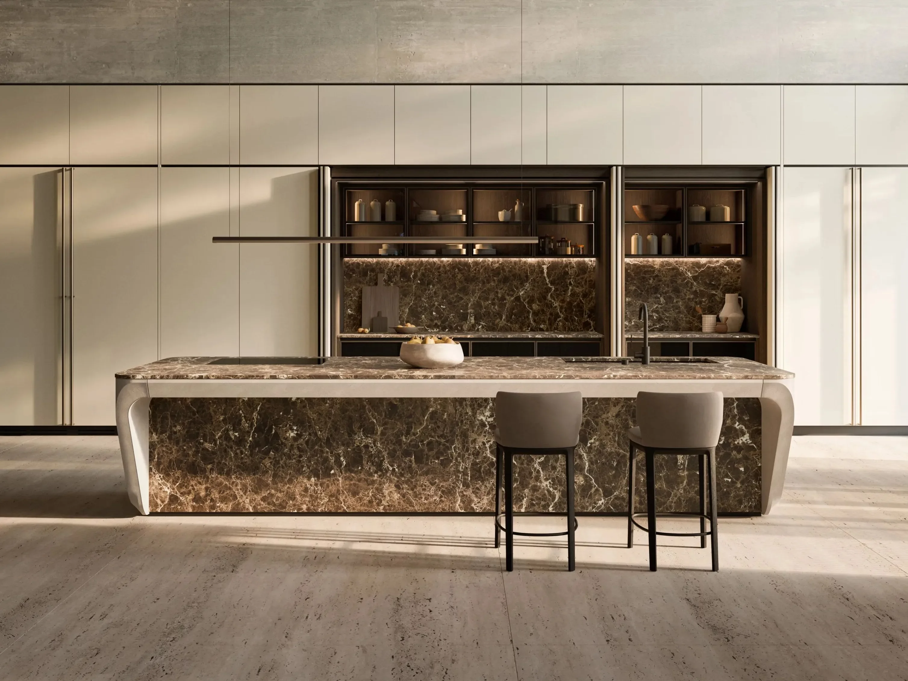 С момента своего дебюта в 2017 году Cove стала символом дизайнерской смелости. В 2024 году она получила новое прочтение в честь 90-летия Boffi, а в 2025 году выходит на новый уровень — с эксклюзивными отделками фасадов и столешниц, а также с эффектной удлинённой барной стойкой, расположенной на тыльной стороне.