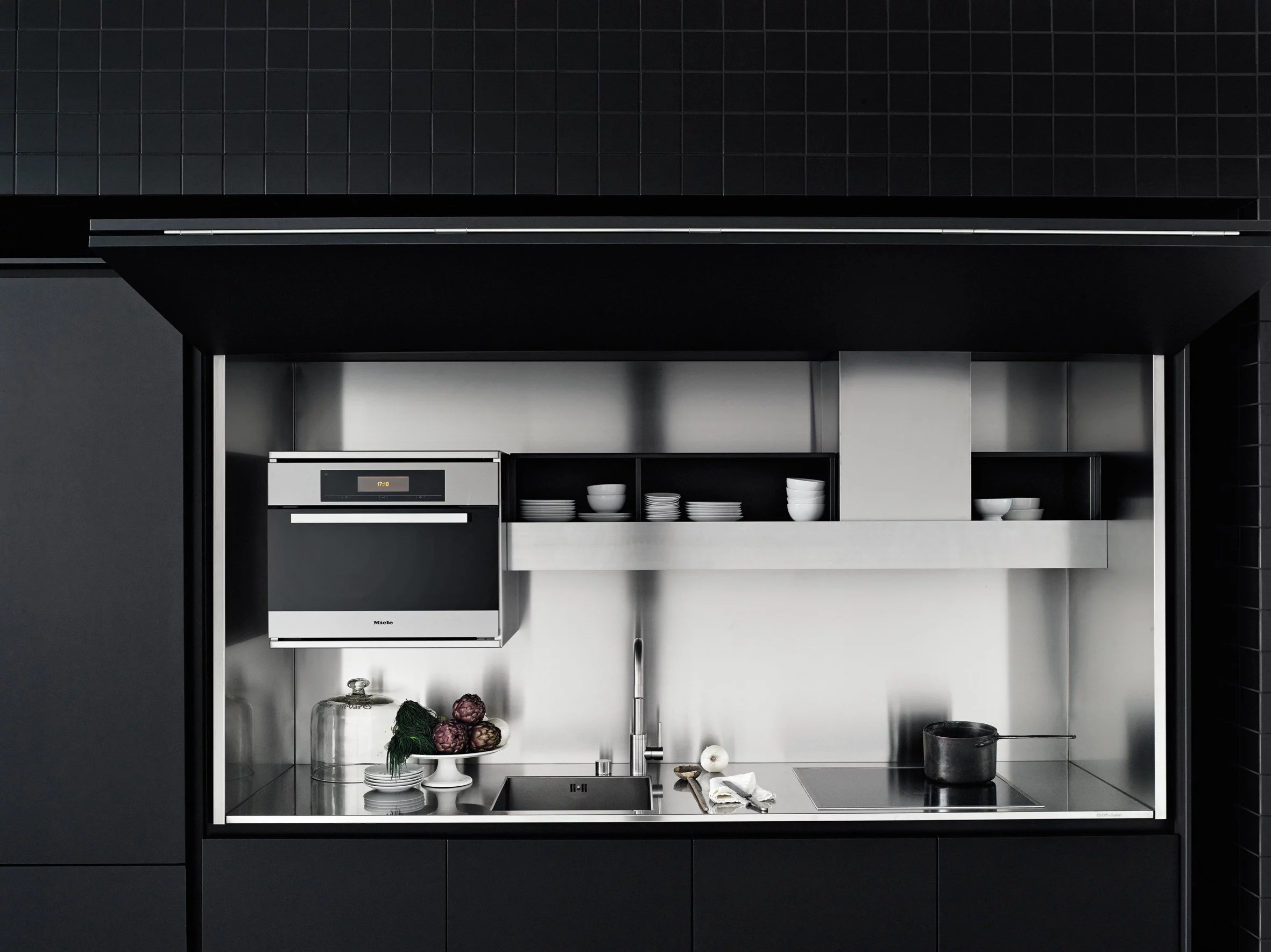 Вертикальные и горизонтальные фасады имеют шарнирную конструкцию, благодаря которой они в открытом положении не мешают работать с приборами, скрытыми внутри. Подъемный фасад в виде горизонтальной «гармошки» открывает рабочую столешницу с врезанными в нее раковиной и варочной поверхностью. Здесь же смонтированы вытяжка и микроволновка, выполненные в общем дизайне.