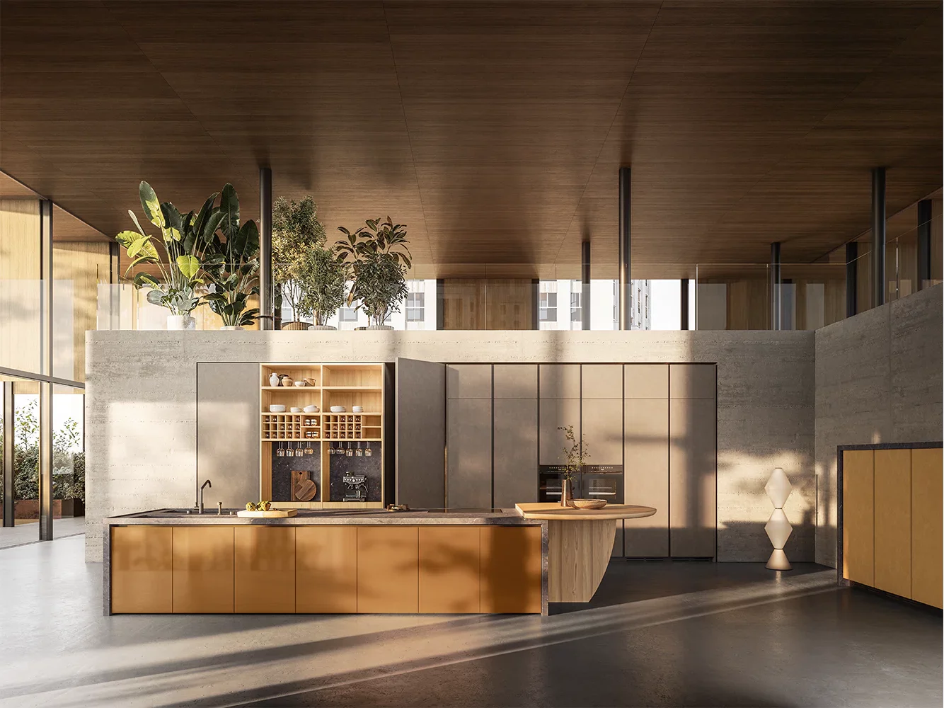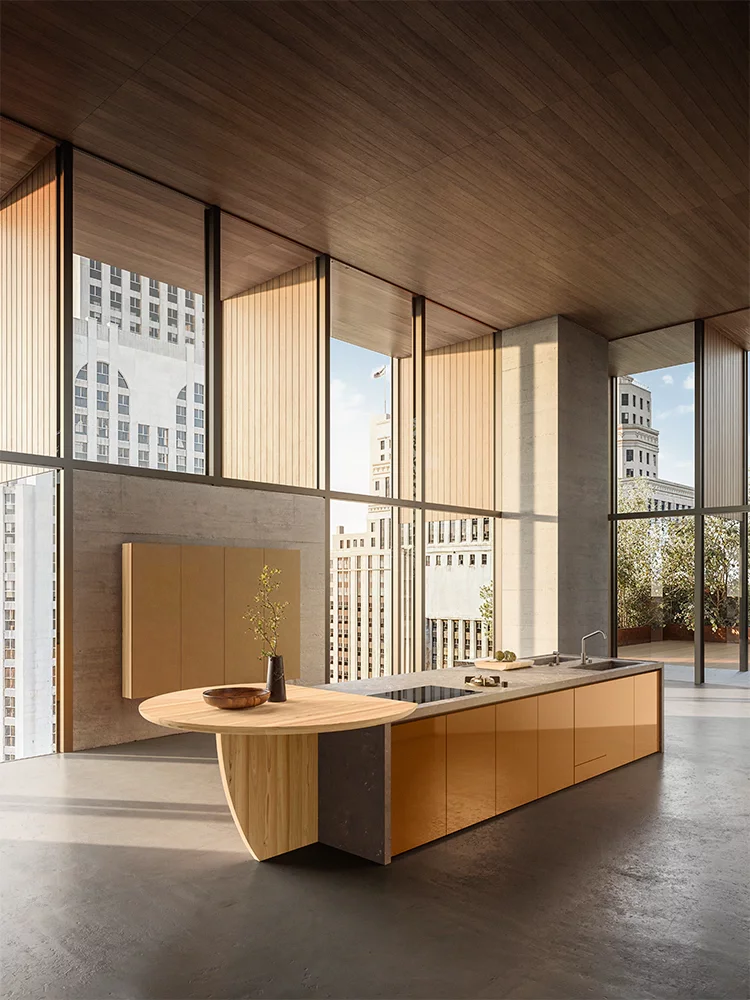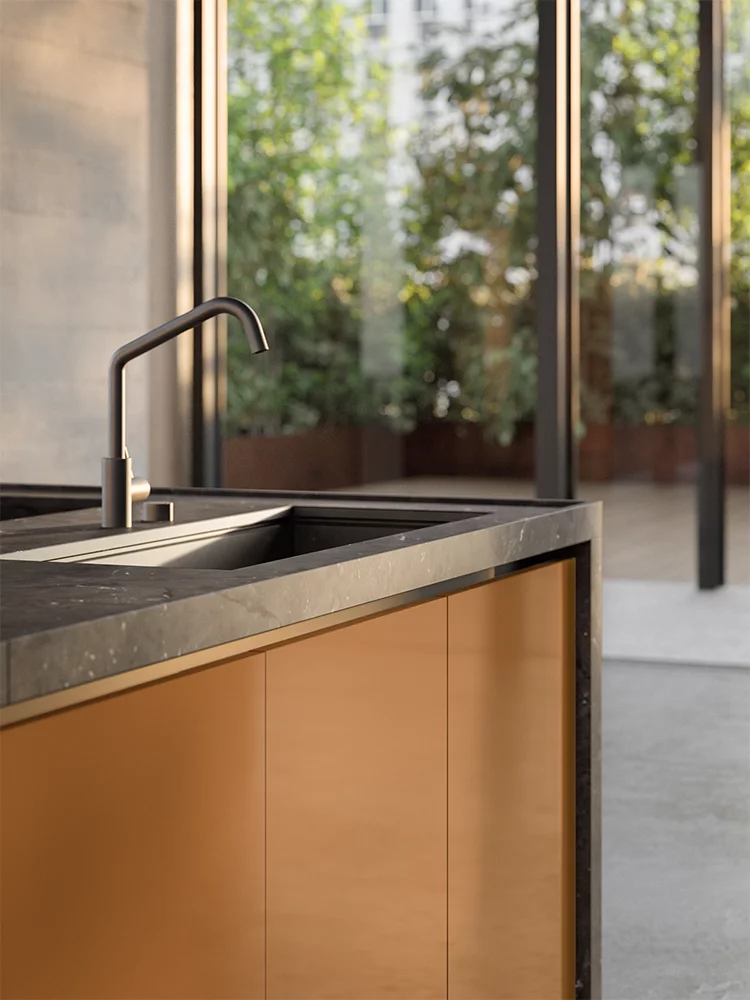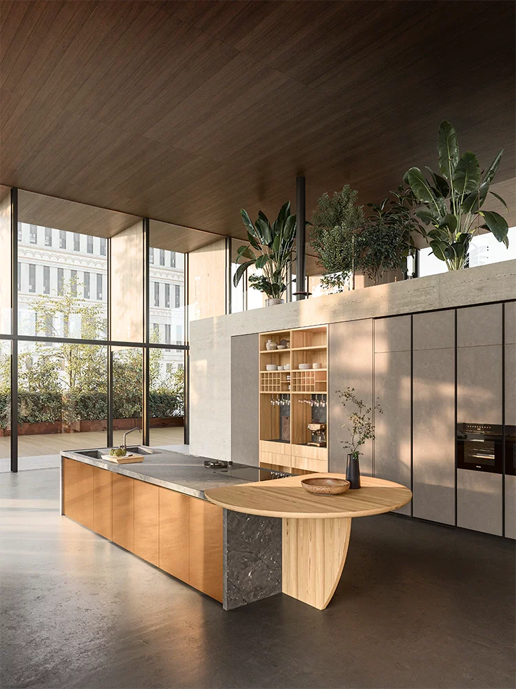 Элиза Оссино воплотила новый проект, назвав его в честь знаменитой кухни Xila, созданной Луиджи Массони в 1972 году. В этом дизайне она сочетает строгие линии и изящные края, придавая кухне особый характер. Толстая столешница из камня Breccia Imperiale создает впечатление глубокой мойки, где располагаются две раковины и поддон с узорами, отражающими геометрические формы, близкие дизайнеру. Верхняя и боковые панели становятся изысканным тактильным порталом, выступая на три сантиметра и украшая безручечные двери, которые впервые касаются пола, не достигая двух сантиметров до него. Несмотря на столь продуманный дизайн, функциональность и общение не упускаются из виду - в кухне предусмотрен полуостров из массива дерева, обработанного маслом, с круглой формой столешницы и скульптурной кривизной основания.