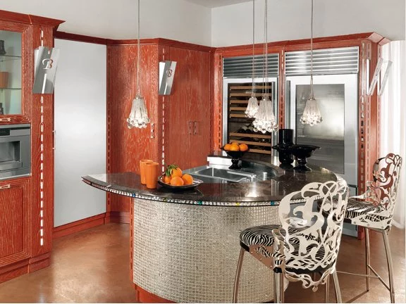 Кухня Diamond в стиле арт-деко является настоящей сценой для шеф-поваров, которые в полной мере смогут выразить здесь свою страсть и индивидуальность. Функциональный остров, как жемчужина эстетики и эргономики, окружен полукруглой рабочей областью со встроенной бытовой техникой и аксессуарами. Элитная бытовая техника Kuppersbusch или Gaggenau идеально подойдет кухне Diamond от итальянской фабрики Brummel Cucine.