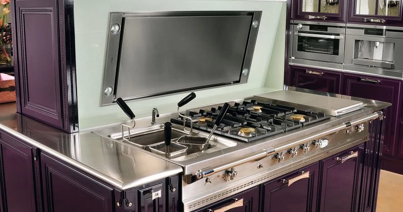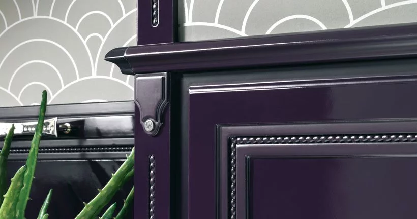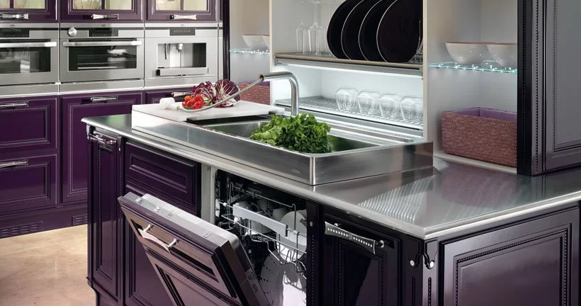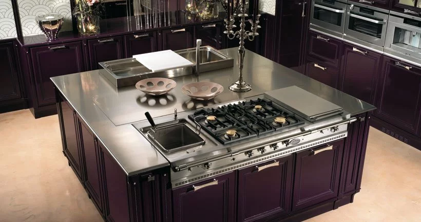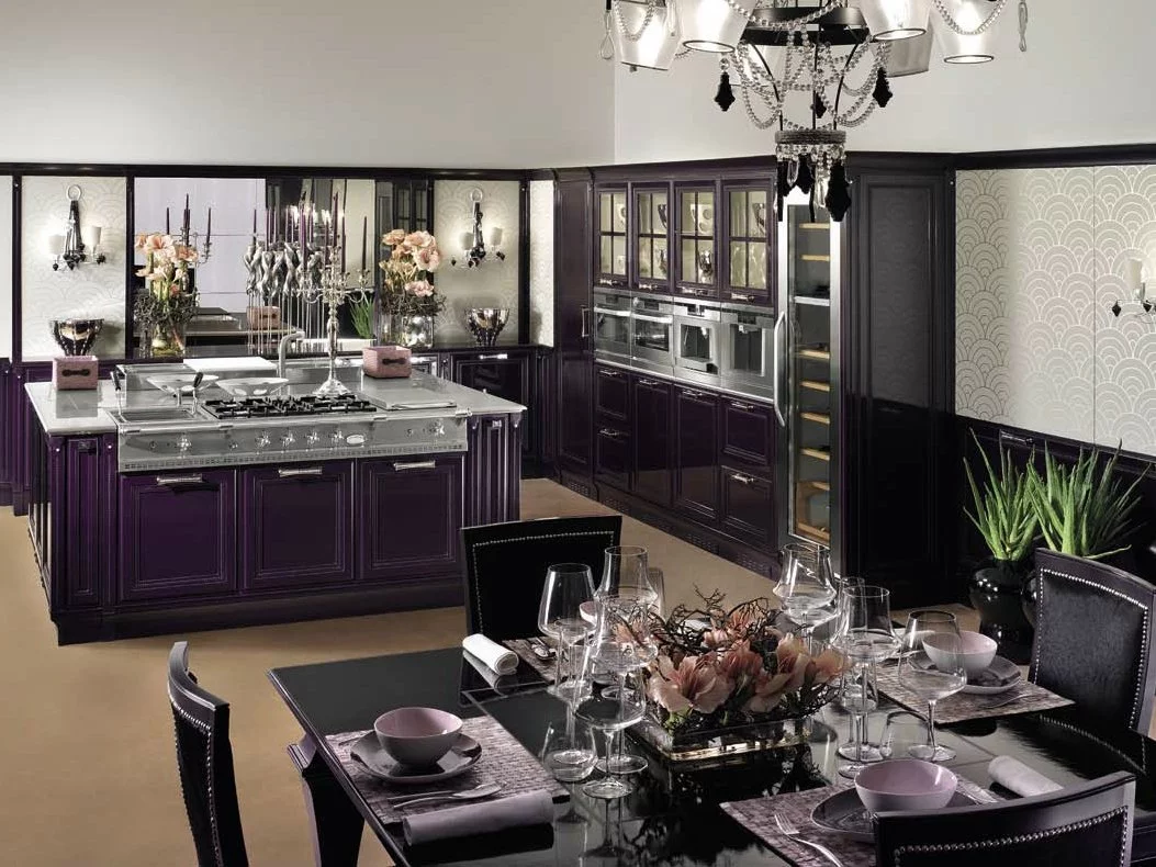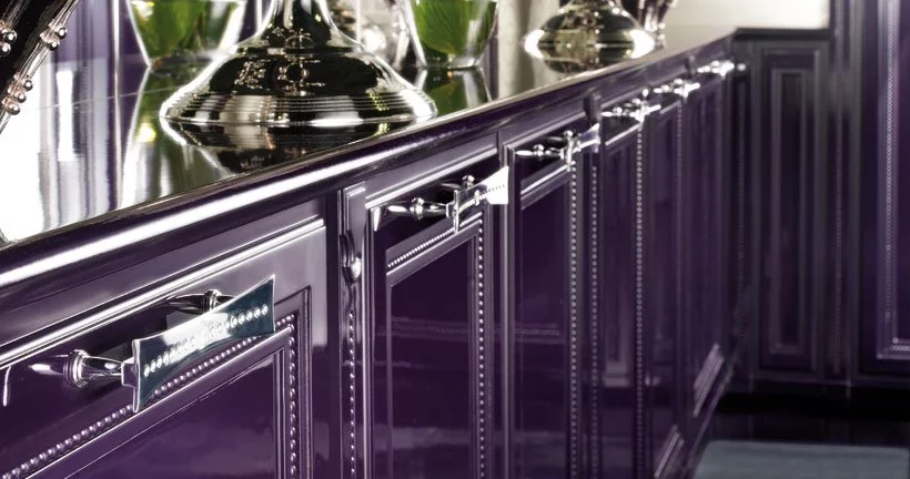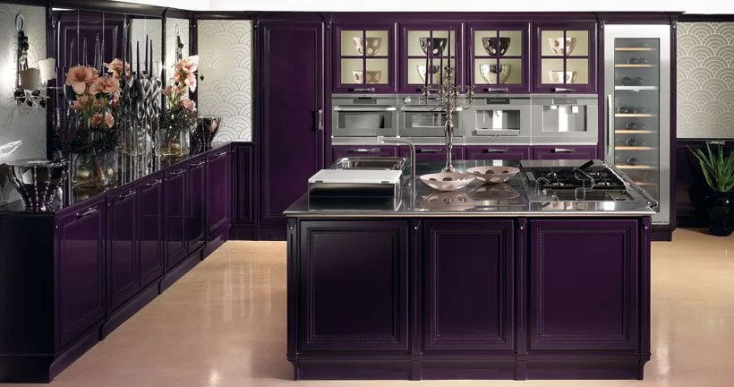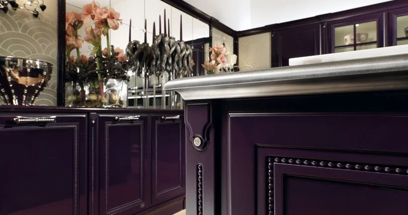 Фасады из массива дуба покрыты лаком Bianco Cipro фиолетового цвета. Необычная и функциональная стальная столешница с полировкой Scotch Bright оснащена плитой и мойкой. Центральная часть столешницы выдвигается бесшумно.