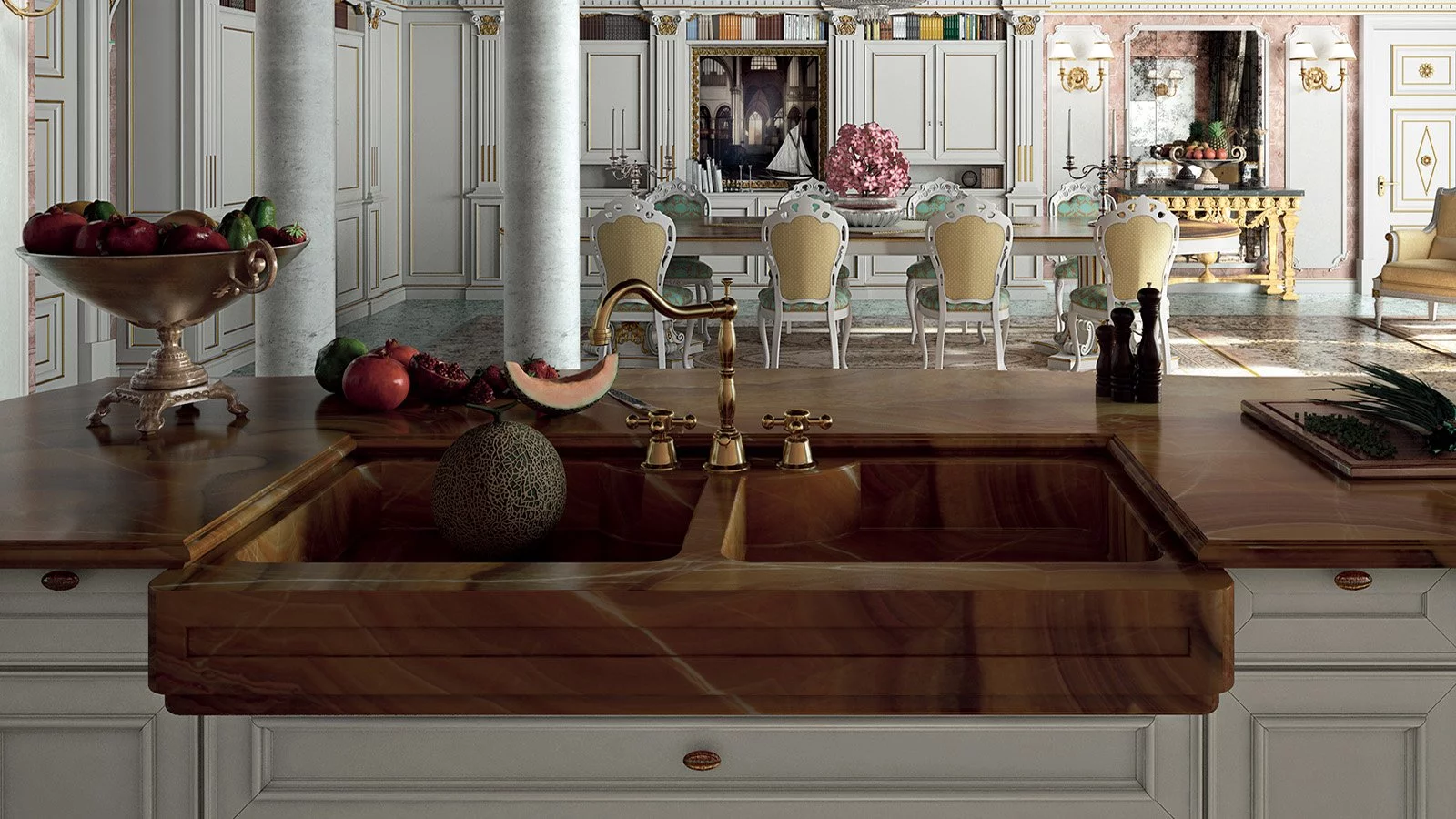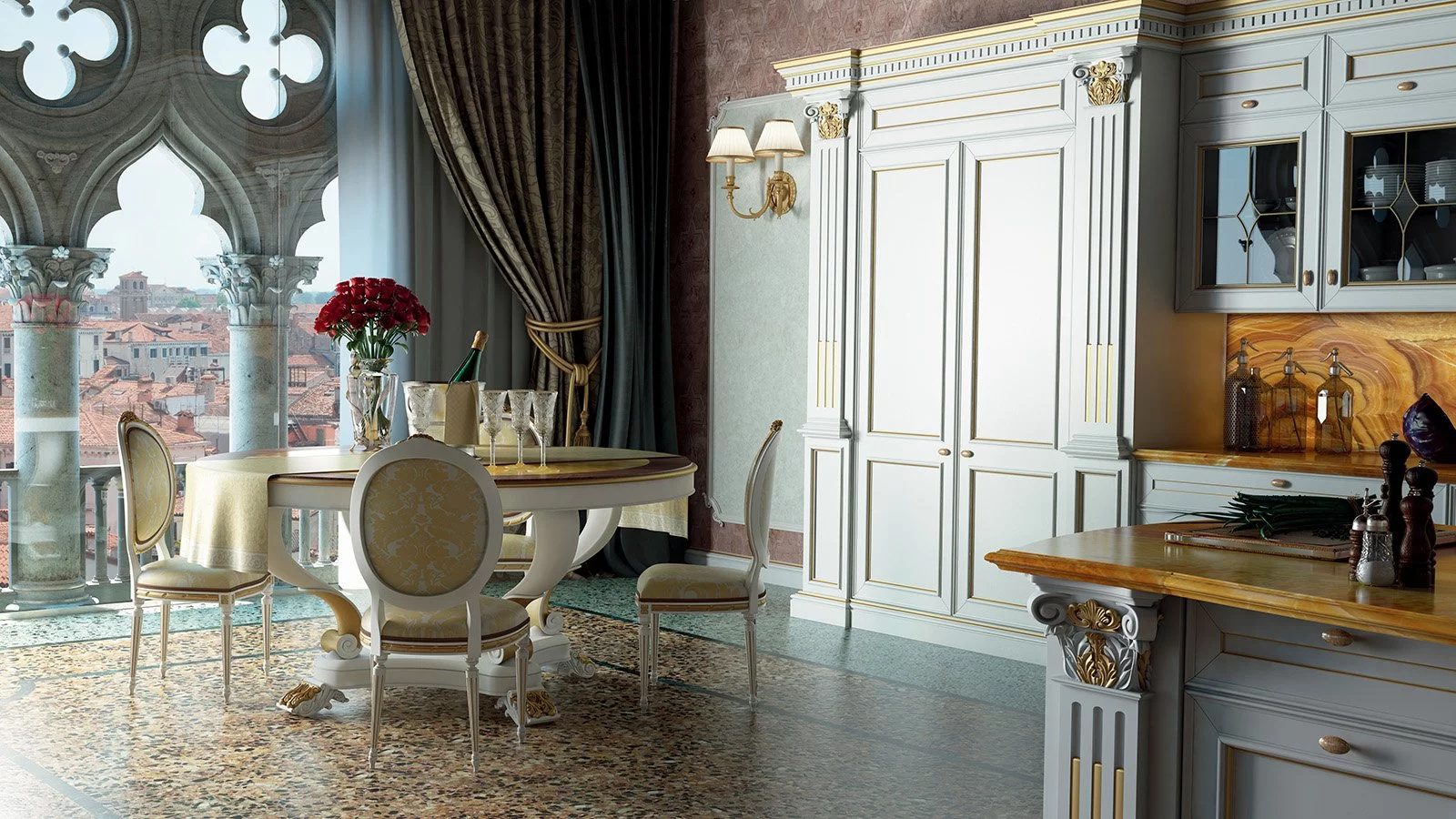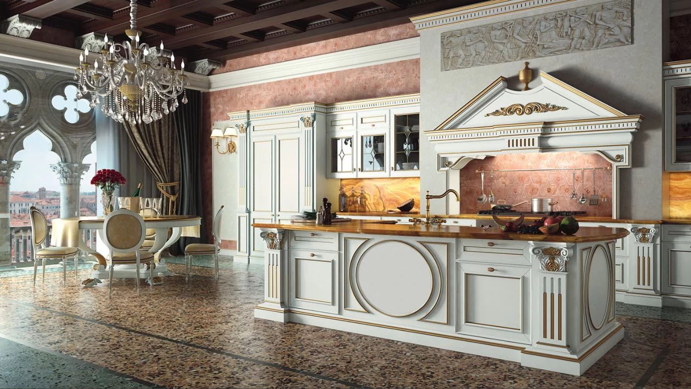 Canal Grande — классическая кухня, ставшая настоящим шедевром итальянской фабрики Ca' d'Oro. Изделие покорит вас своим изысканным внешним видом, получившимся в результате искусной ручной отделки, грамотно подобранных материалов и «умного» дизайна. Лаконичные формы модели дополняет изысканная резьба по дереву, античные колонны, накладные листовые элементы, а также утончённые пилястры.