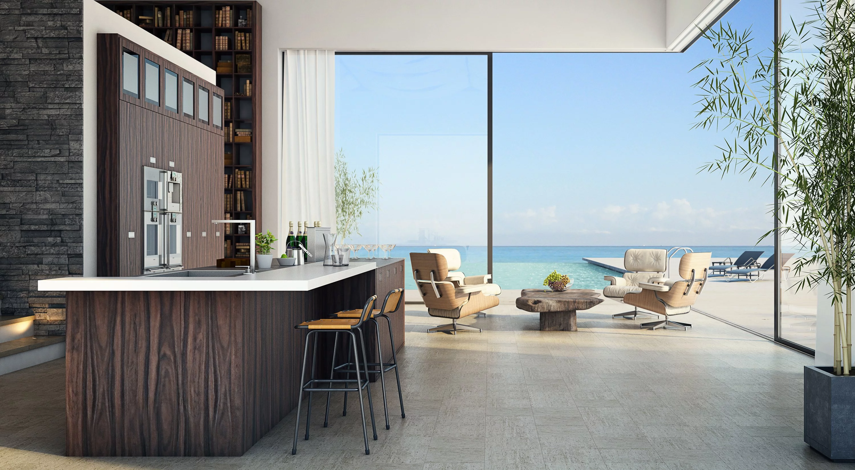 Раковина и индукционная плита располагаются на большом кухонном острове. Вытяжка умело и аккуратно скрыта и появляется только при её эксплуатации. Рабочая зона выполнена из двух материалов: из 15 миллиметровой нержавеющей стали и дерева. Фасады модульных элементов представлены матовым лакированным палисандром, открывающиеся при желании с помощью пульта дистанционного управления.